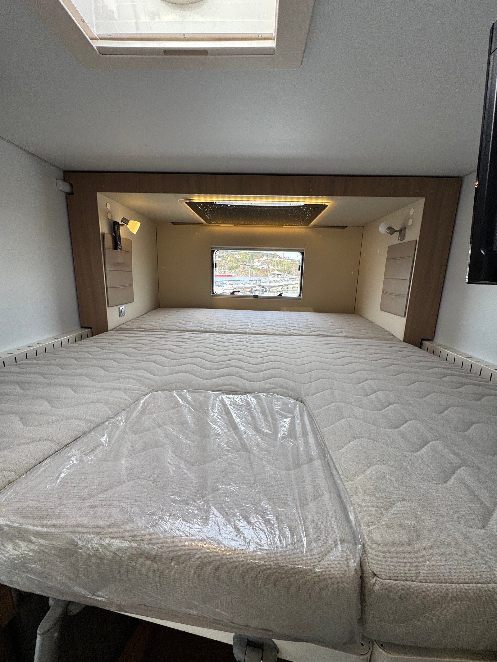 En meget smart planløsning hvor bilen opprinnelig er 599cm lang, men seng kan enkelt skyves ut elektrisk helt bakerst (12v) se bilde. Bilen er kun 212 cm bred og kan kjøres på klasse B sertifikat.