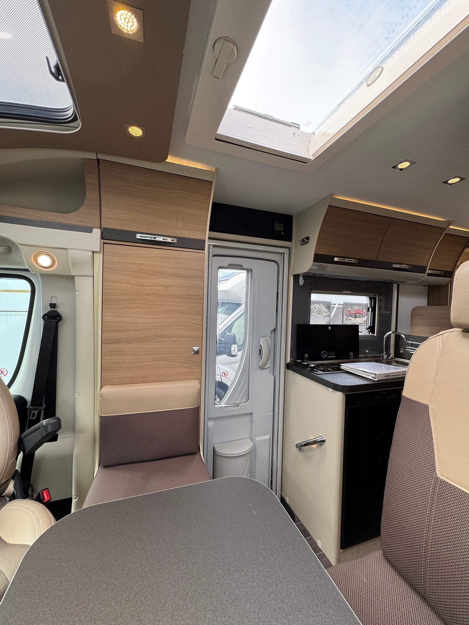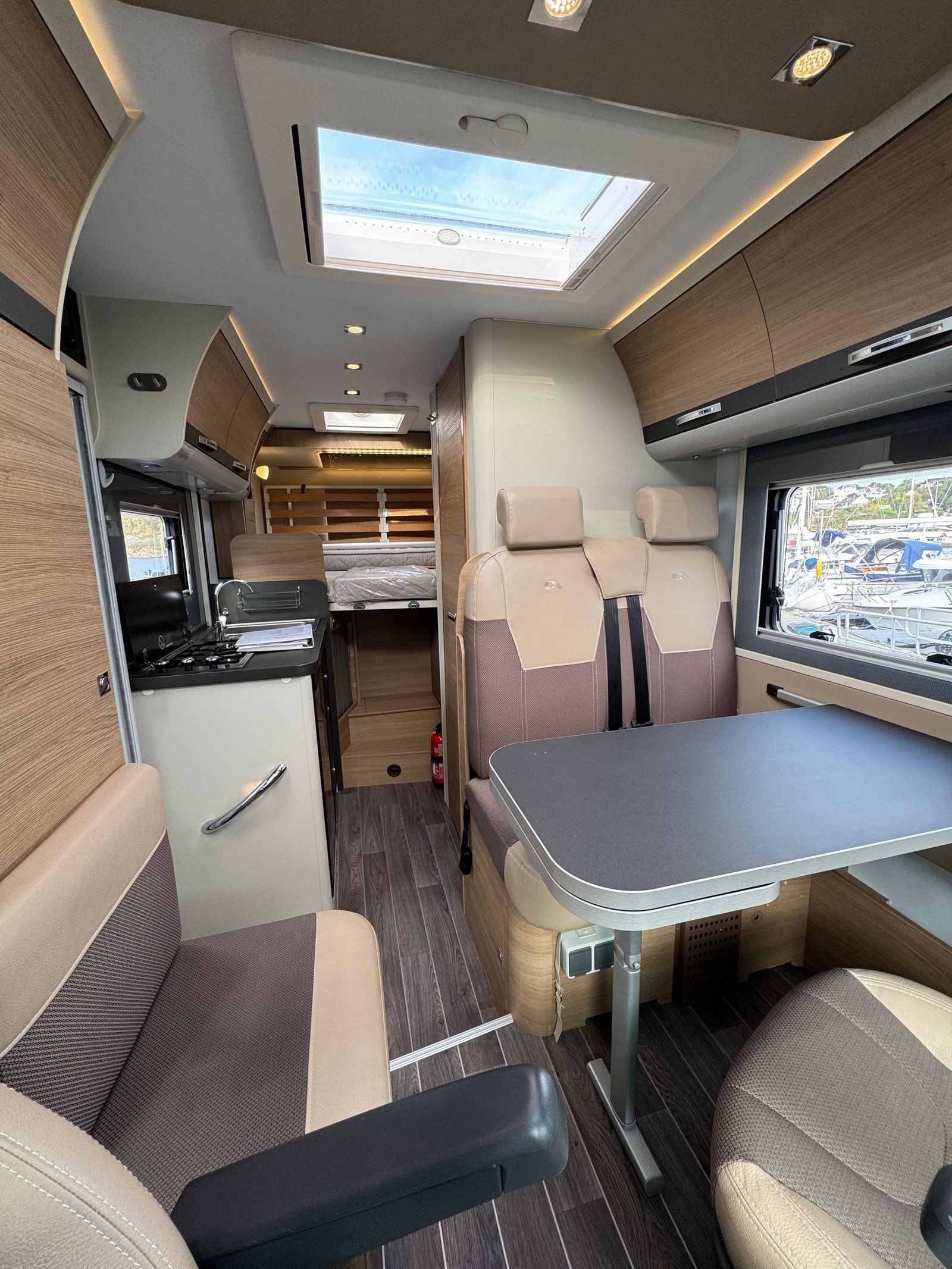 En meget smart planløsning hvor bilen opprinnelig er 599cm lang, men seng kan enkelt skyves ut elektrisk helt bakerst (12v) se bilde. Bilen er kun 212 cm bred og kan kjøres på klasse B sertifikat.