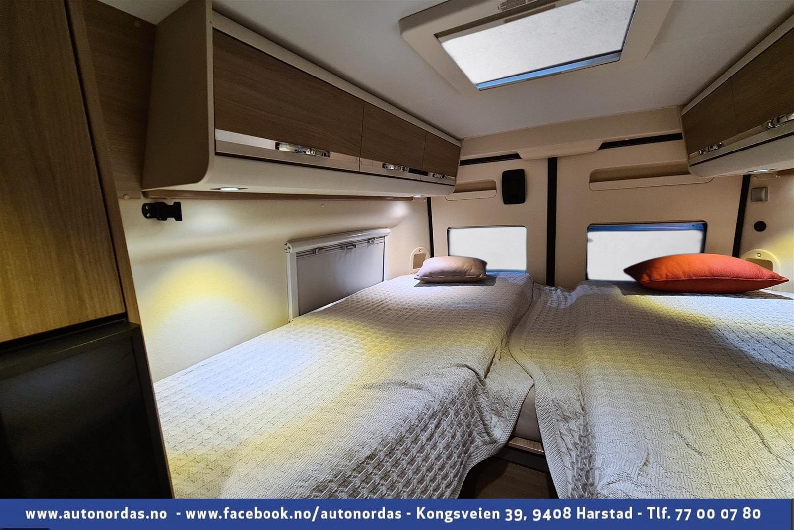 Bobilen har to store langsgående senger bak og et smart baderom med dusjmulighet.
