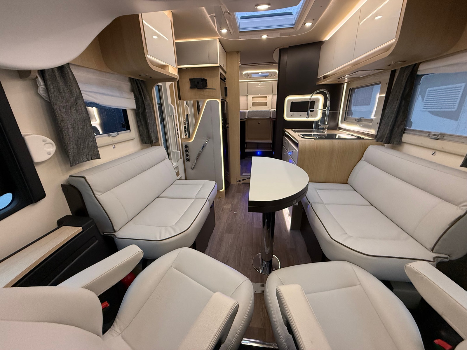 Nyt et elegant interiør med helskinn og en romslig face-to-face sittegruppe som skaper en åpen og sosial atmosfære. Interiøret er lyst og moderne med stemningsfull LED-belysning.