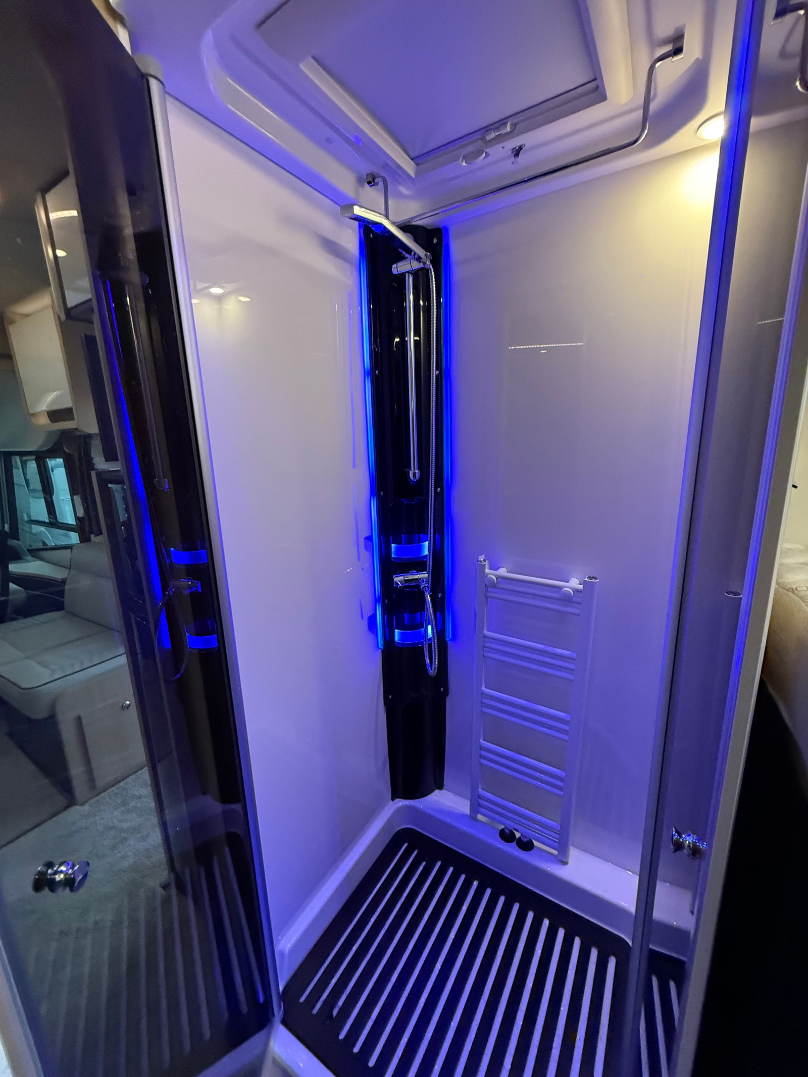 Baderom: Smart løsning med separat dusjkabinett og toalettrom som kan skjermes fra resten av bilen.