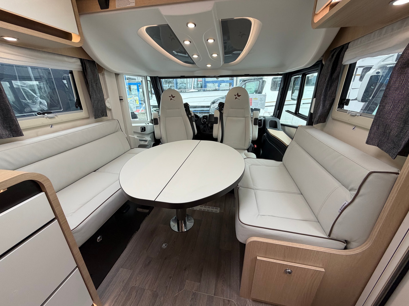 "Face to Face" løsningen ved salong gjør at du får en meget romslig sittegruppe, spesielt siden salongbord er foldbart. passasjer 3 og 4 vil også sitte behagelig under kjøring ved denne type løsning. Disse ligger skjult i salong når de ikke er i bruk.Takseng i front kan være nede uten at det går utover salong.