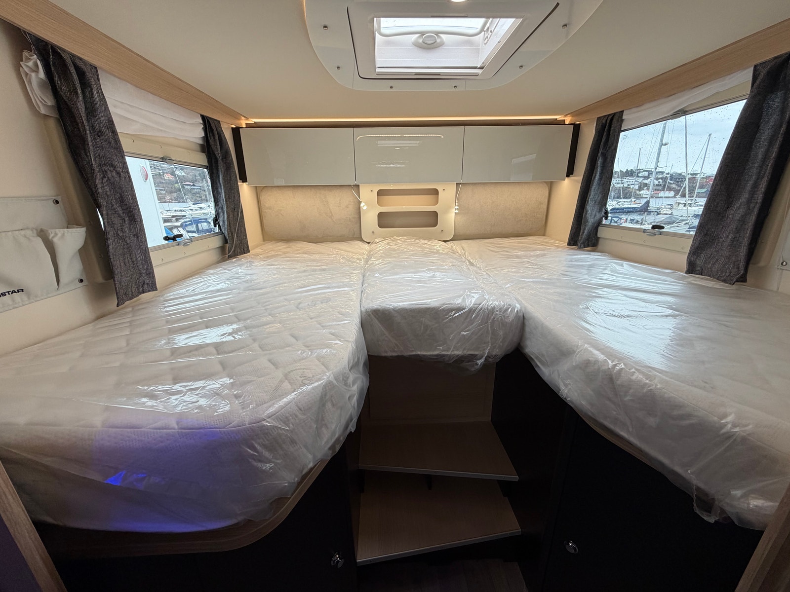Et lekkert og romslig soverom med to enkle senger. Fine lysdetaljer. Godt med lagringsplass under og over seng. Skyvedør frem mot bad. TV feste, flere ladepunkter for mobil, og aldepanel for styring av varme og varmtvann er også plassert