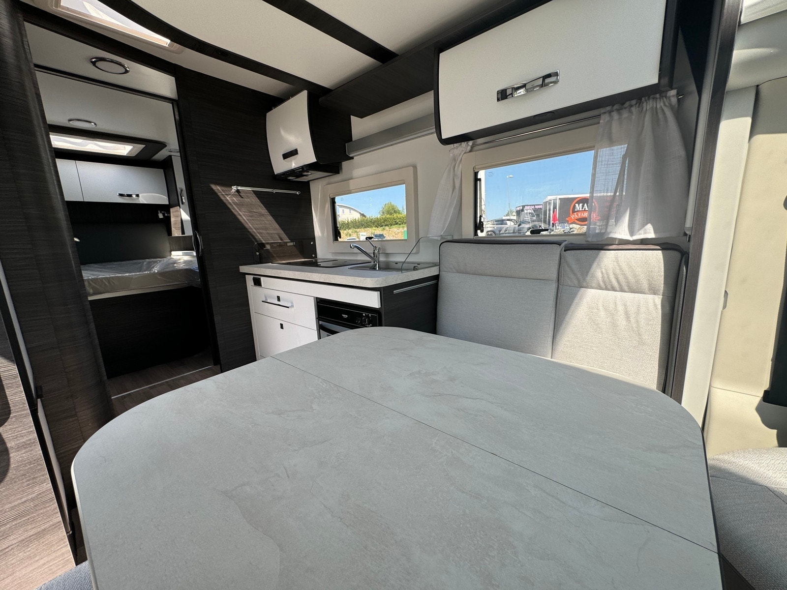 STERKE SIDER Stue med ansikt til ansikt sofaer og sammenleggbare bord Senkeseng (230kg max) Stor AES kjøleskap (140l) med separate 9 flaskers (1.5l) oppbevaring Dør mellom soverom og salong Qeensbed (150 cm) – Midtstilt seng Baderom med separat dusj Romslig garasje med 2 dører og bilstil på låsene Mer detaljer info om bobilen: – Full poliester karosseri – Sidevegger og tak uten treverk, ikke mulighet for å råtne – 100% forsterket polyester bildel overgang – Panorama takluke med myggnett og formørkelse (71x105cm) – Vindu med dobbelt glass Dometic D-Lux – Inngangsdør med 2 låser, vindu, myggnett og søppelbøtte – Bakfanger med LED lys – Nye dørlåser I “bilstil” på bodelsluker – LED lys – Soft close skuffer – Avtagbare putetrekk – Skilledør mellom soverom og sittegruppe – Elektrisk senkeseng framme (230kg maks) – Høyderegulerbar seng bak (manuell) – Skuffer under bakre seng – TV feste – Vask og 3 kokebluss med elektrisk tenning – Stort kjøleskap på 140l med separat del til 9×1,5l flasker – Separat dusj med oppbevaringsboks og håndklestang – Truma combi gas 4000W – Elektrisk vindu – Sentral lås med fjernkontroll – ABS + ESP – Cruise control – Aircondition bildel – Sjåfør + passasjer airbag – Skinn ratt – Dybde og høyde regulerbart ratt – Girspak i skinn – Radio med USB, aux og blåtann styres ved rattet – Multifunskjonsratt med radio styring – Liggende svingbare kapteinstoler med 2 armlener og høydejustering – Setetrekk likt resten av bodelen også framme – Førerstoler med regulerbar korsryggstøtte