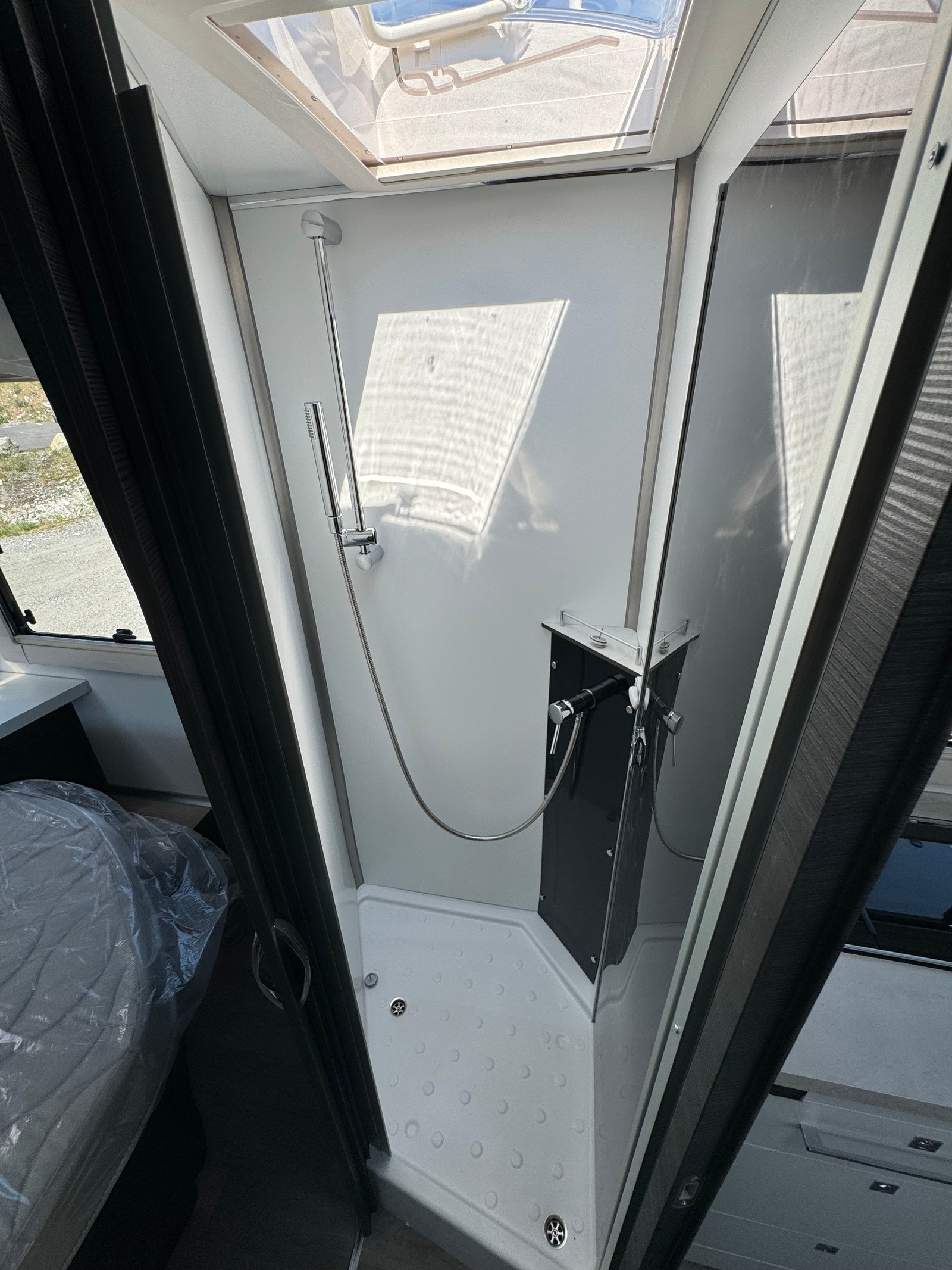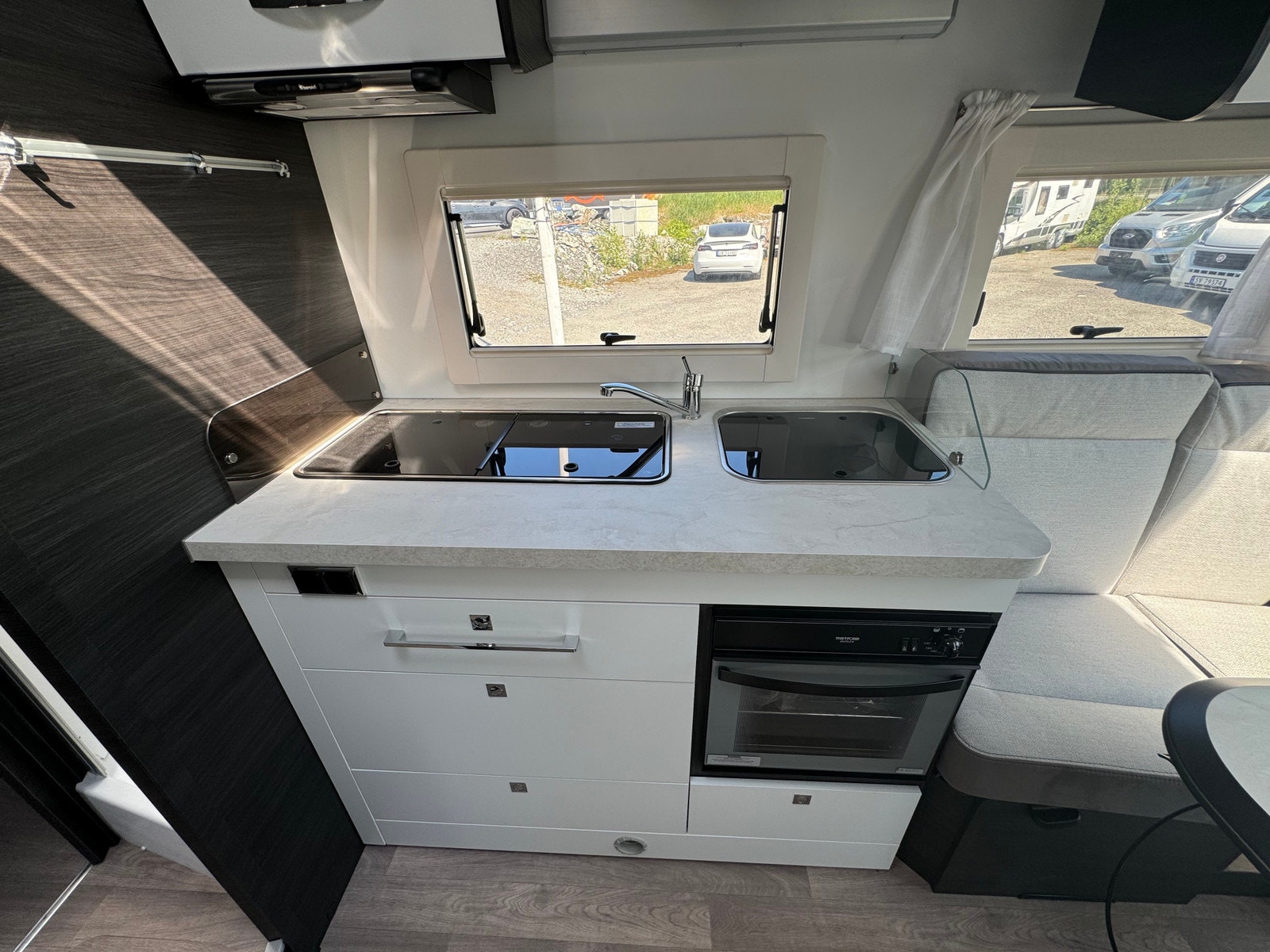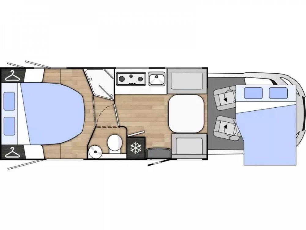 STERKE SIDER Stue med ansikt til ansikt sofaer og sammenleggbare bord Senkeseng (230kg max) Stor AES kjøleskap (140l) med separate 9 flaskers (1.5l) oppbevaring Dør mellom soverom og salong Qeensbed (150 cm) – Midtstilt seng Baderom med separat dusj Romslig garasje med 2 dører og bilstil på låsene Mer detaljer info om bobilen: – Full poliester karosseri – Sidevegger og tak uten treverk, ikke mulighet for å råtne – 100% forsterket polyester bildel overgang – Panorama takluke med myggnett og formørkelse (71x105cm) – Vindu med dobbelt glass Dometic D-Lux – Inngangsdør med 2 låser, vindu, myggnett og søppelbøtte – Bakfanger med LED lys – Nye dørlåser I “bilstil” på bodelsluker – LED lys – Soft close skuffer – Avtagbare putetrekk – Skilledør mellom soverom og sittegruppe – Elektrisk senkeseng framme (230kg maks) – Høyderegulerbar seng bak (manuell) – Skuffer under bakre seng – TV feste – Vask og 3 kokebluss med elektrisk tenning – Stort kjøleskap på 140l med separat del til 9×1,5l flasker – Separat dusj med oppbevaringsboks og håndklestang – Truma combi gas 4000W – Elektrisk vindu – Sentral lås med fjernkontroll – ABS + ESP – Cruise control – Aircondition bildel – Sjåfør + passasjer airbag – Skinn ratt – Dybde og høyde regulerbart ratt – Girspak i skinn – Radio med USB, aux og blåtann styres ved rattet – Multifunskjonsratt med radio styring – Liggende svingbare kapteinstoler med 2 armlener og høydejustering – Setetrekk likt resten av bodelen også framme – Førerstoler med regulerbar korsryggstøtte
