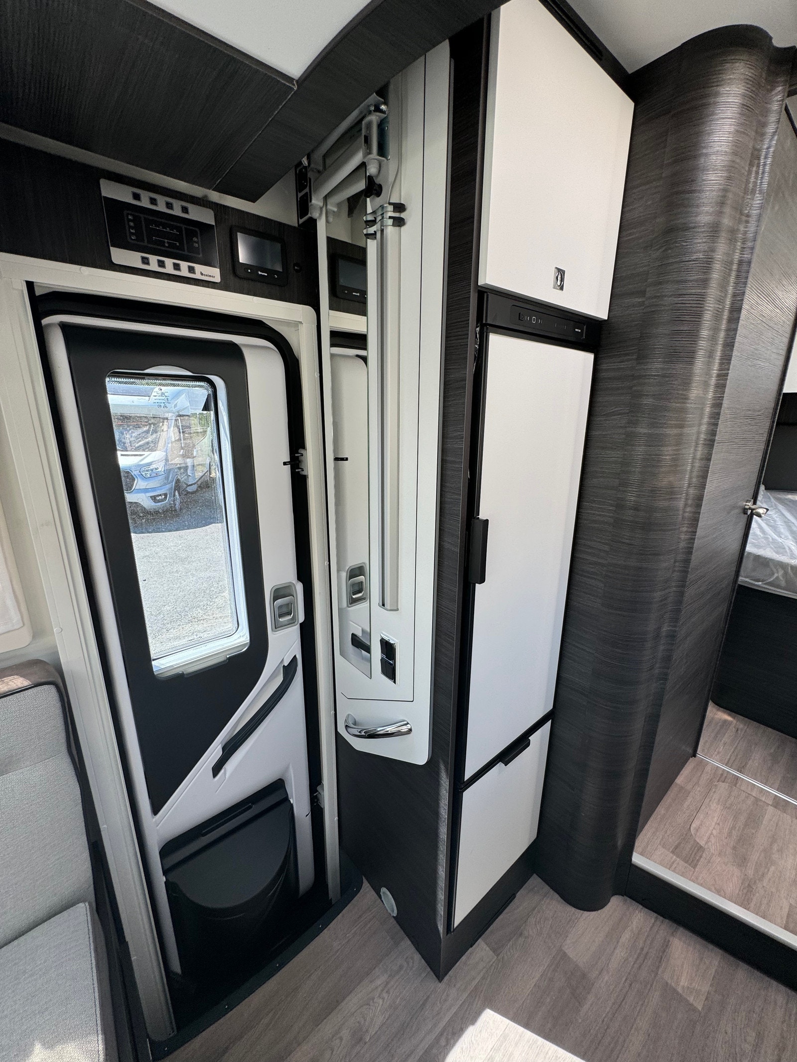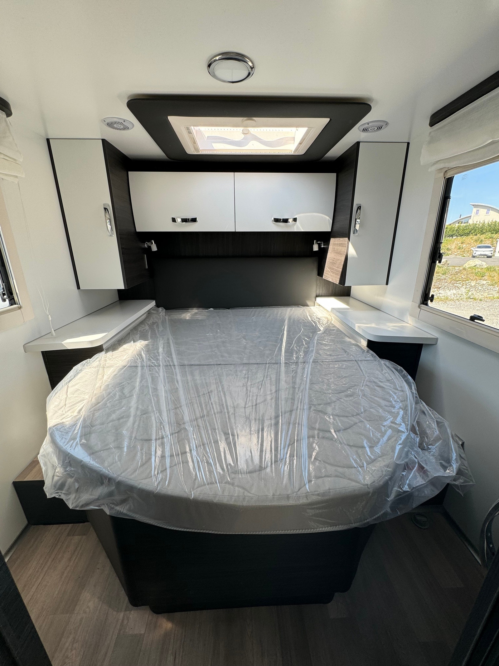 Bak er det midtstilt dobbelseng og godt med skapplass. Det er separert toalett og dusj og mulighet for å lukke igjen dør frem mot kjøkken. Det er også skyvedør fra soverom og inn mot bad/toalett. Perfekt bil for opptil 4 personer.
