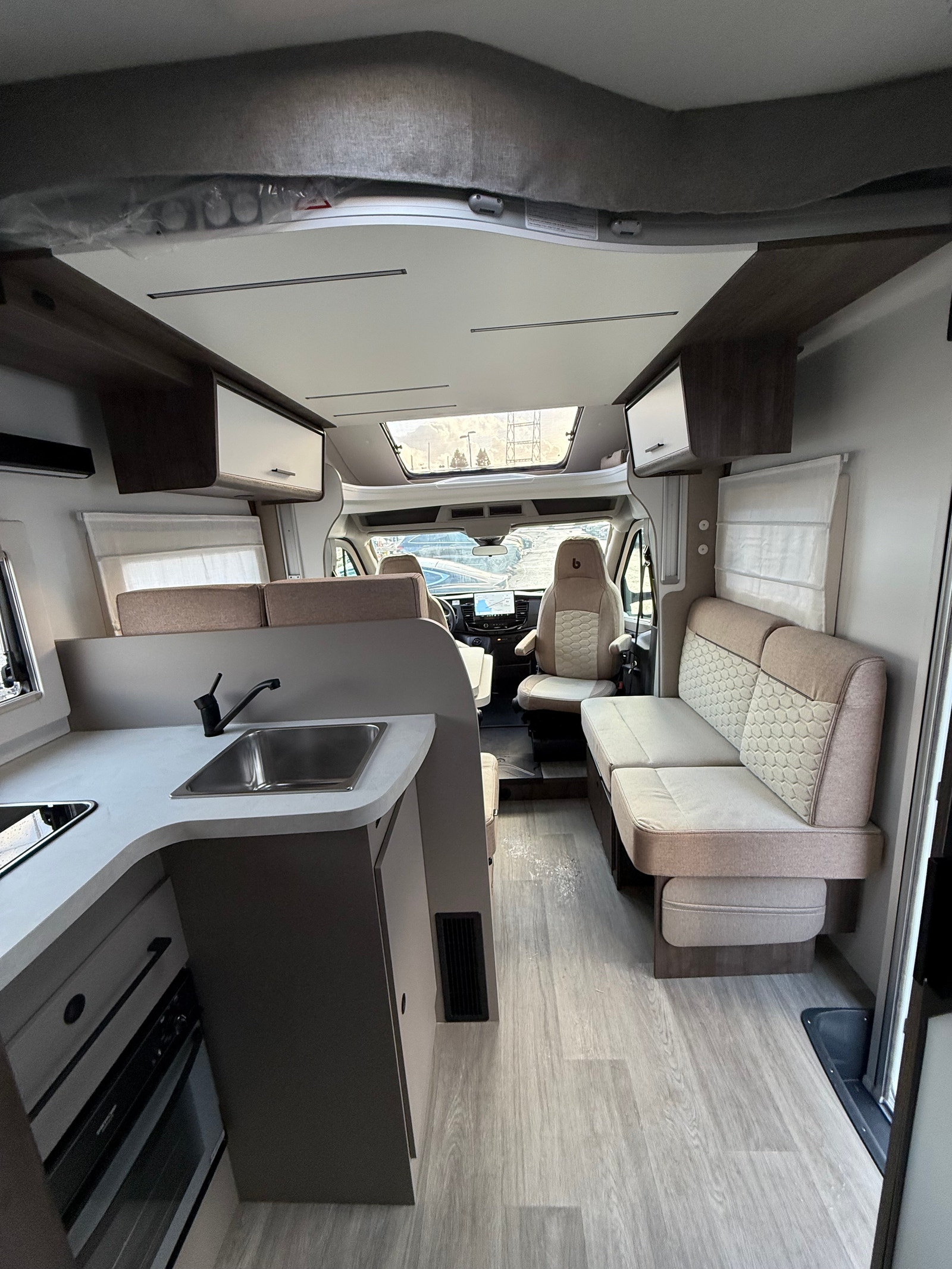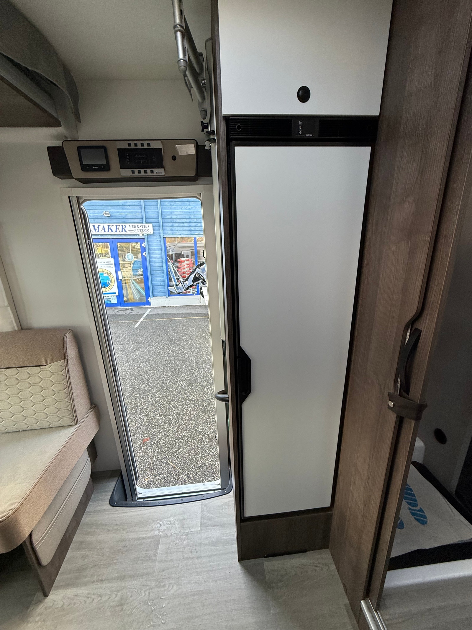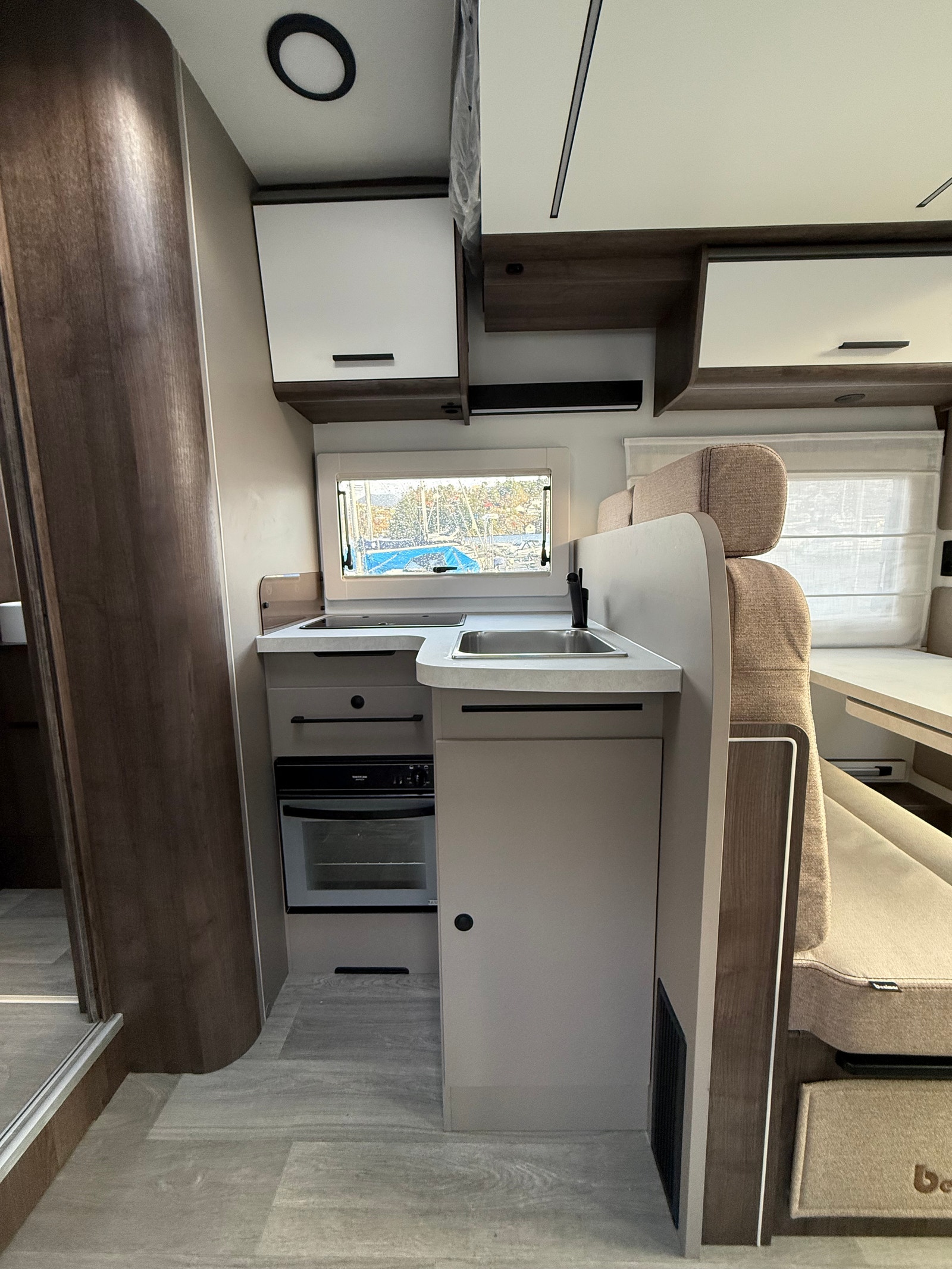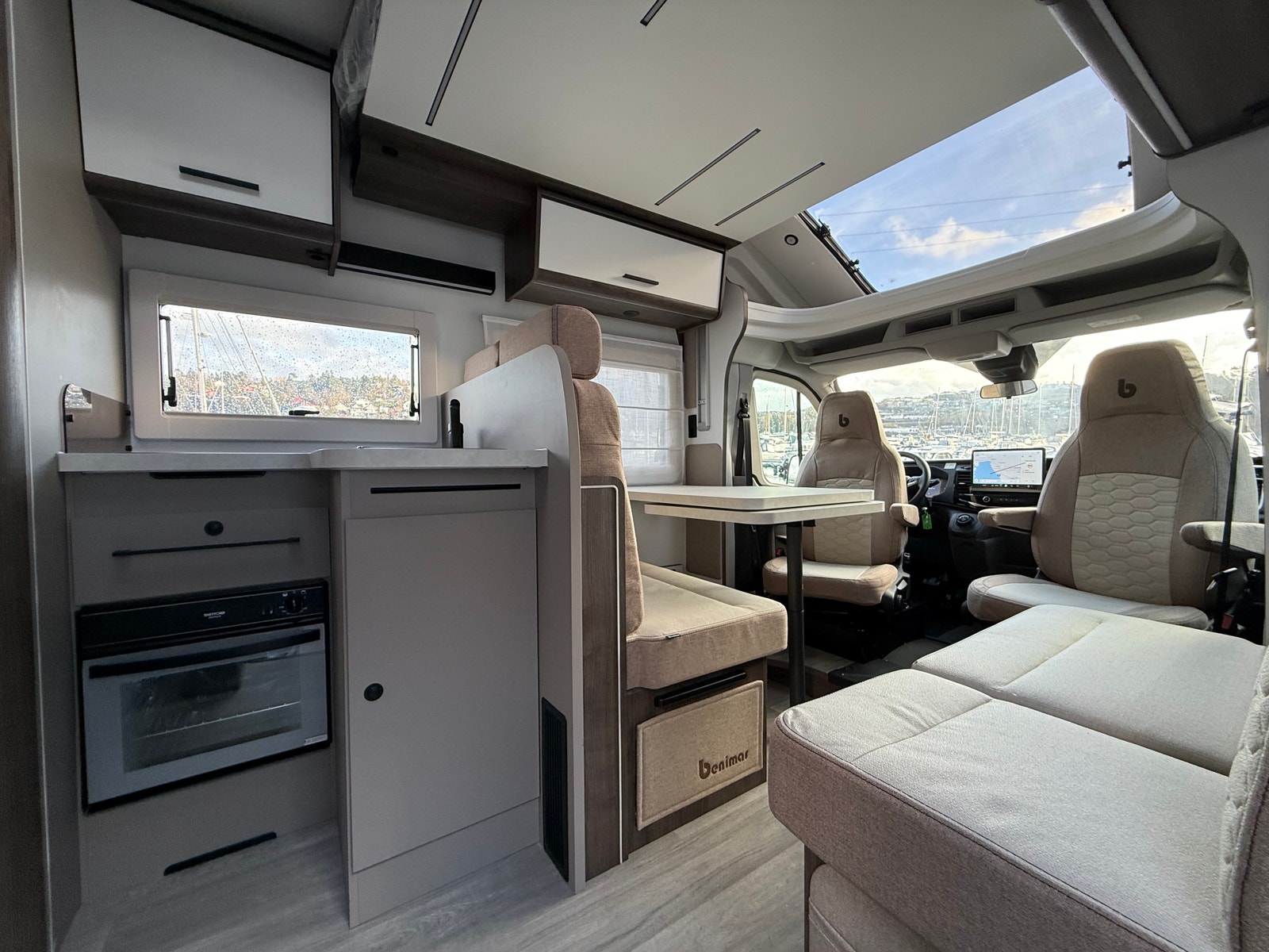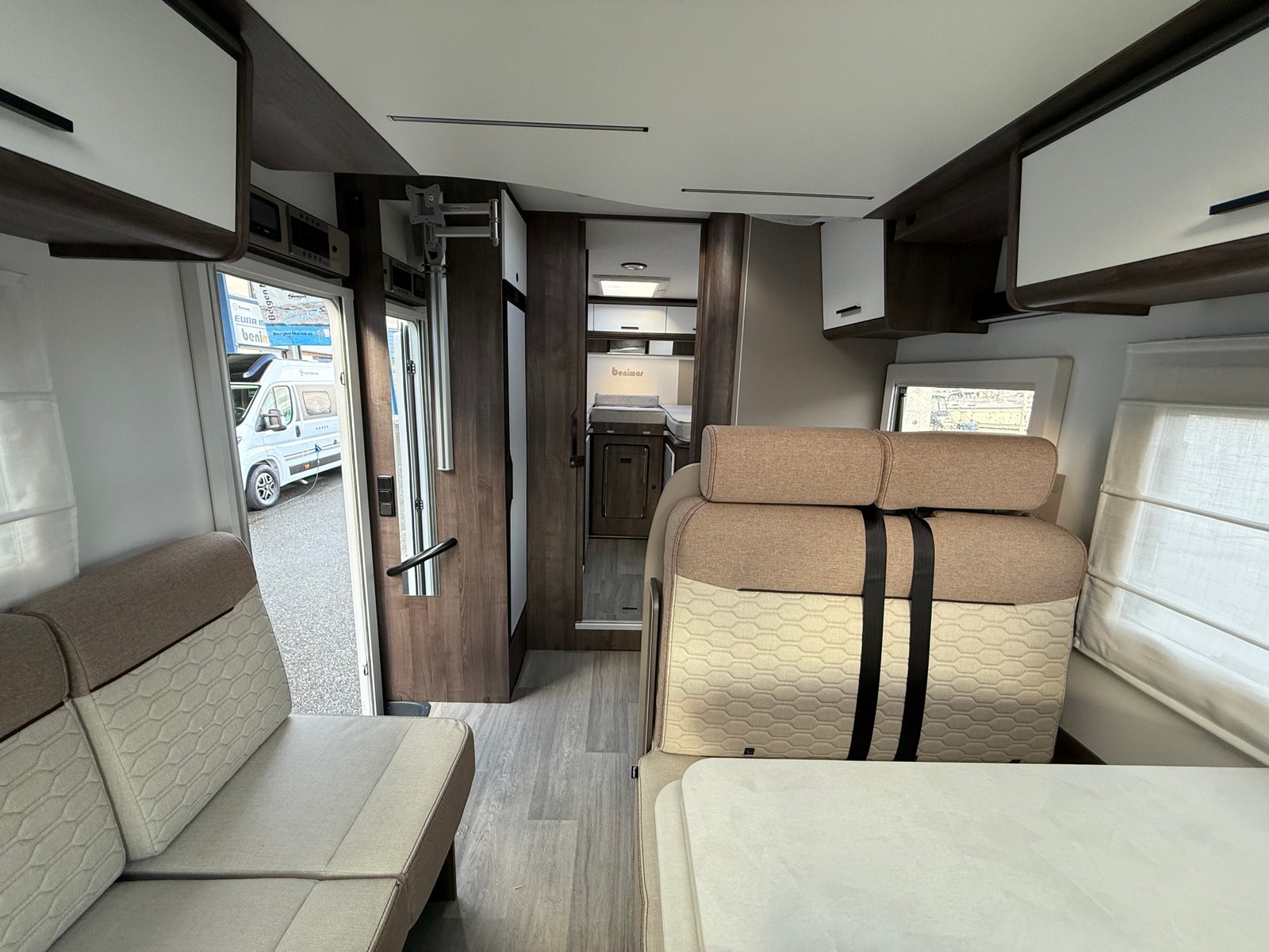 Bobilen er registrert for 5 og har 2 vendbare pilotstoler i front. Det er også en elektrisk takseng over salong.
