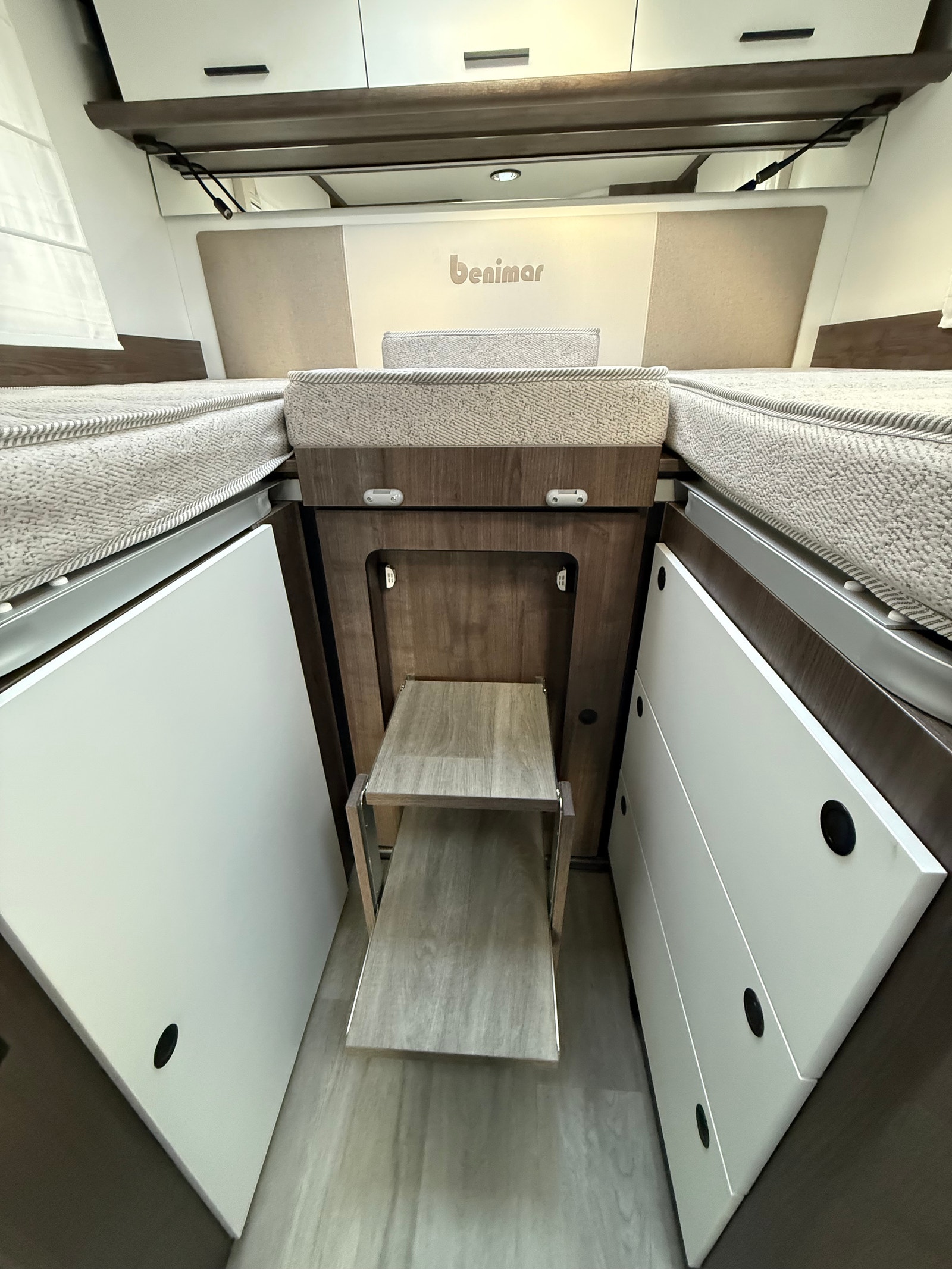 Seng bak kan lett gjøres om til en stor dobbelseng ved å trekke ut plate i midten. Det er også trapp opp til seng når ikke platen står ute. Trappen kan også lukkes opp fra innsiden slik at du lett får tilgang til garasjen.