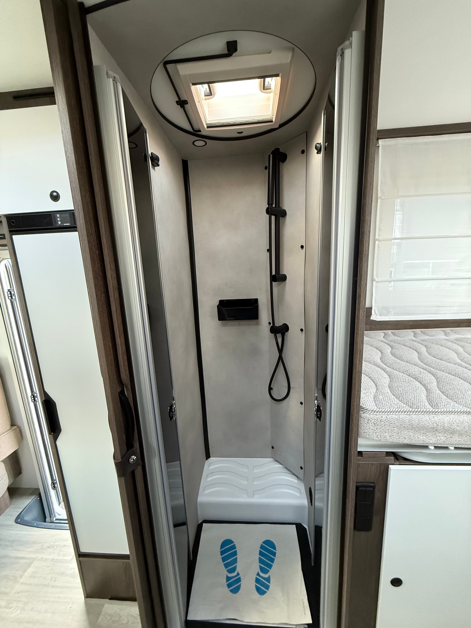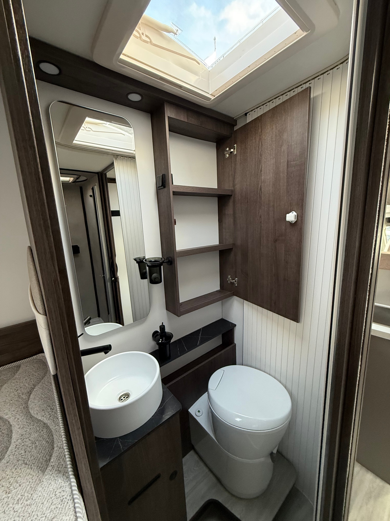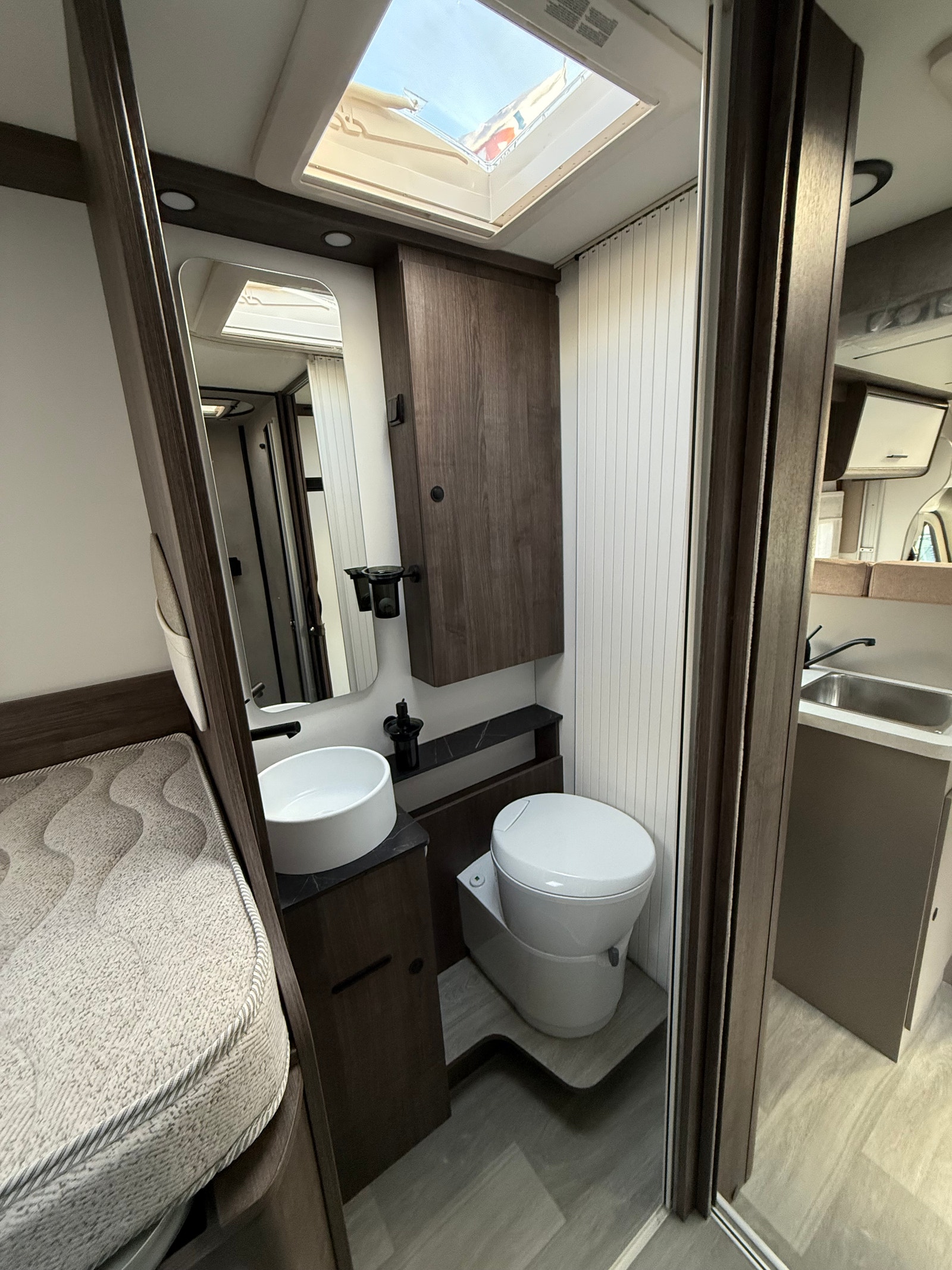 Det er er separert og romslig toalett og dusj med mulighet for å skyve igjen dør frem mot kjøkken. Meget praktisk!