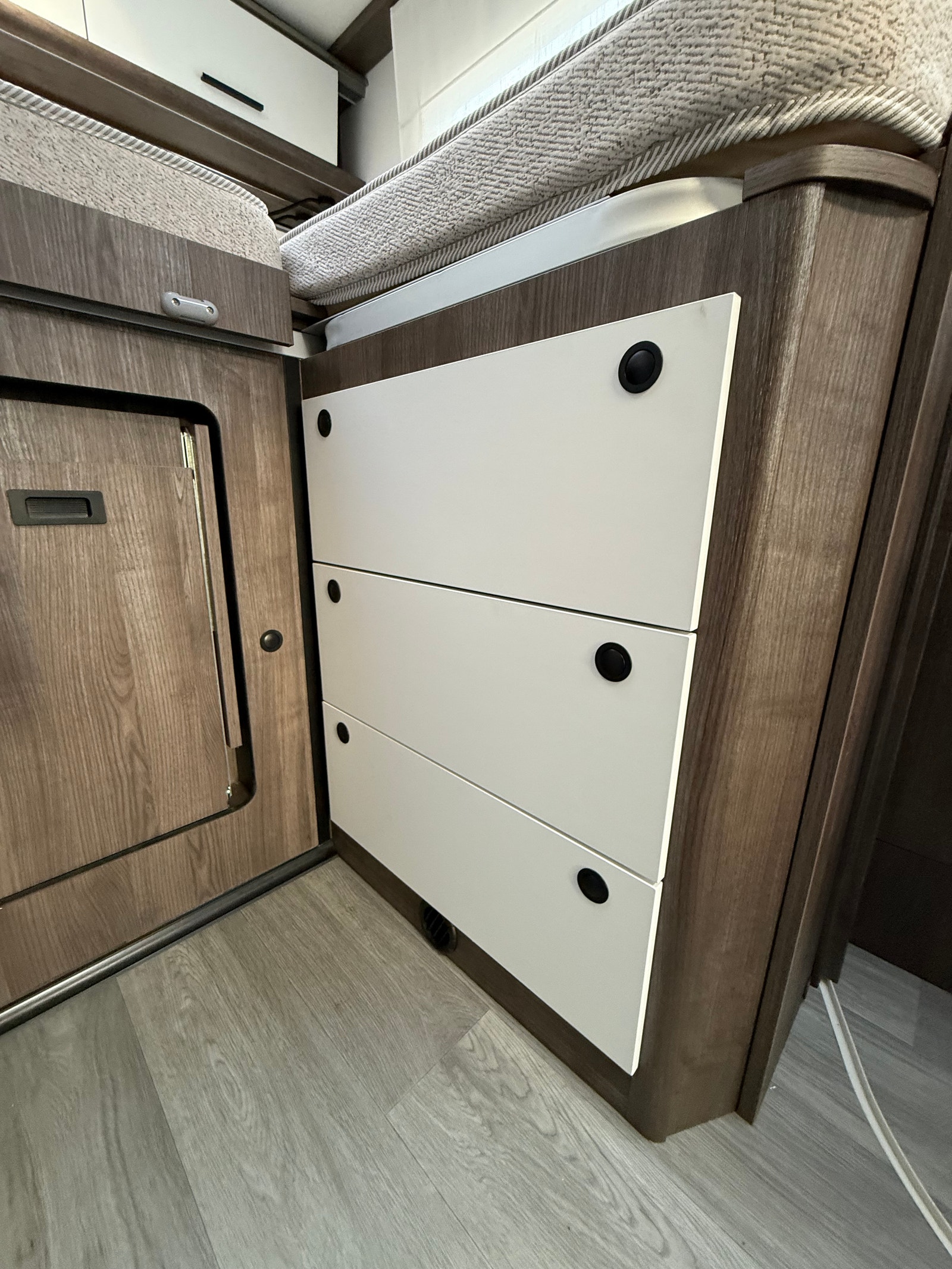 Tessoro 463 har da kombinasjonen med 2 to enkle senger bak og vinkelsofa løsning i salong. Vinkelsofa gir mulighet for 5 passasjerer.