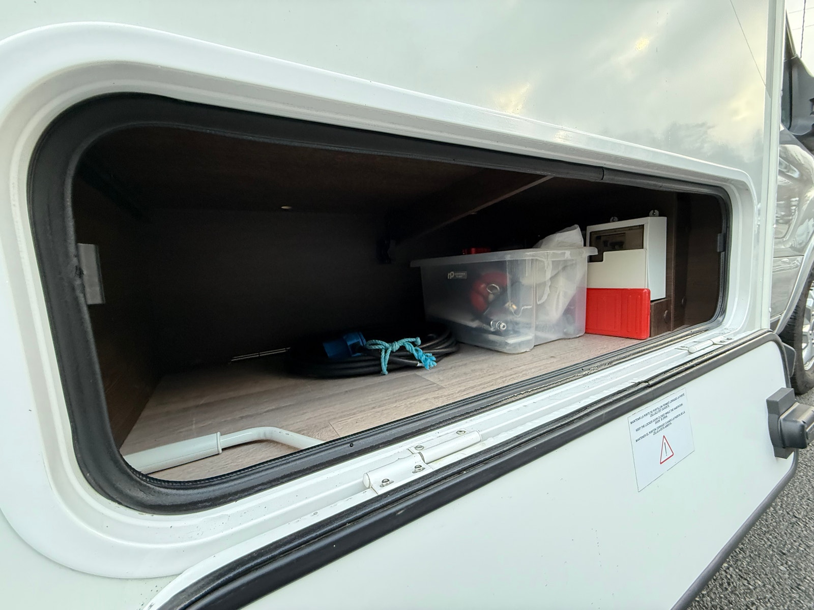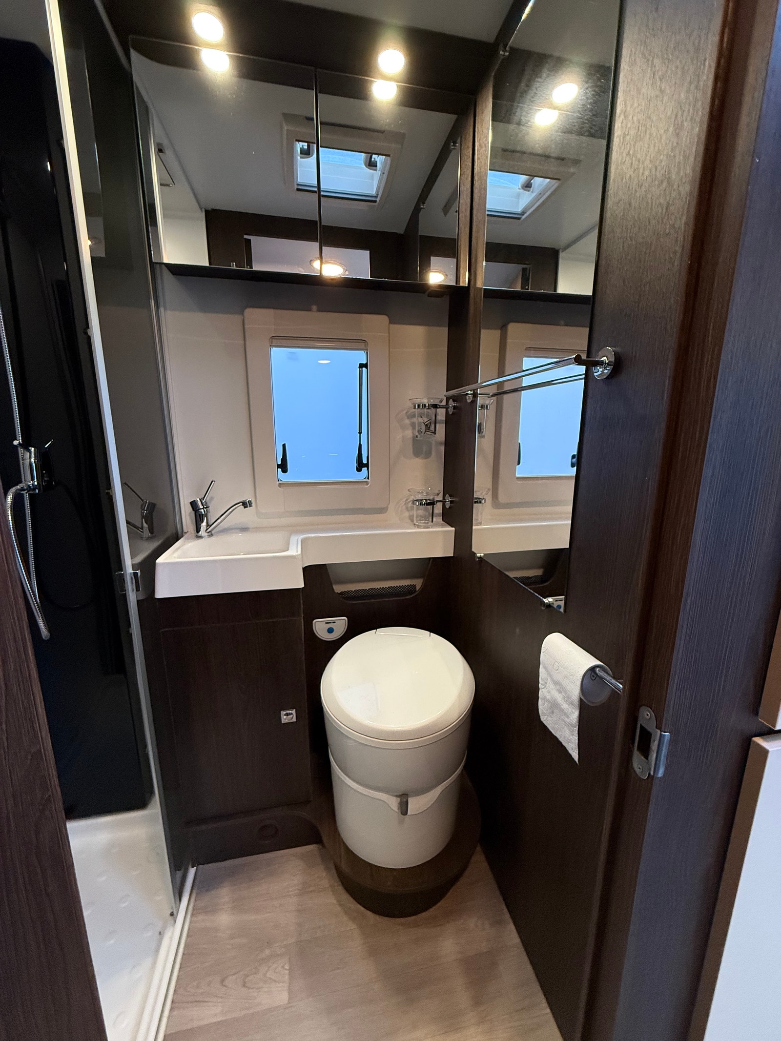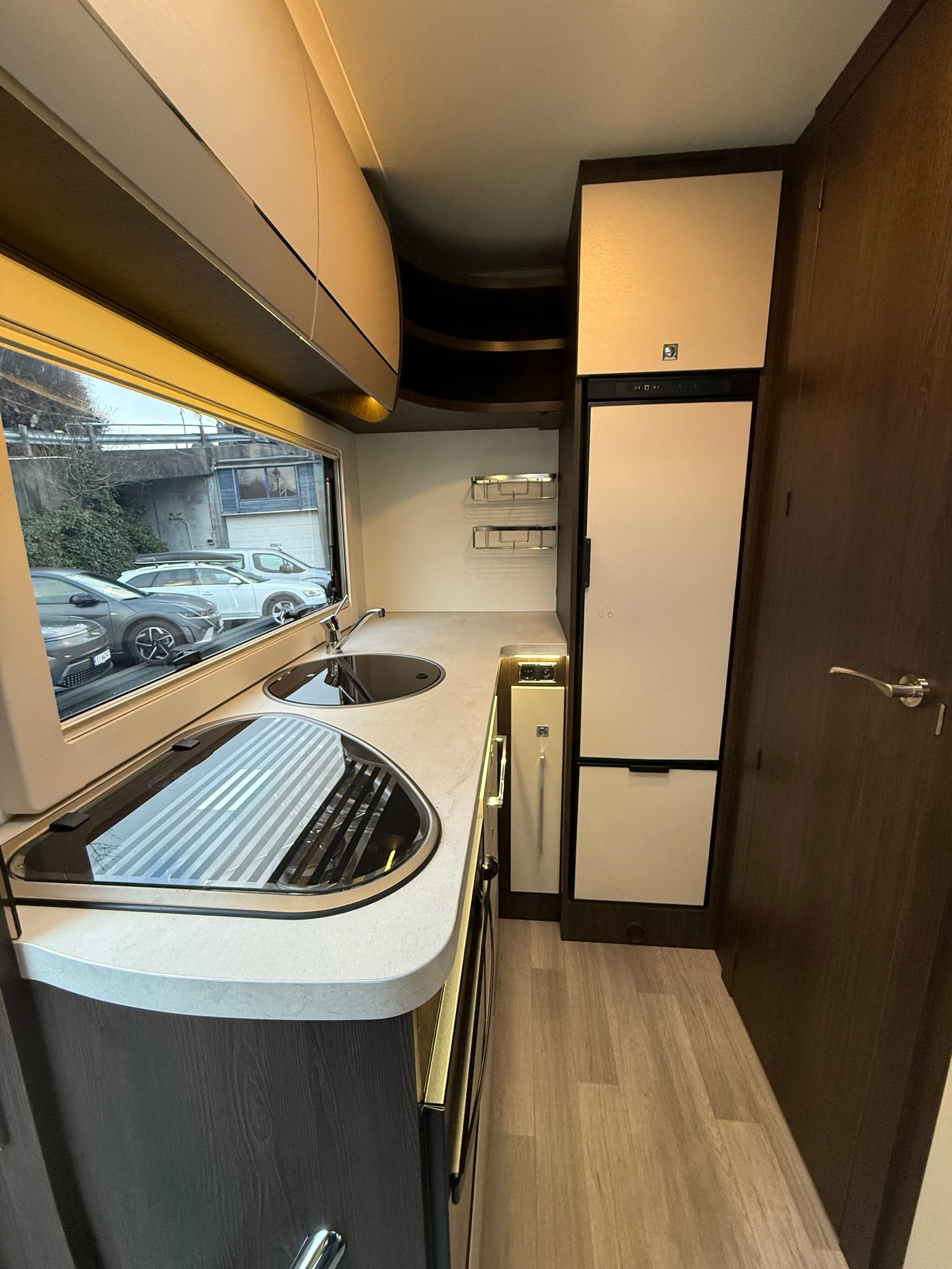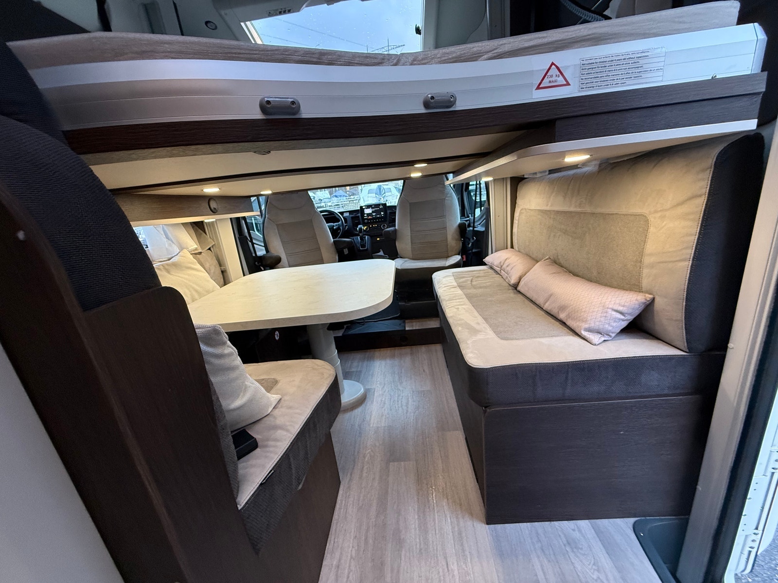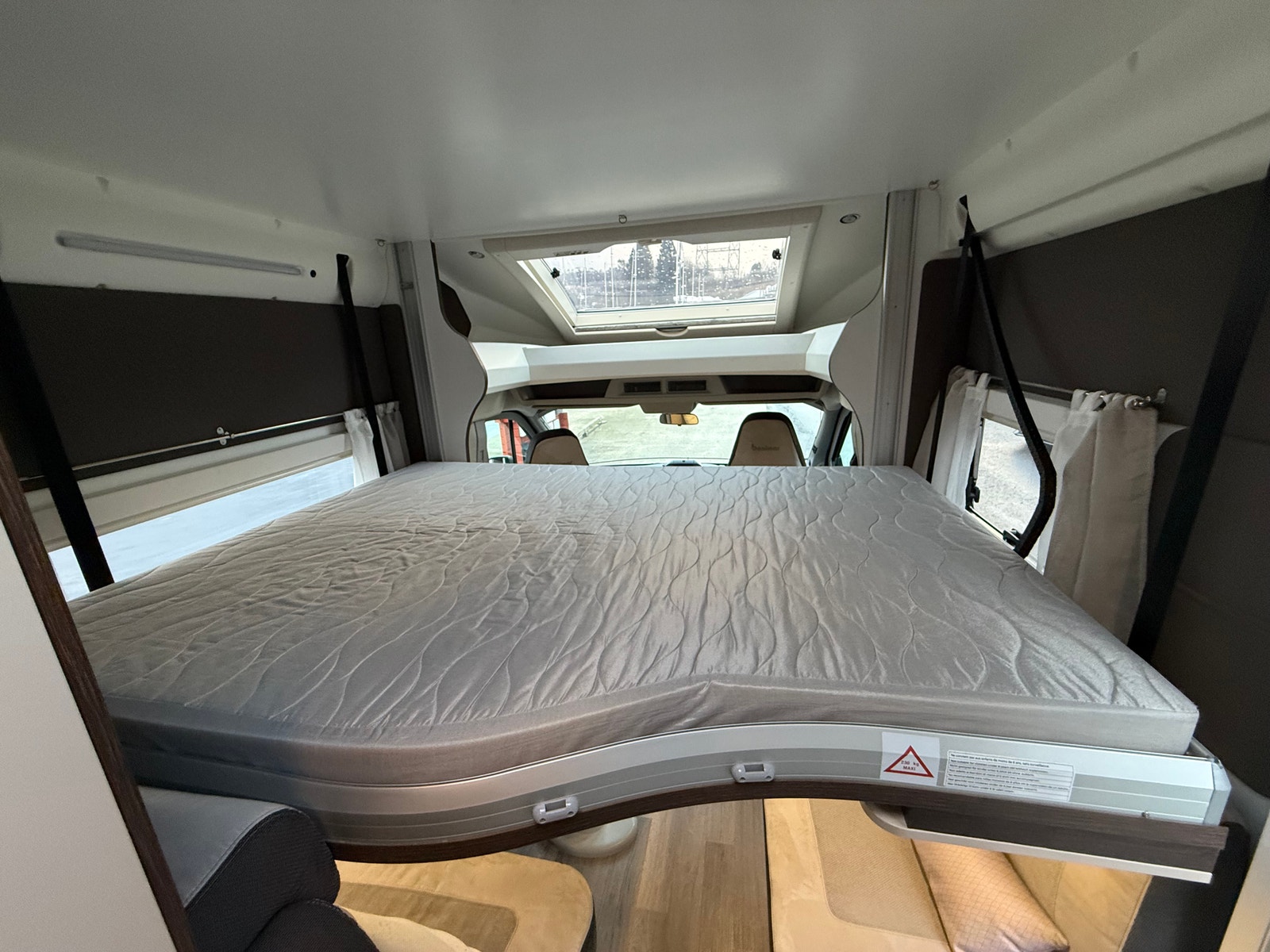 Dette er en bil under 6 meter men meget romslig inni – den utmerker seg på plass inne da seng senkes fra tak. Sengen er trinnløs og kommer helt ned til benk.
