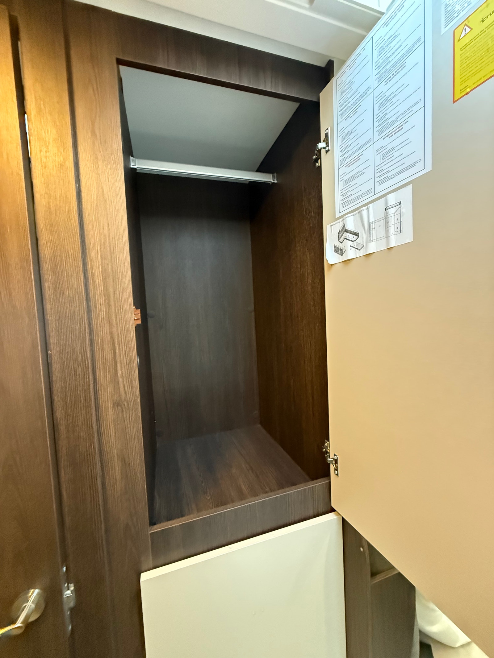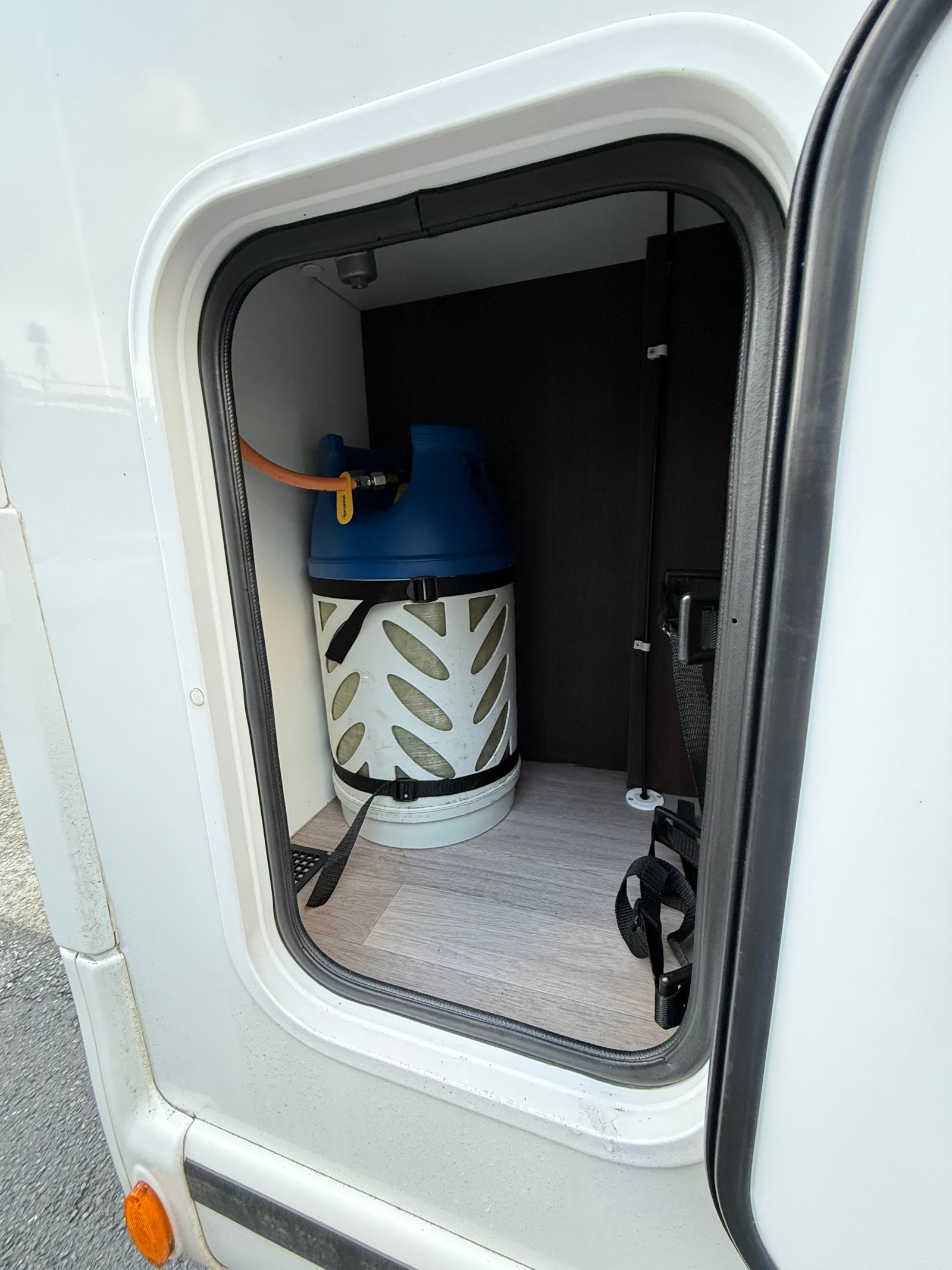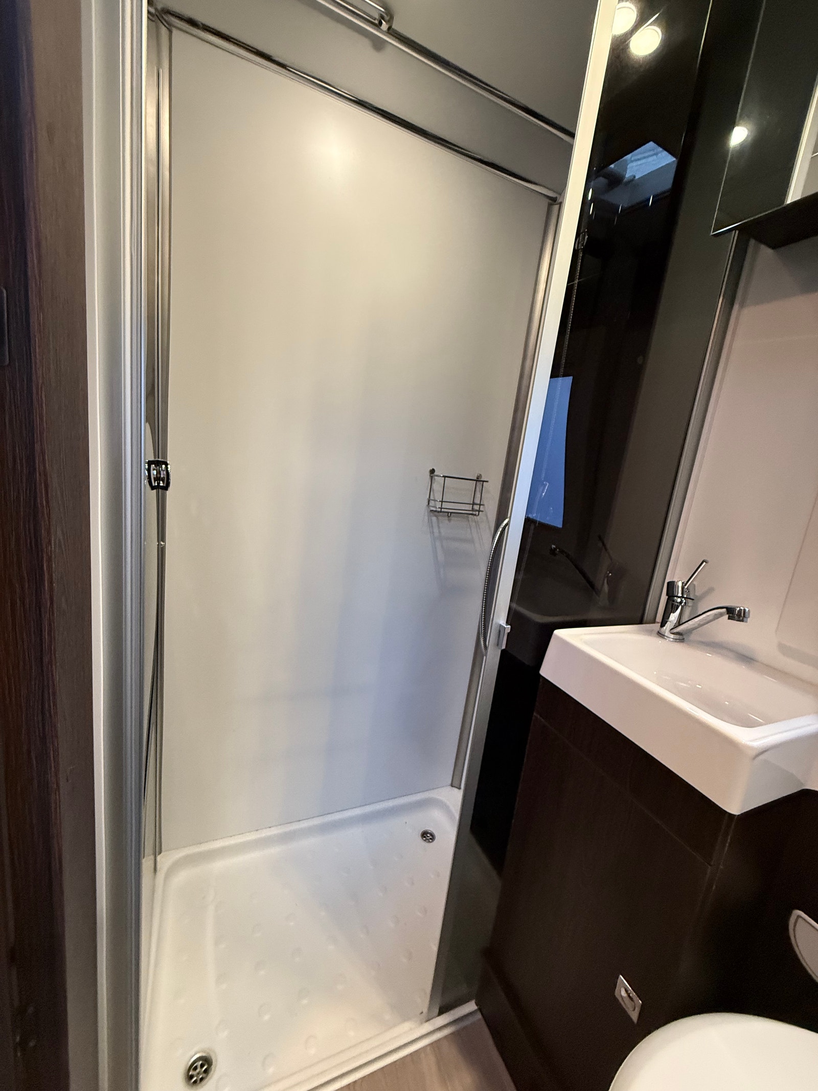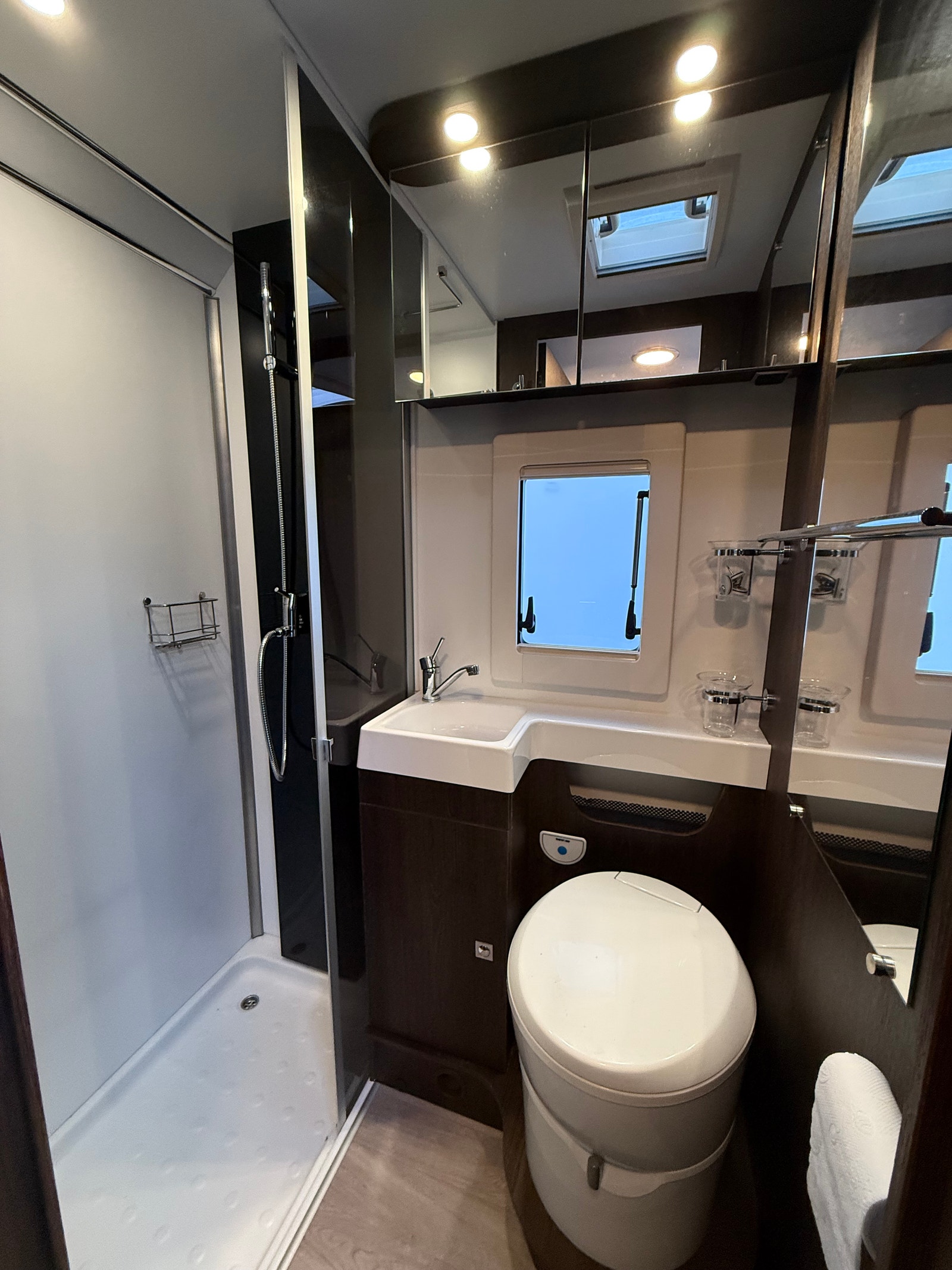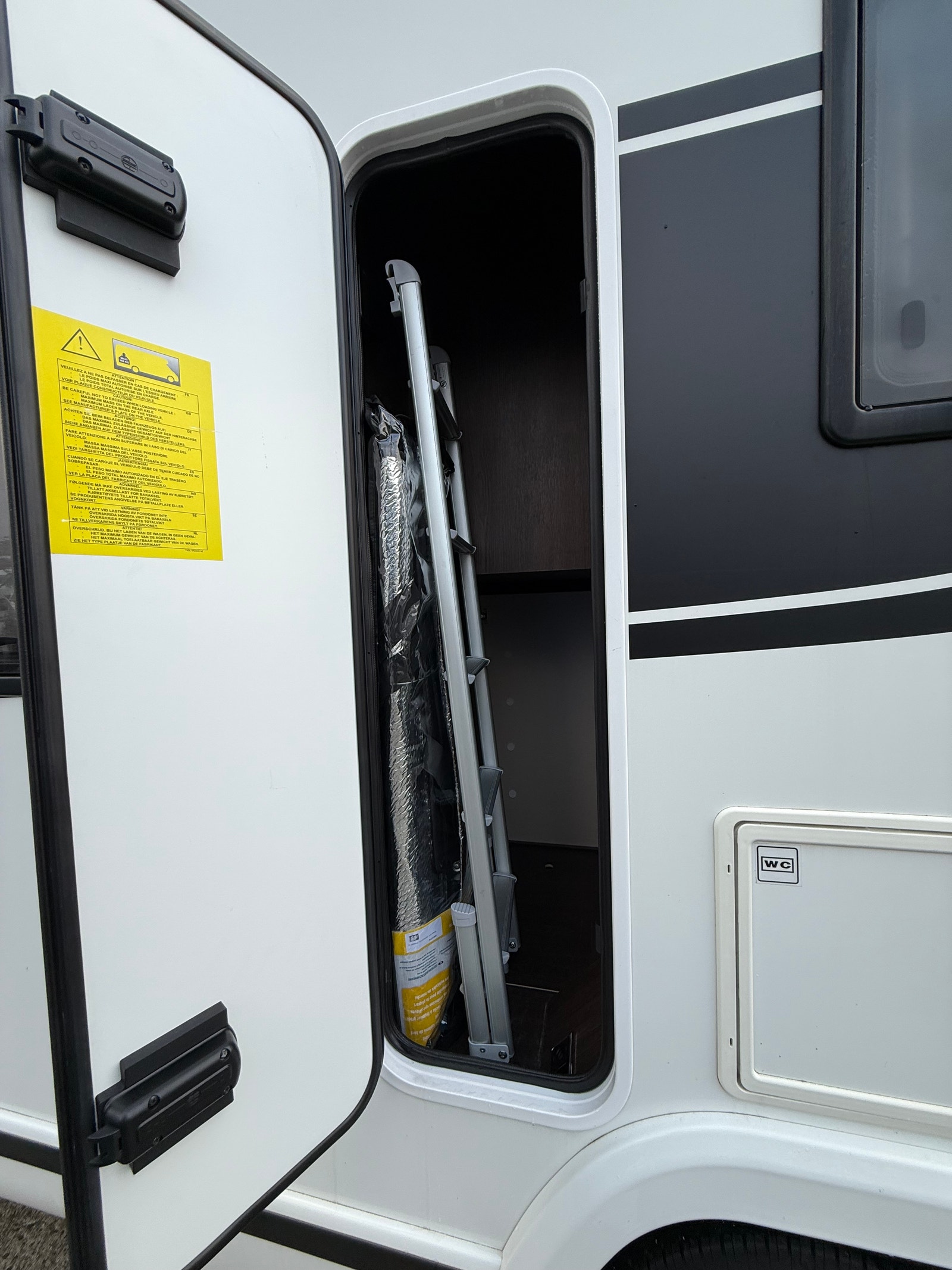 Dette er en bil under 6 meter men meget romslig inni – den utmerker seg på plass inne da seng senkes fra tak. Sengen er trinnløs og kommer helt ned til benk.