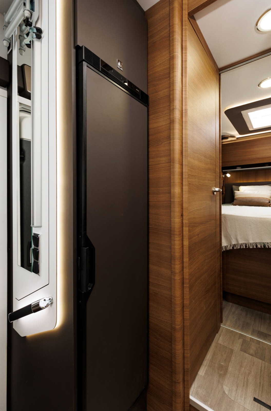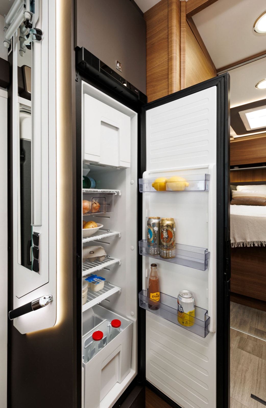 Amphitryon 998 er registrert for 4 personer og har en komfortable dobbeltseng med 20 cm tykke madrasser. Det finnes garderobeskap og god lagring også under sengen. En elektrisk senkeseng foran gir ytterligere to soveplasser og tåler hele 250 kg. Praktisk skilledør mellom soverom og salong/bad gir ekstra privatliv.