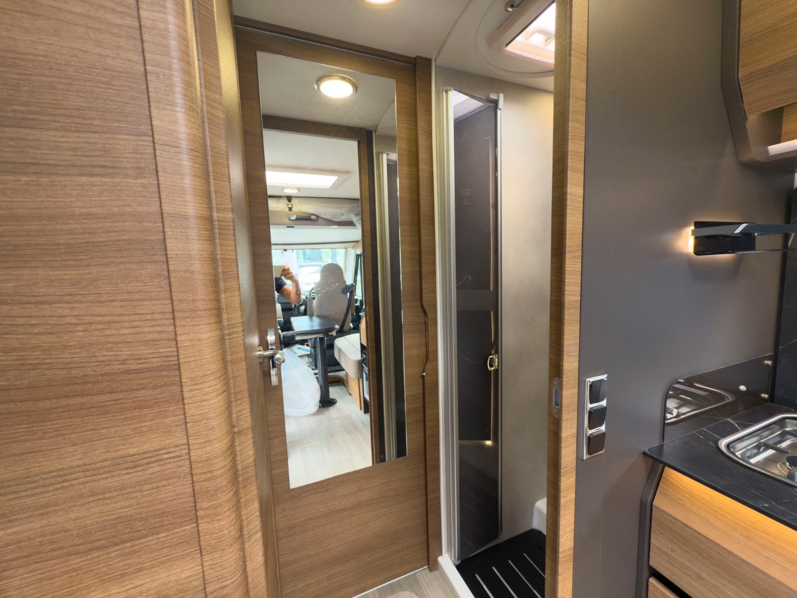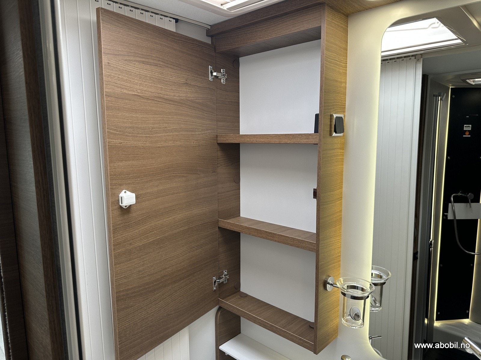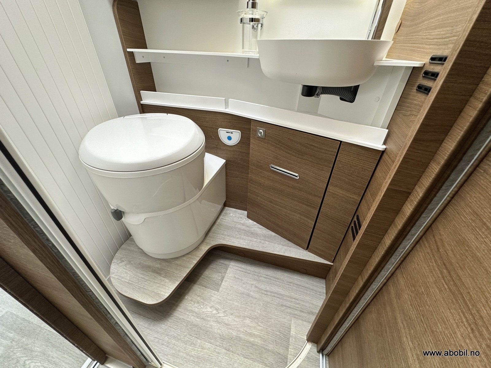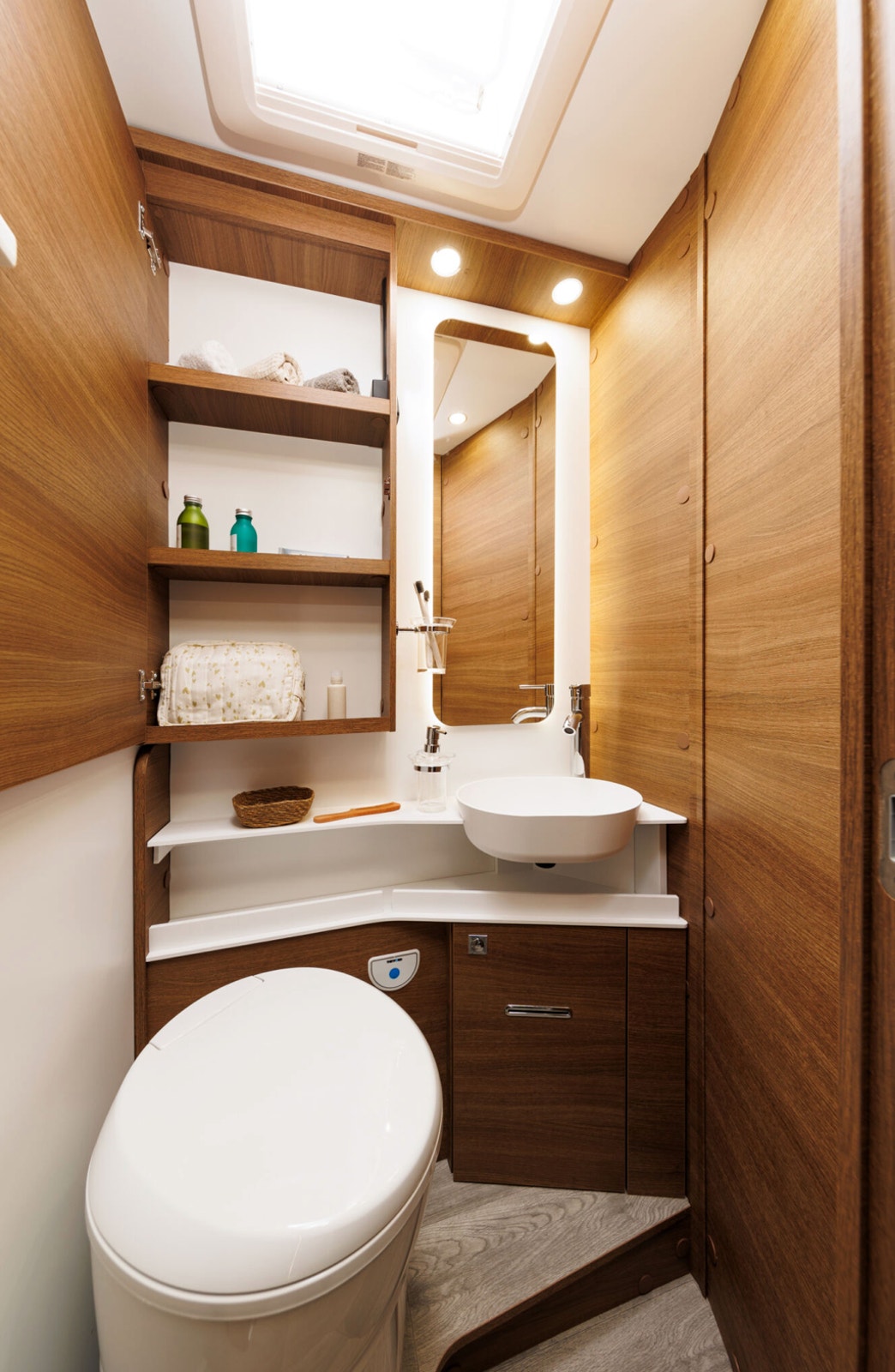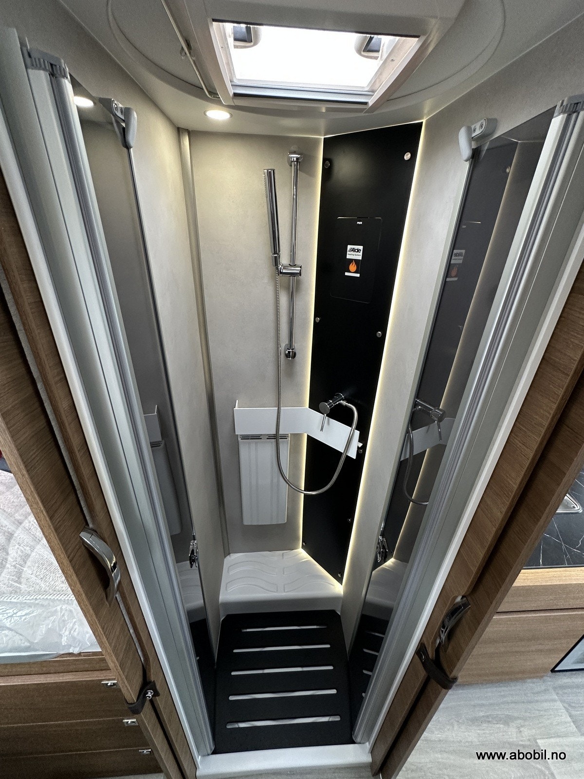 Separat dusj med dør og takluke gir svært god komfort. Dusjen har også nedtrekkbar stang for tørking av klær eller håndklær. Godt vanntrykk, og det er rikelig med skapplass, stort speil og svingbart toalett. Takluken har myggnett og formørkningsgardin – som resten av bodelens åpninger.