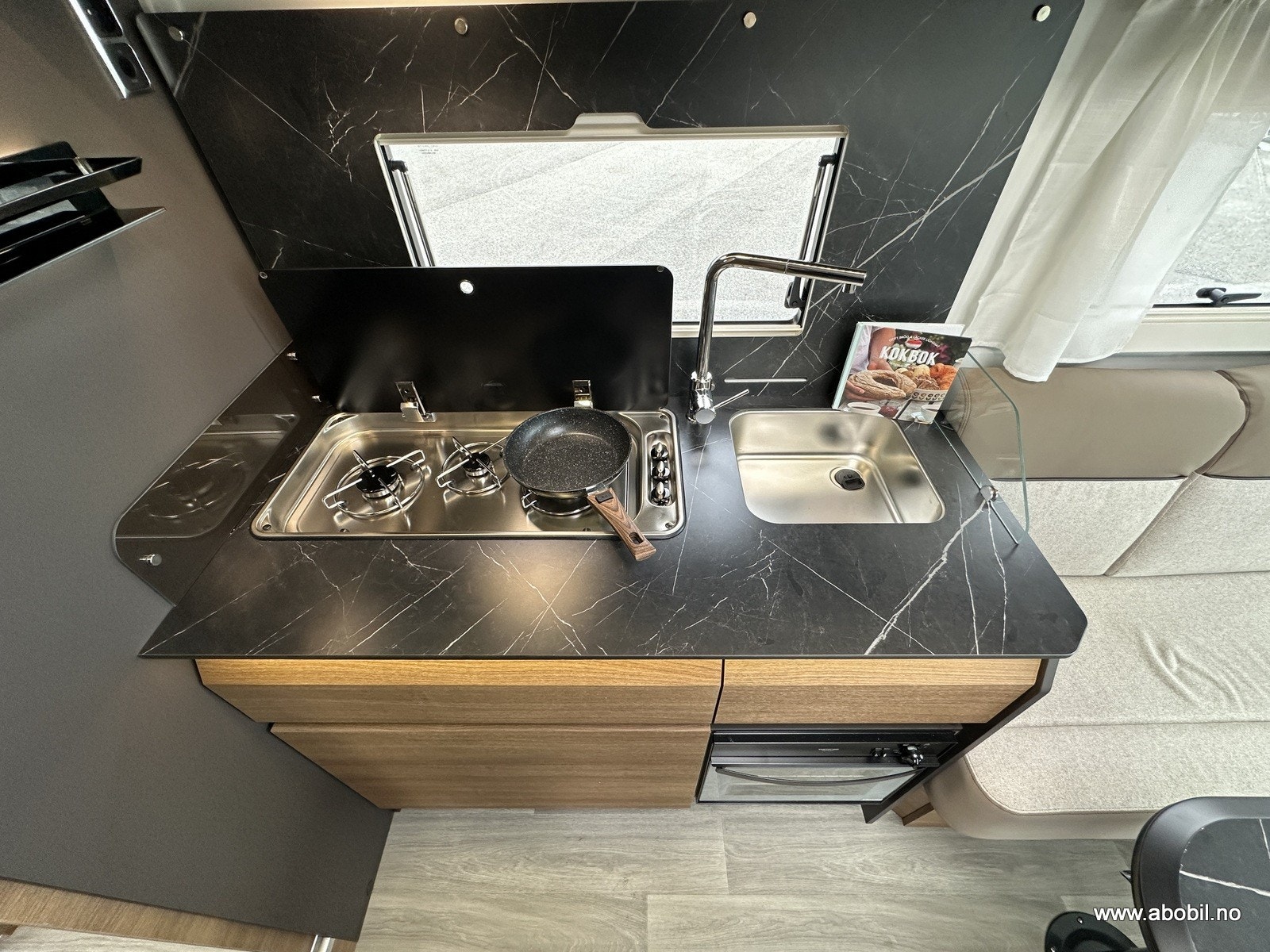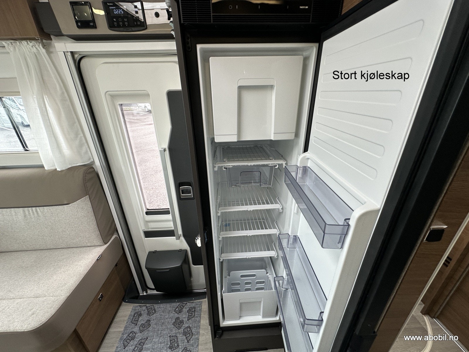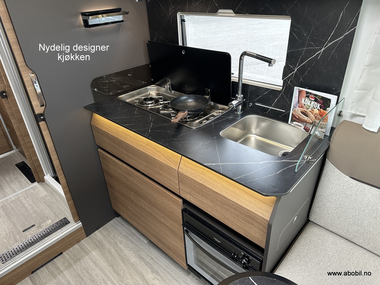 Praktisk og moderne kjøkken med tre gassbluss, elektrisk tenning og todelt glassdeksel som både beskytter og utvider benkeplassen. Stekeovn og kjøkkenvifte sørger for gode matlagingsmuligheter. Romslig vask og store skuffer gir god oppbevaringsplass. Stort automatisk kjøleskap med separat frysedel gjør det enkelt å ta med nok mat på tur. Takluke med myggnett og plisségardin over kjøkkenet gir god ventilasjon.