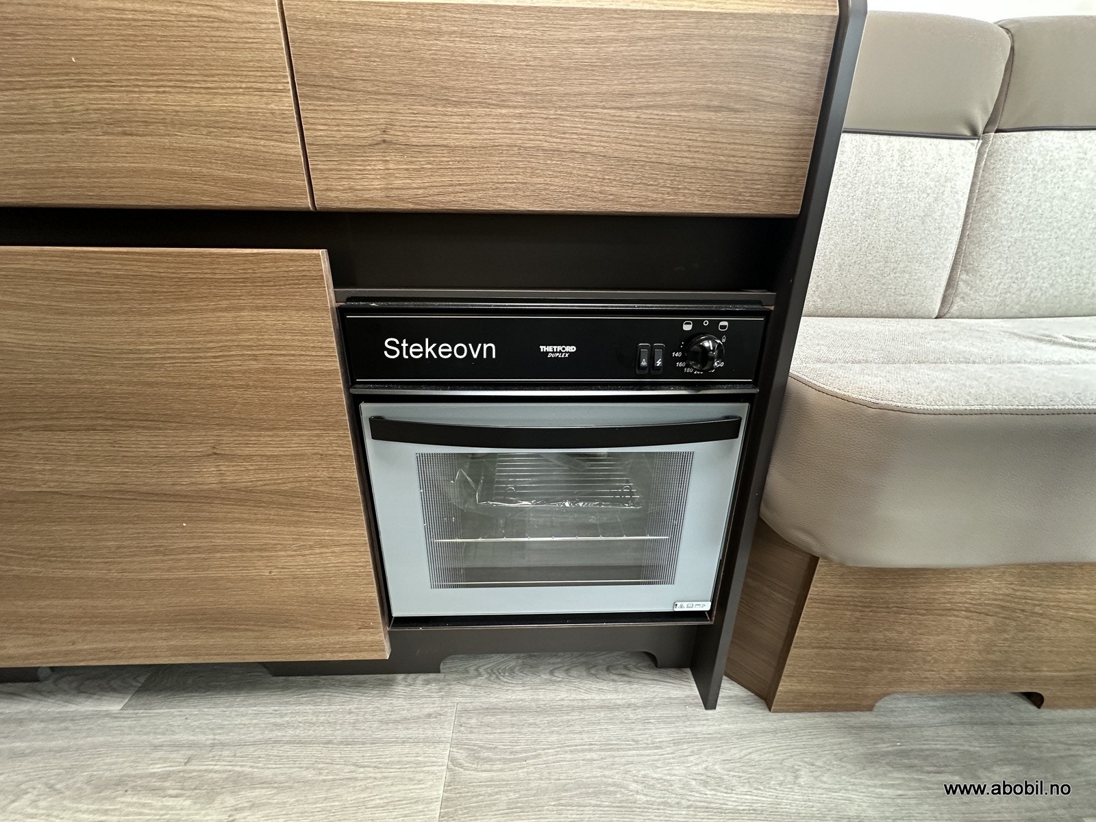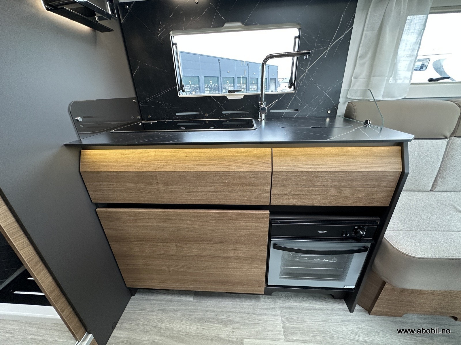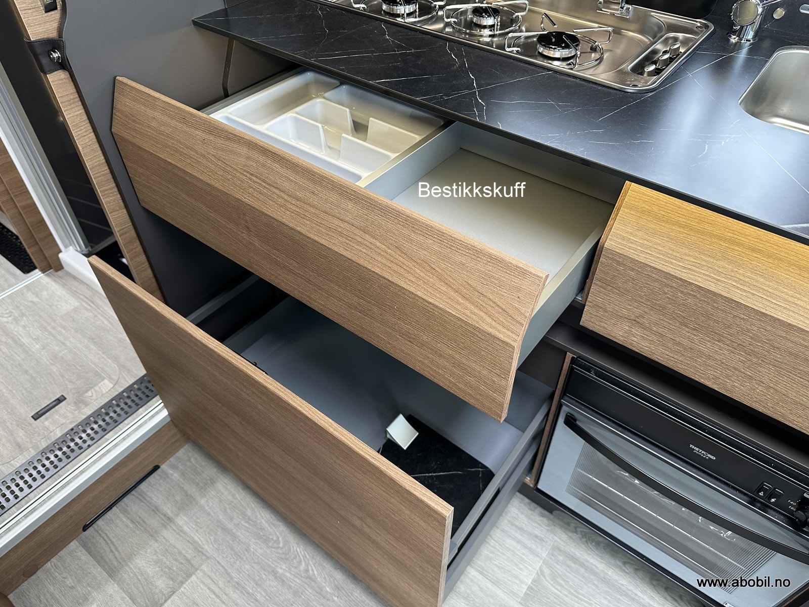 Praktisk og moderne kjøkken med tre gassbluss, elektrisk tenning og todelt glassdeksel som både beskytter og utvider benkeplassen. Stekeovn og kjøkkenvifte sørger for gode matlagingsmuligheter. Romslig vask og store skuffer gir god oppbevaringsplass. Stort automatisk kjøleskap med separat frysedel gjør det enkelt å ta med nok mat på tur. Takluke med myggnett og plisségardin over kjøkkenet gir god ventilasjon.