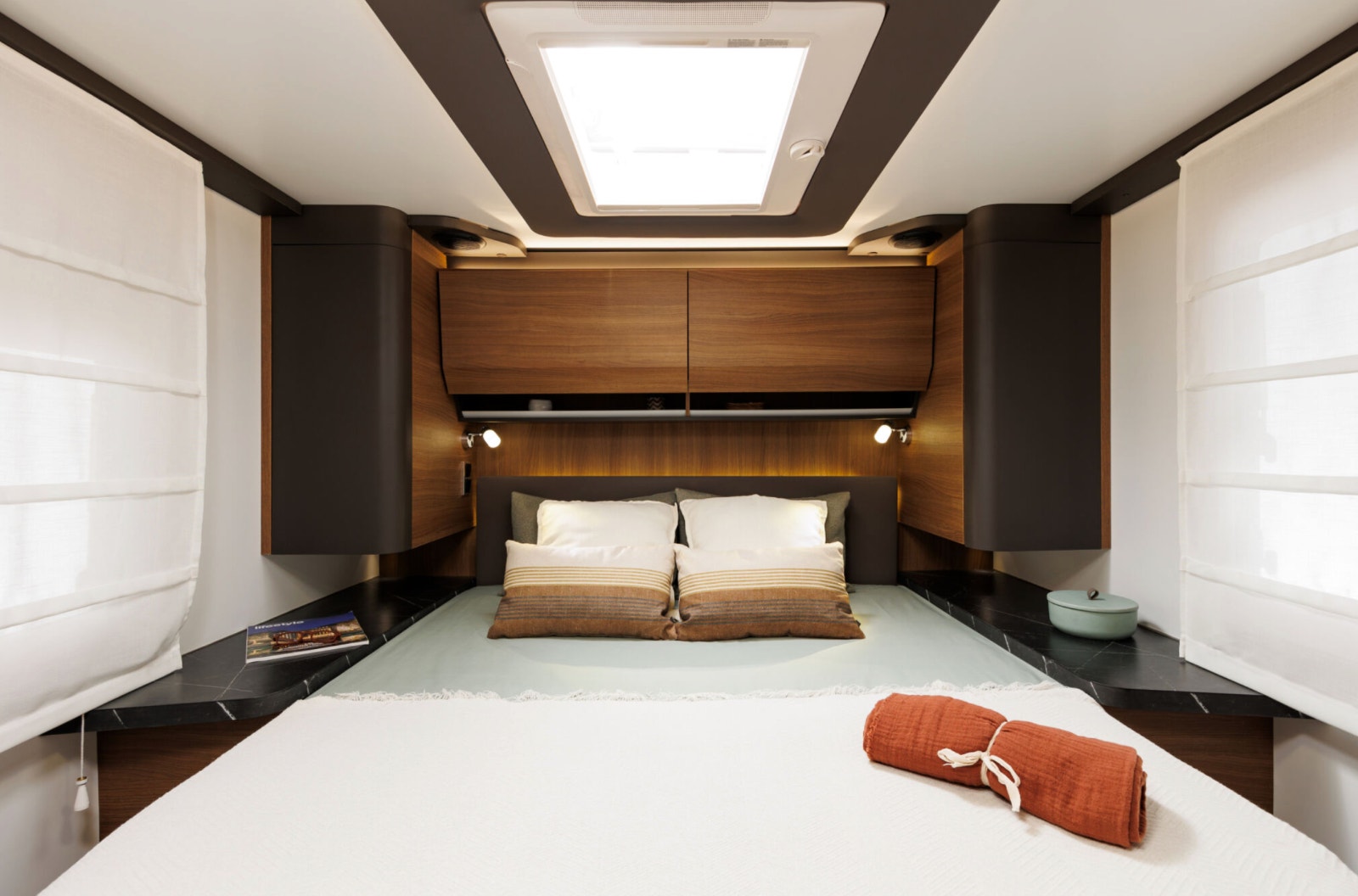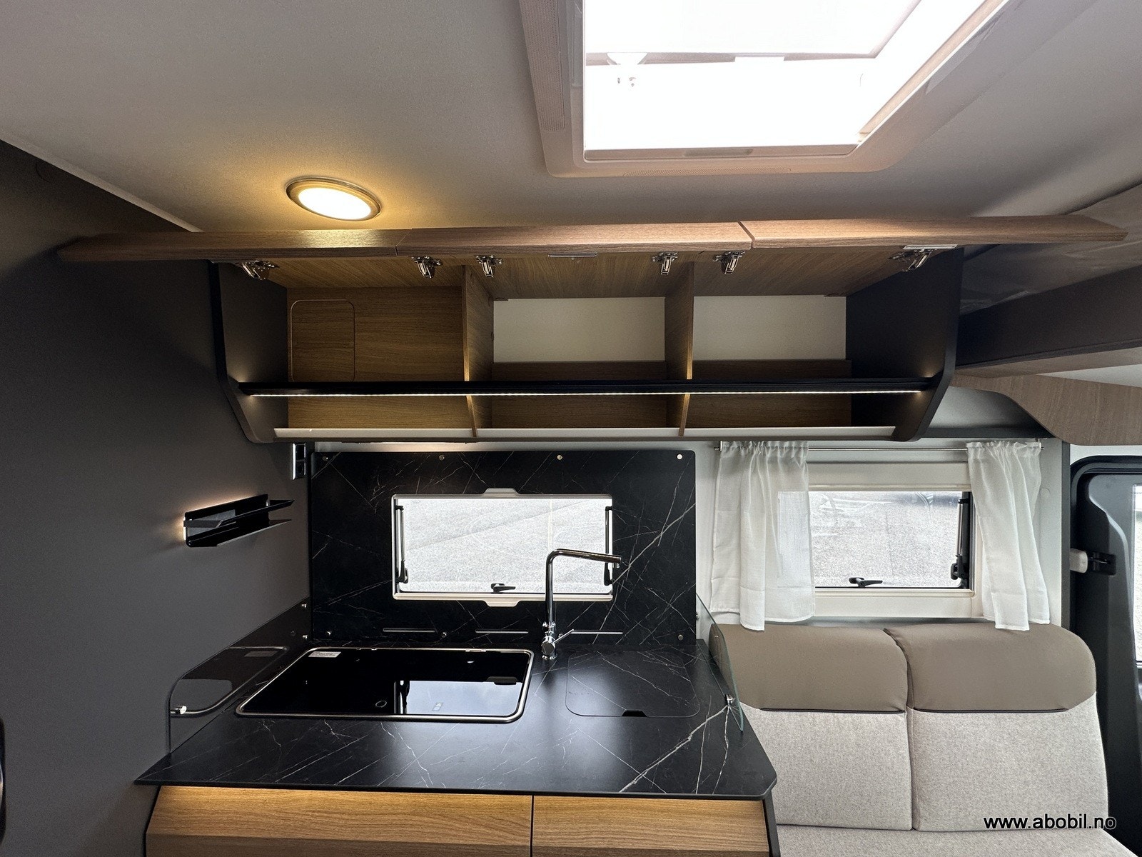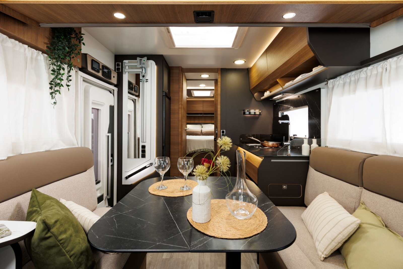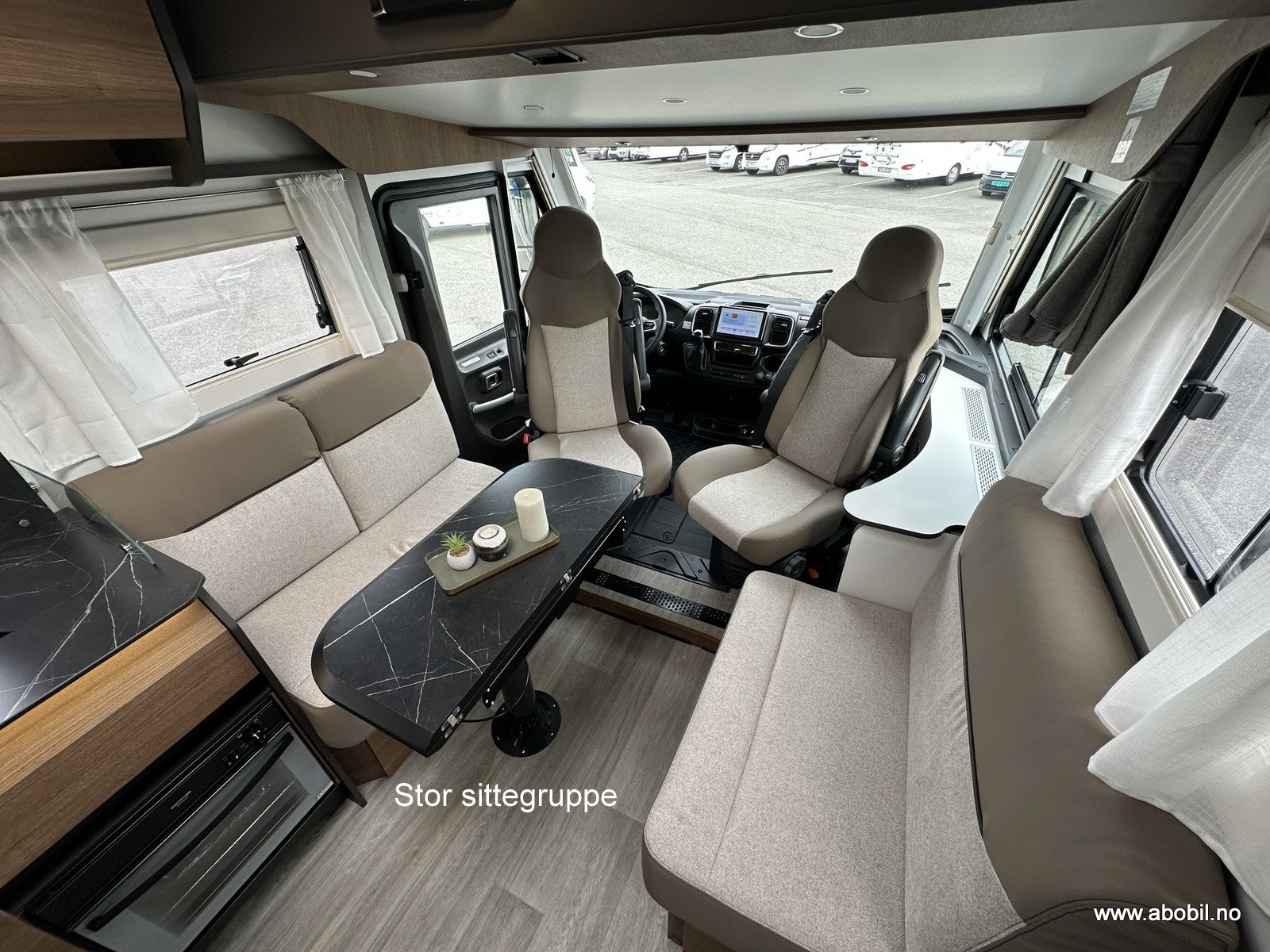 Salongen består av to svingbare pilotstoler og romslig sittegruppe – perfekt for både måltider og avslapping. Store vinduer og panorama takluke gir masse naturlig lys. TV-plass med 12V og 230V strømuttak er klart til bruk. Myggnett og mørkleggingsgardiner er standard på alle åpninger.