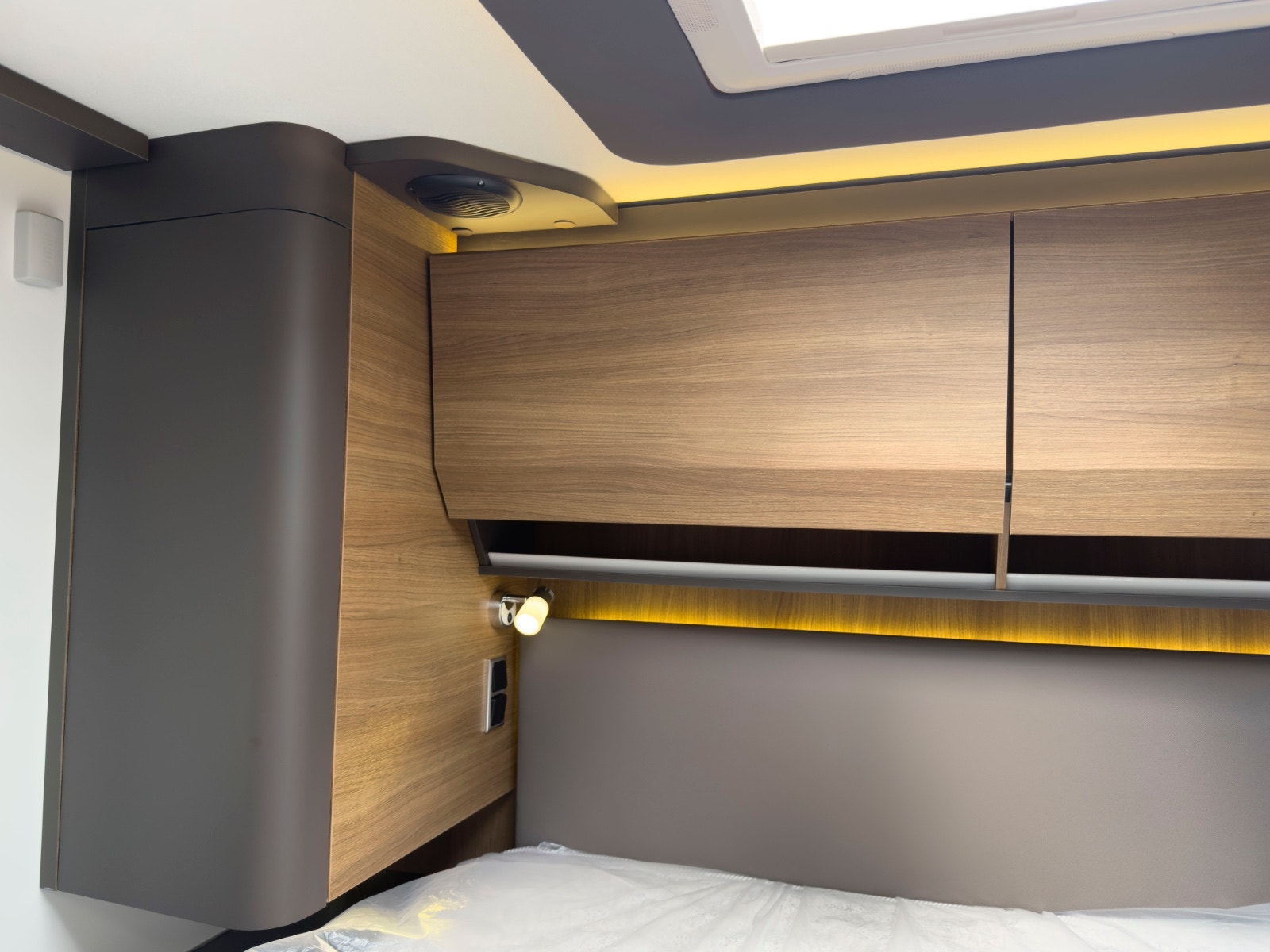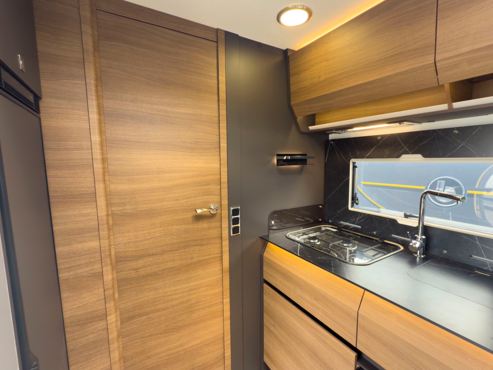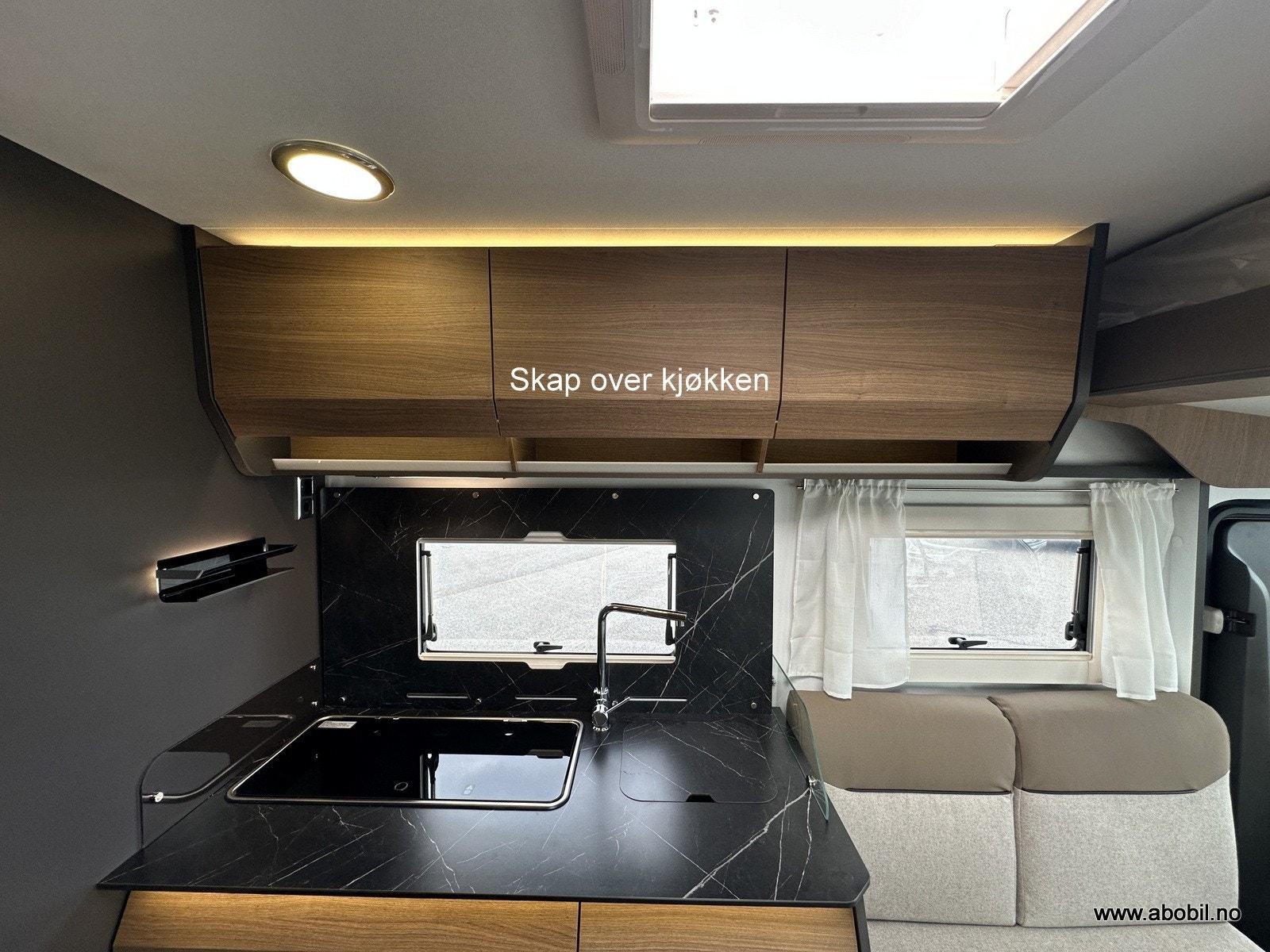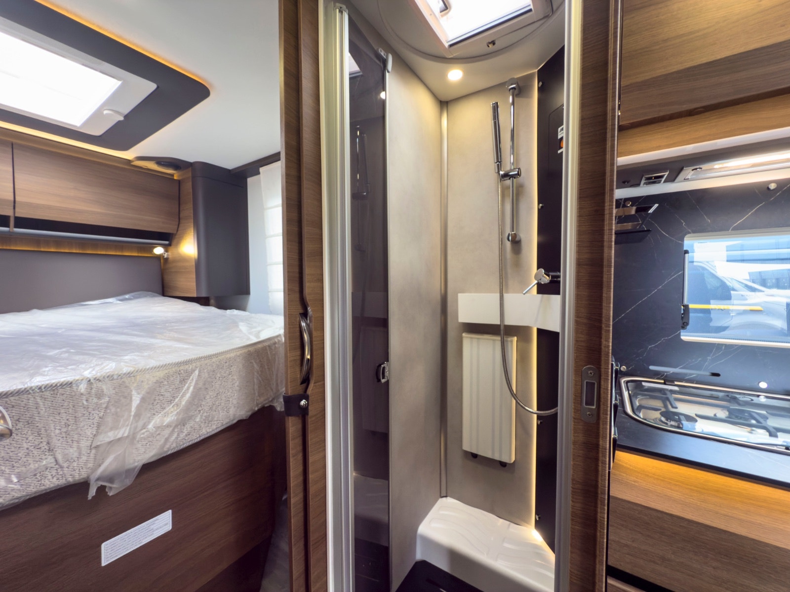 Salongen består av to svingbare pilotstoler og romslig sittegruppe – perfekt for både måltider og avslapping. Store vinduer og panorama takluke gir masse naturlig lys. TV-plass med 12V og 230V strømuttak er klart til bruk. Myggnett og mørkleggingsgardiner er standard på alle åpninger.