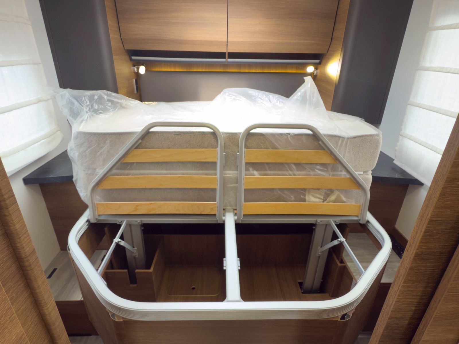 Amphitryon 998 er registrert for 4 personer og har en  komfortable dobbeltseng med 20 cm tykke madrasser. Det finnes garderobeskap og god lagring også under sengen. En elektrisk senkeseng foran gir ytterligere to soveplasser og tåler hele 250 kg. Praktisk skilledør mellom soverom og salong/bad gir ekstra privatliv.