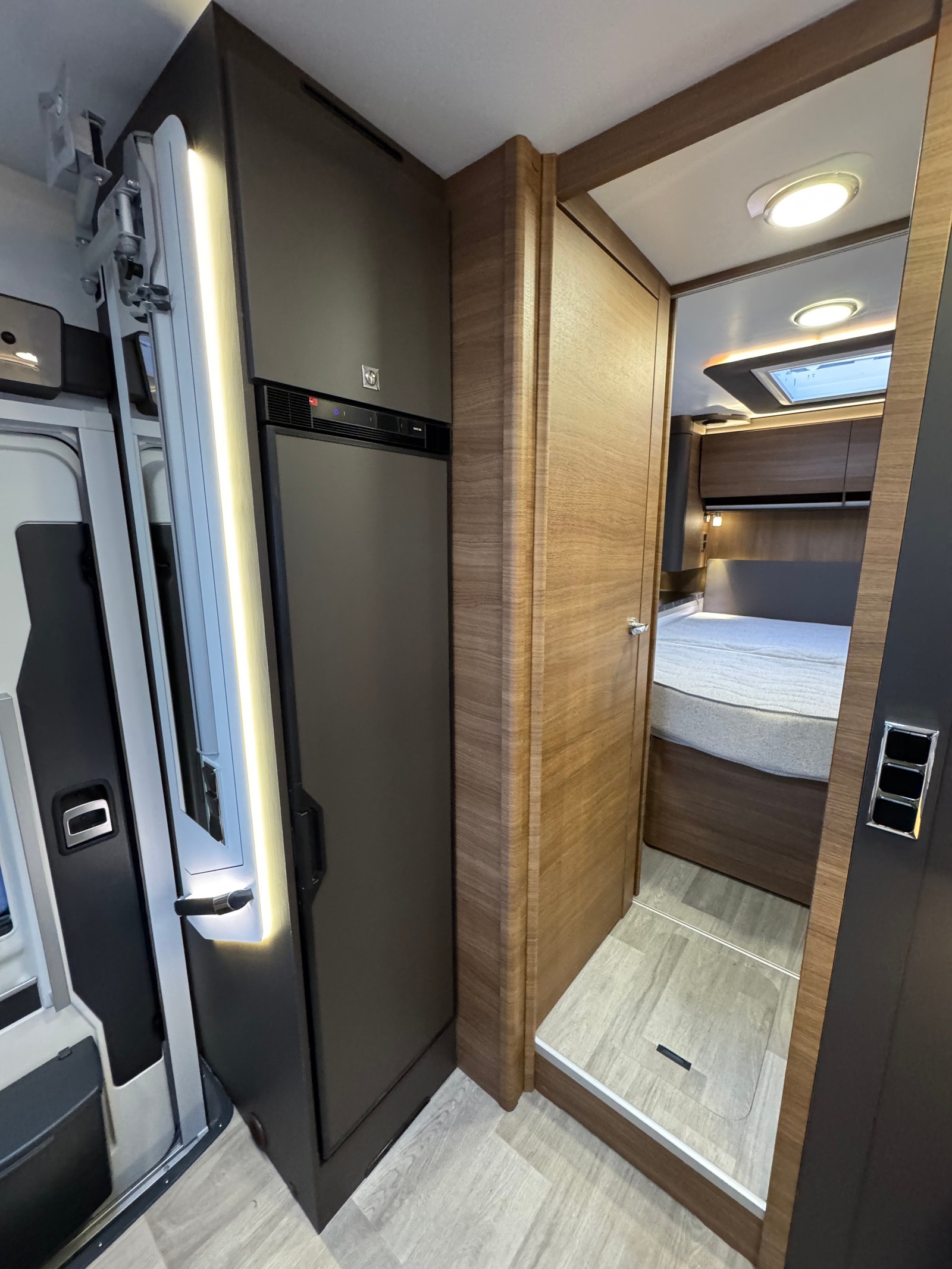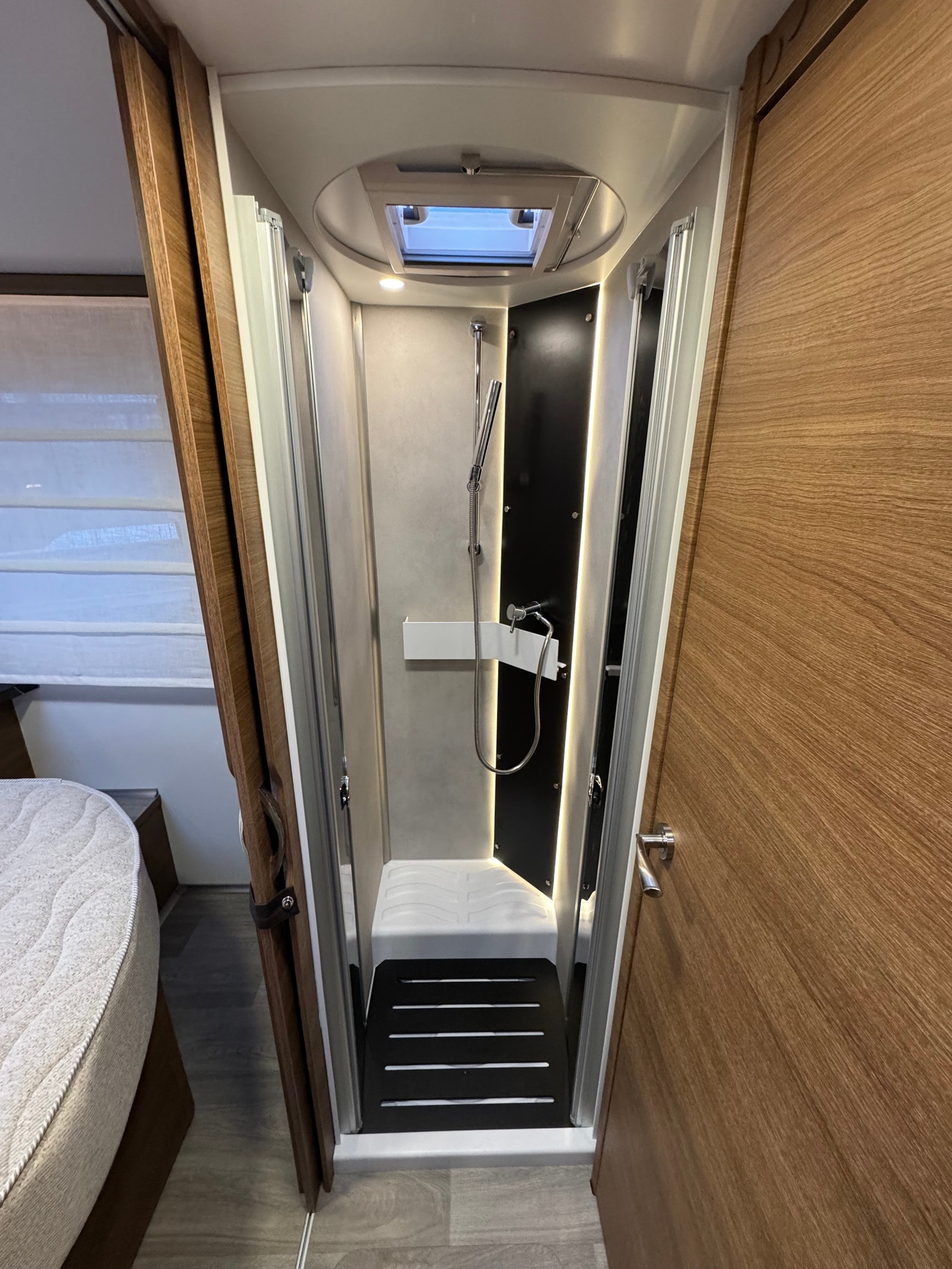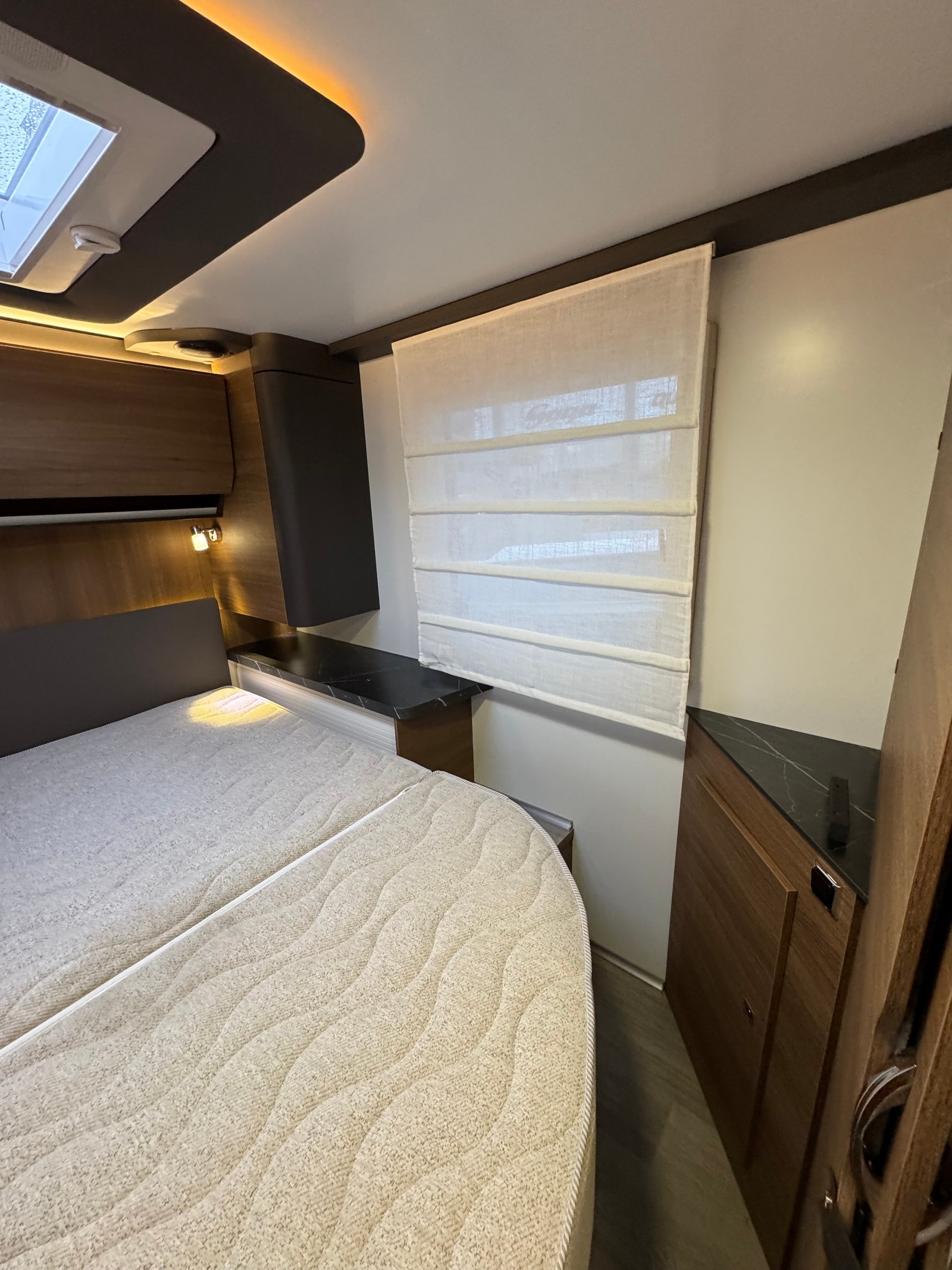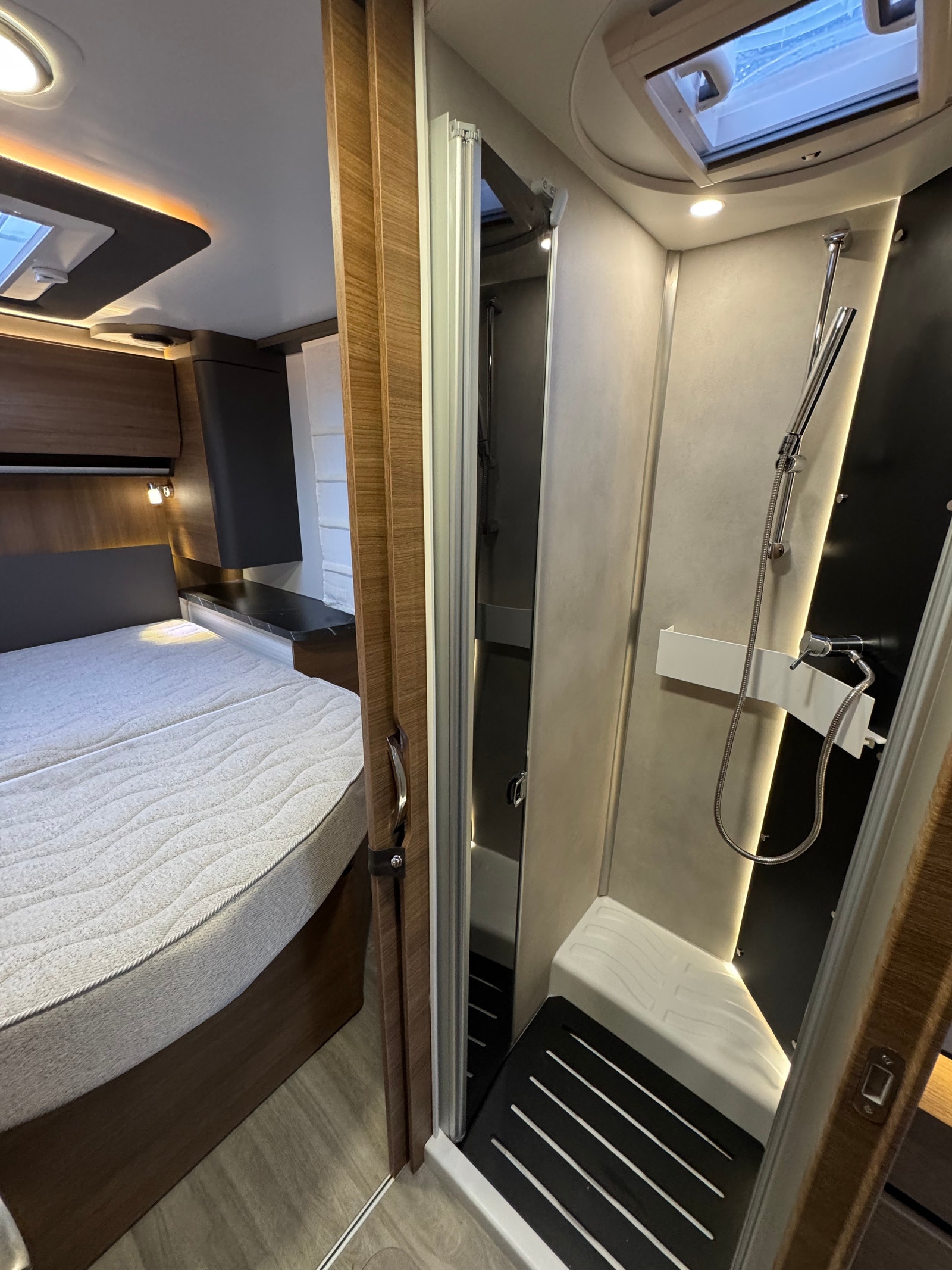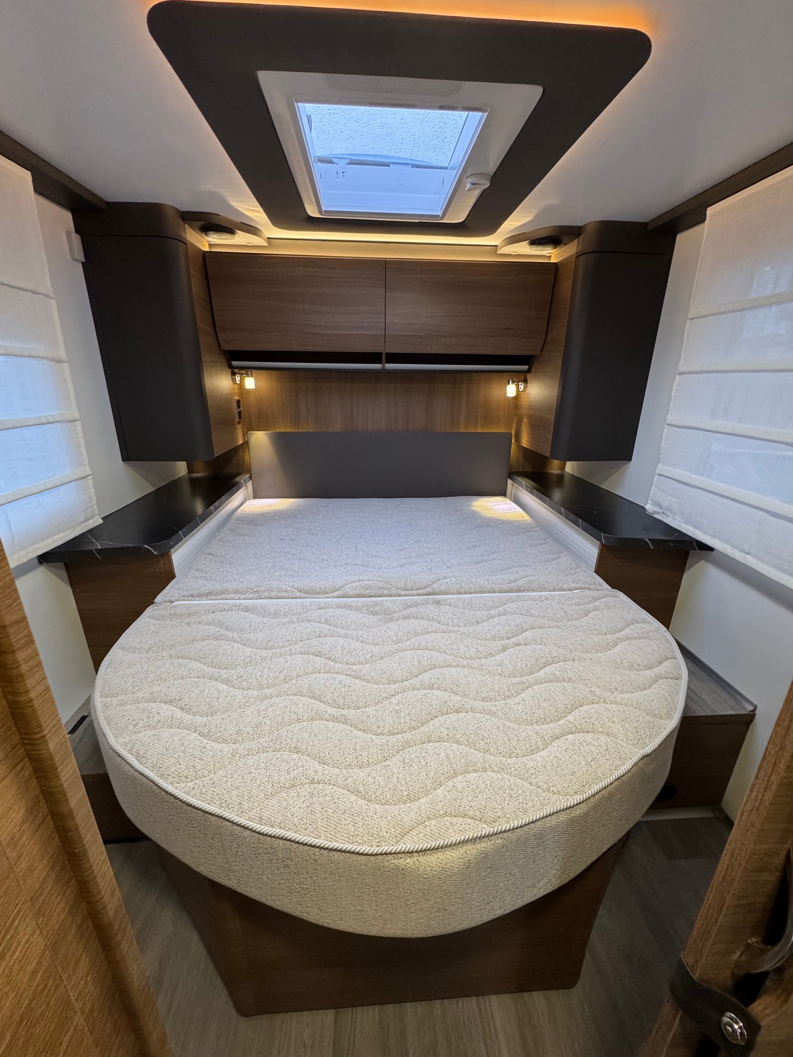 Bak er det midstilt dobbelseng med regulerbar senking og heving, separert toalett og dusj med skyvedør frem mot kjøkken.