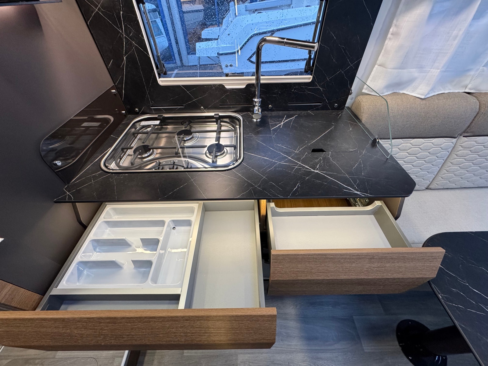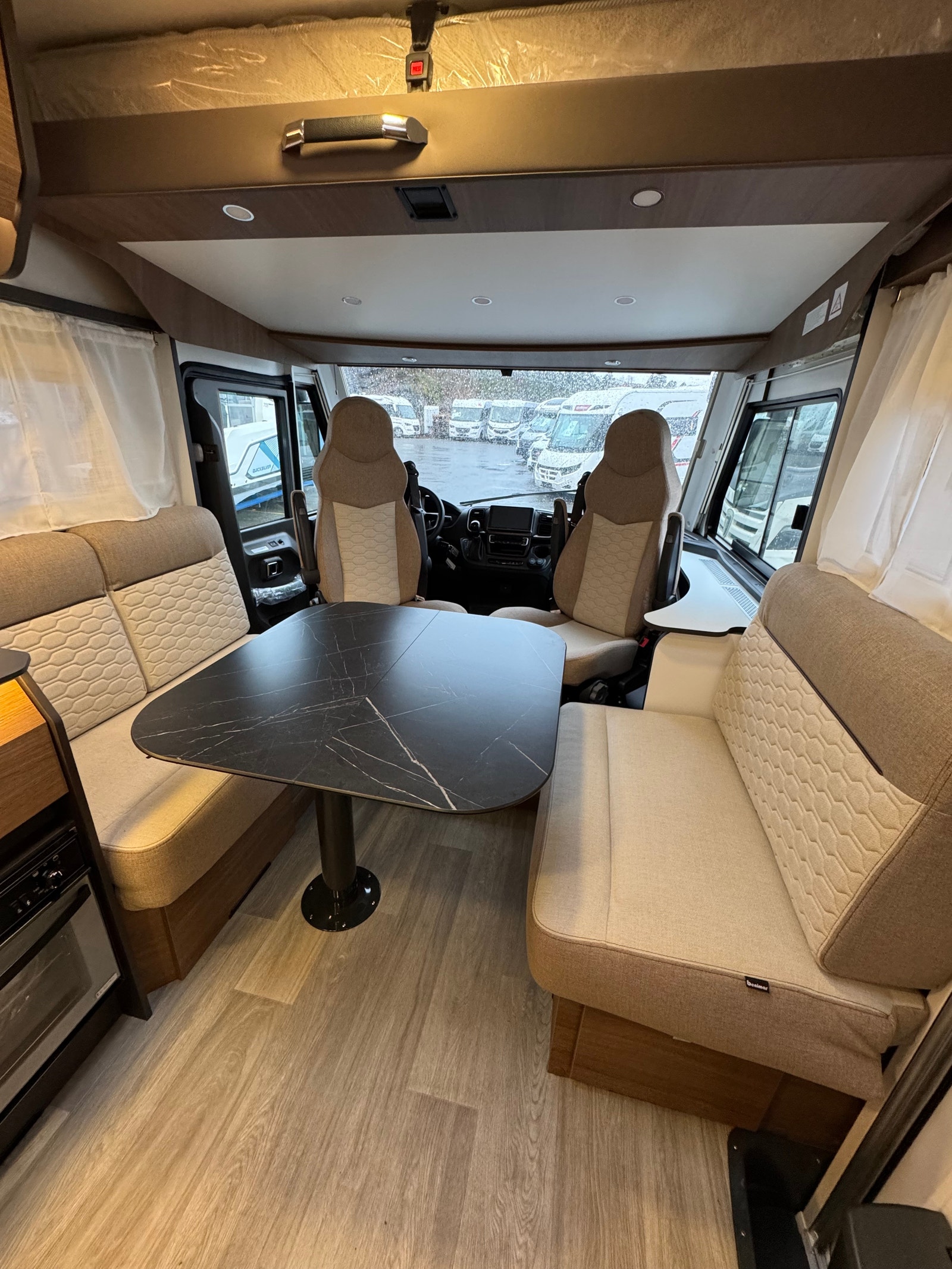«Face to Face» løsningen ved salong gjør at du får en meget romslig sittegruppe, spesielt siden salongbord er foldbart. passasjer 3 og 4 vil også sitte behagelig under kjøring ved denne type løsning. Disse ligger skjult i salong når de ikke er i bruk. Takseng i front kan være nede uten at det går utover salong.