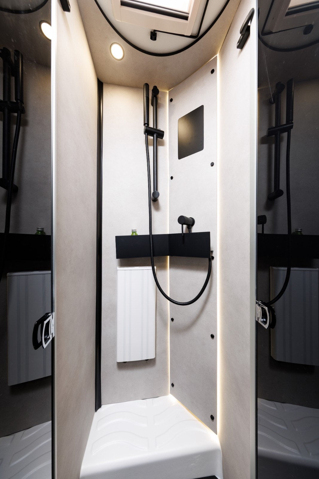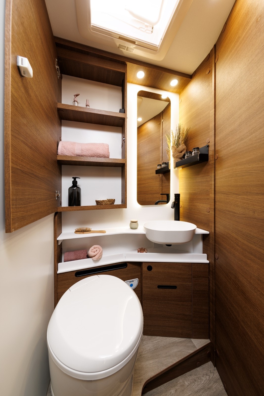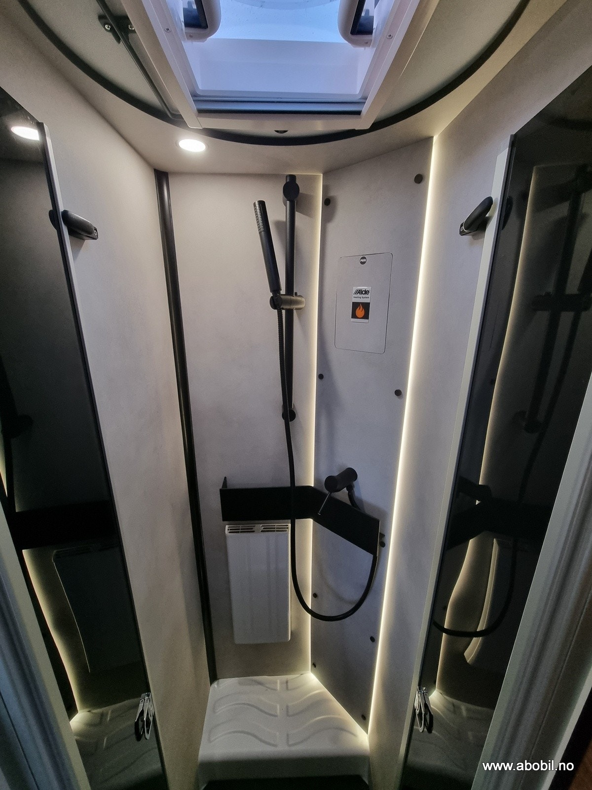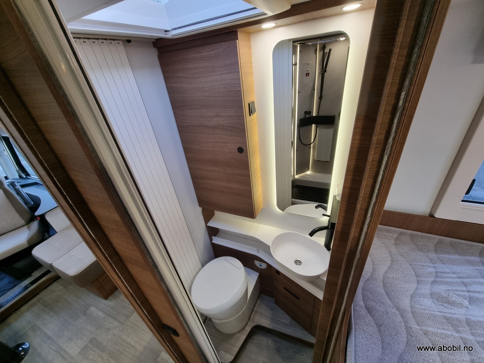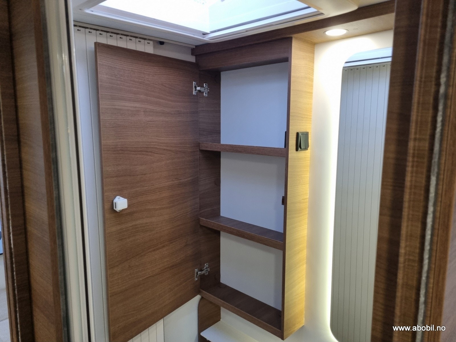 Separat dusj med dør og takluke gir svært god komfort. Dusjen har også nedtrekkbar stang for tørking av klær eller håndklær. Godt vanntrykk, og det er rikelig med skapplass, stort speil og svingbart toalett. Takluken har myggnett og formørkningsgardin – som resten av bodelens åpninger.