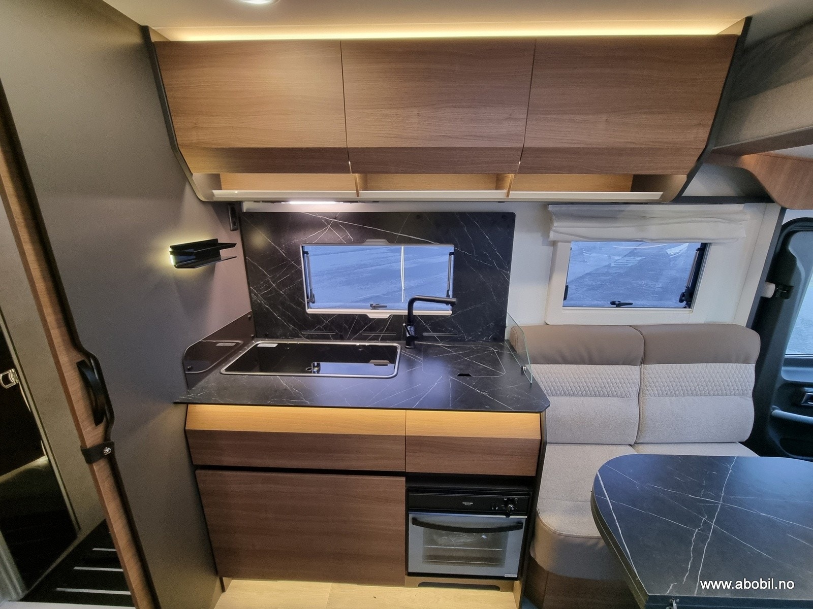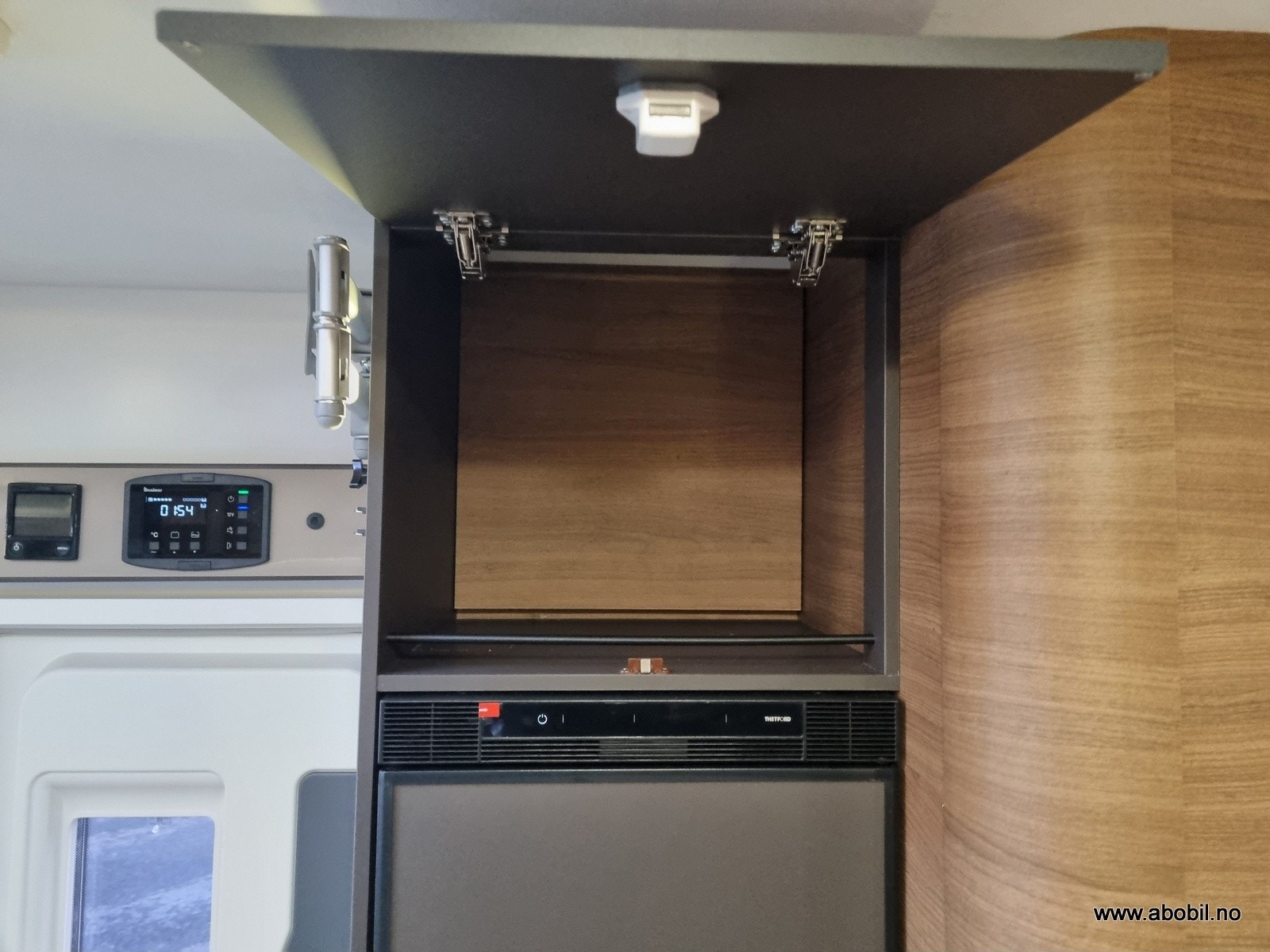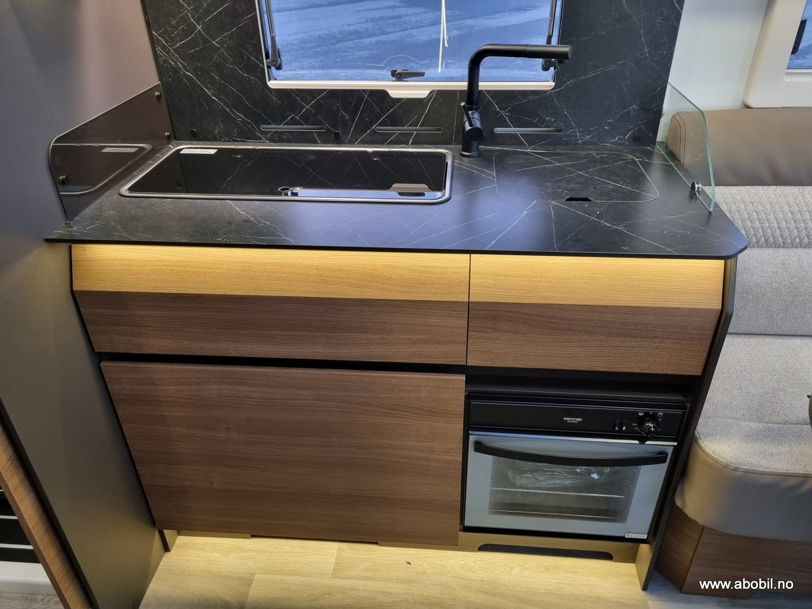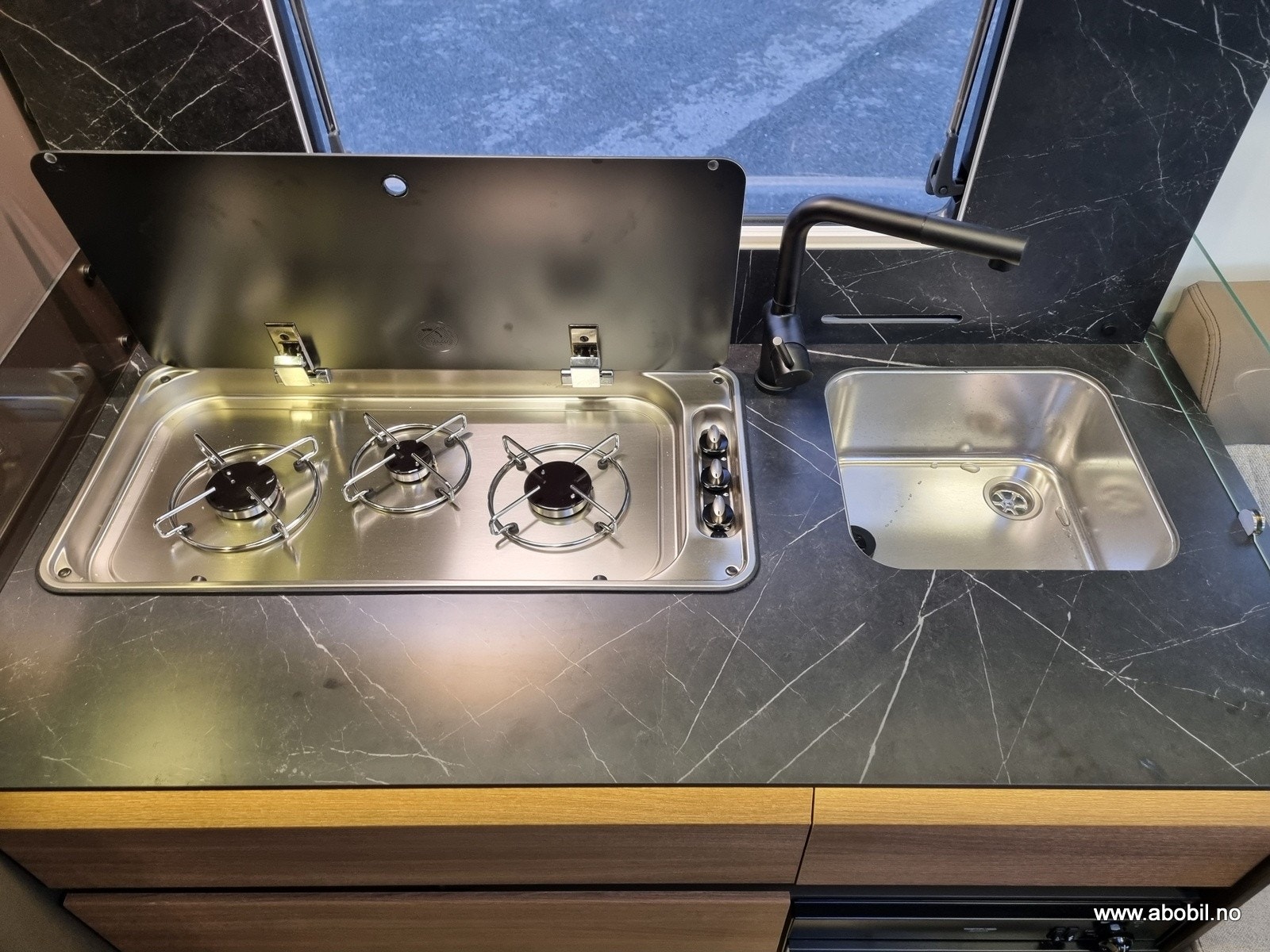 Praktisk og moderne kjøkken med tre gassbluss, elektrisk tenning og todelt glassdeksel som både beskytter og utvider benkeplassen. Stekeovn og kjøkkenvifte sørger for gode matlagingsmuligheter. Romslig vask og store skuffer gir god oppbevaringsplass. Stort automatisk kjøleskap med separat frysedel gjør det enkelt å ta med nok mat på tur. Takluke med myggnett og plisségardin over kjøkkenet gir god ventilasjon.
