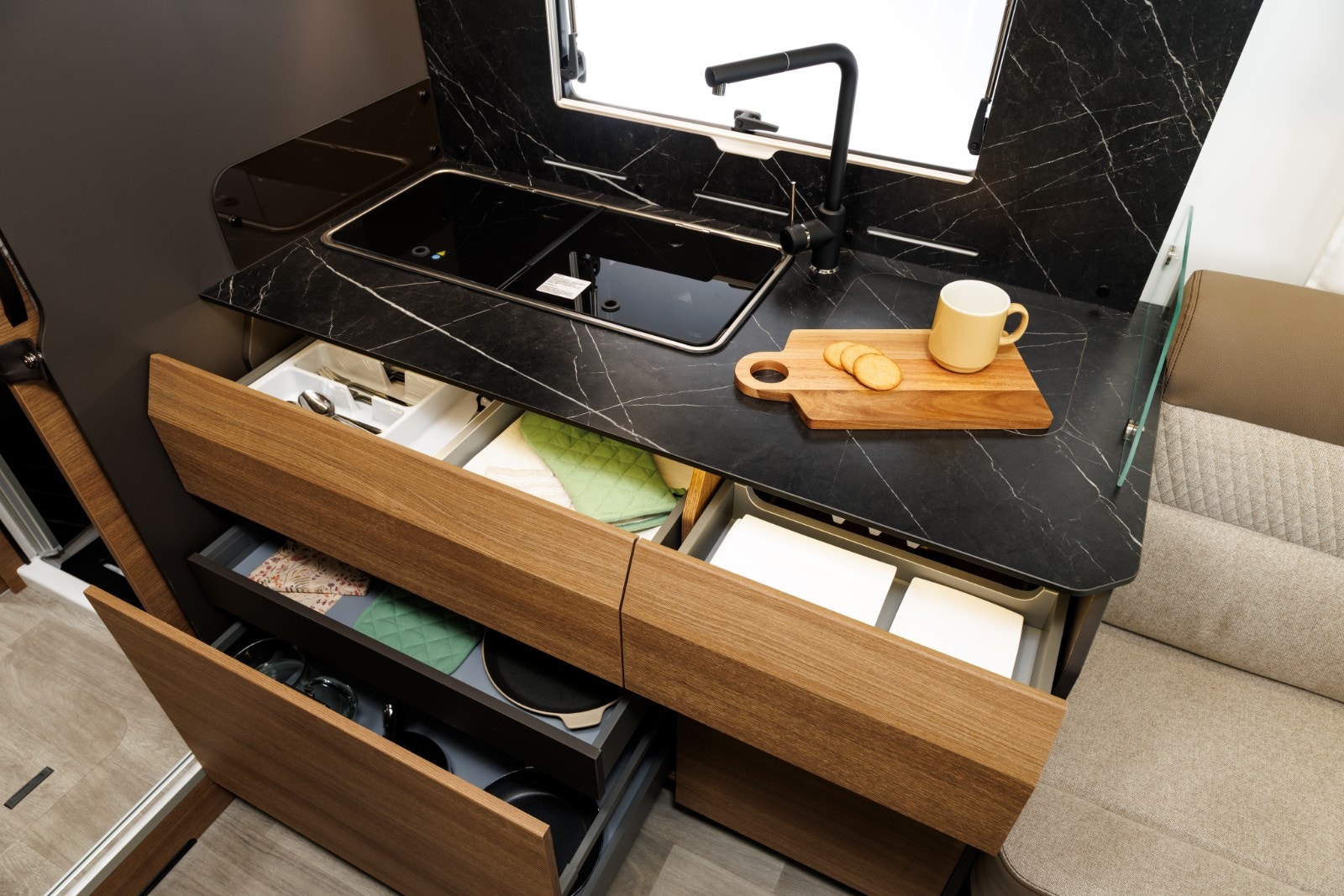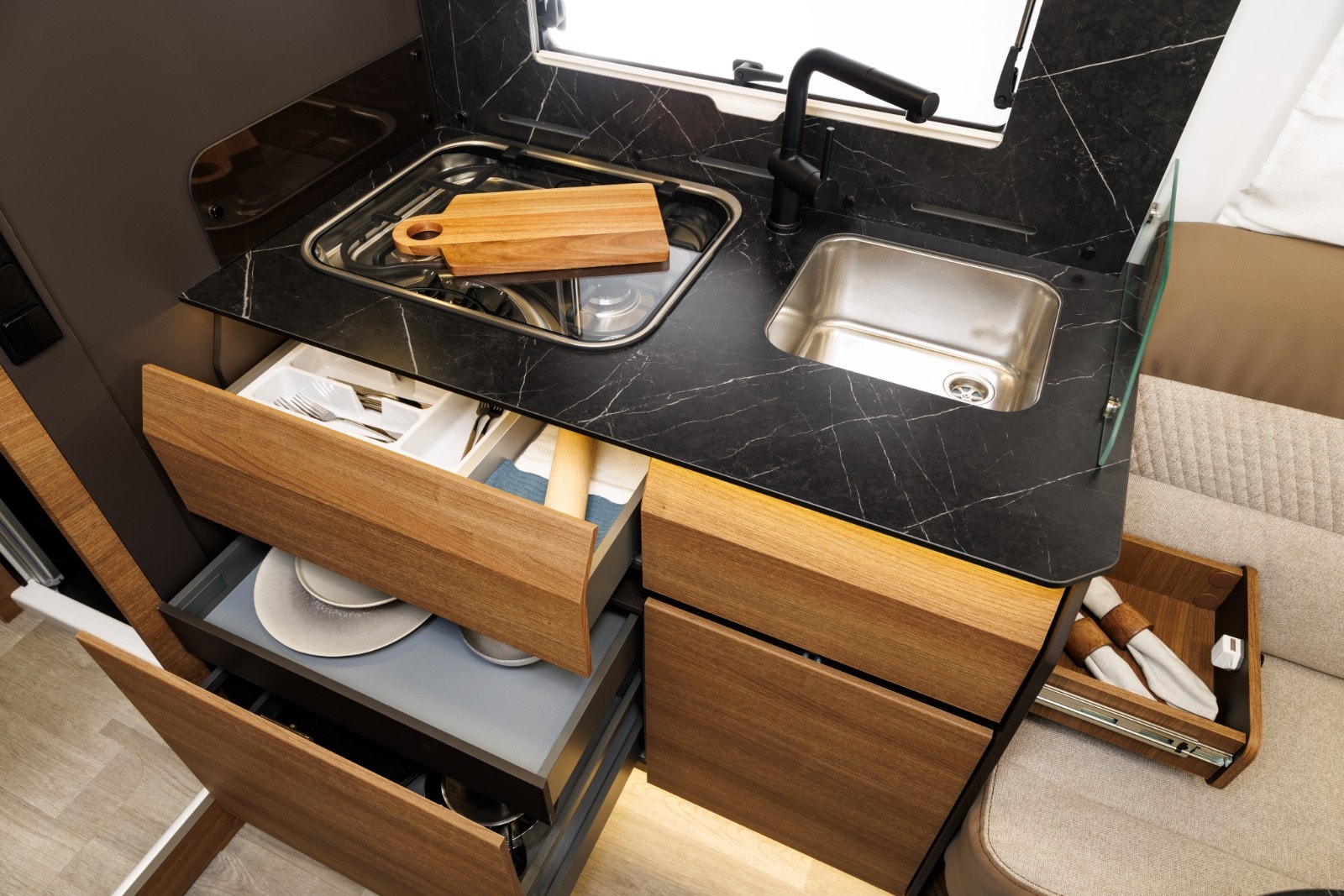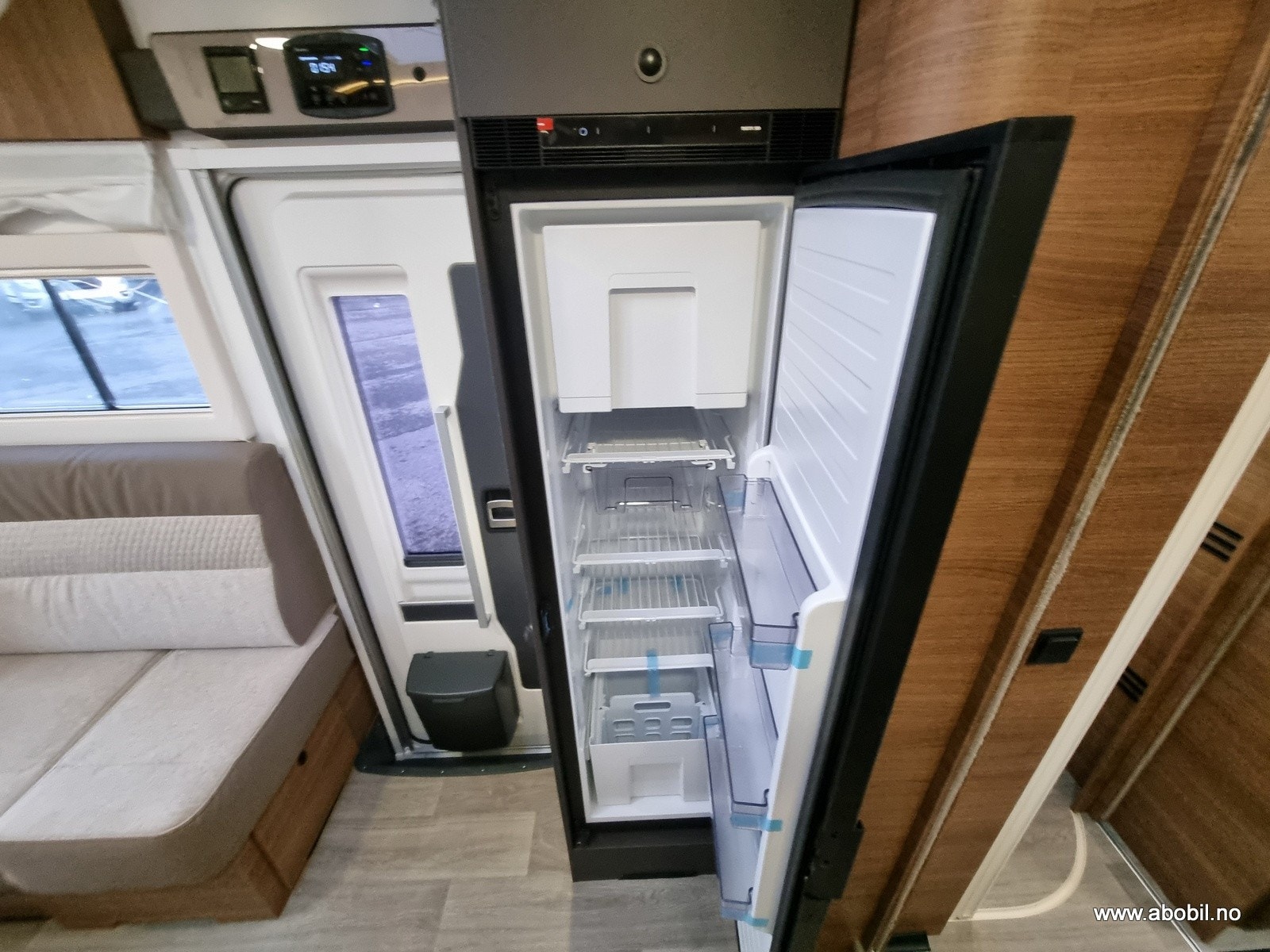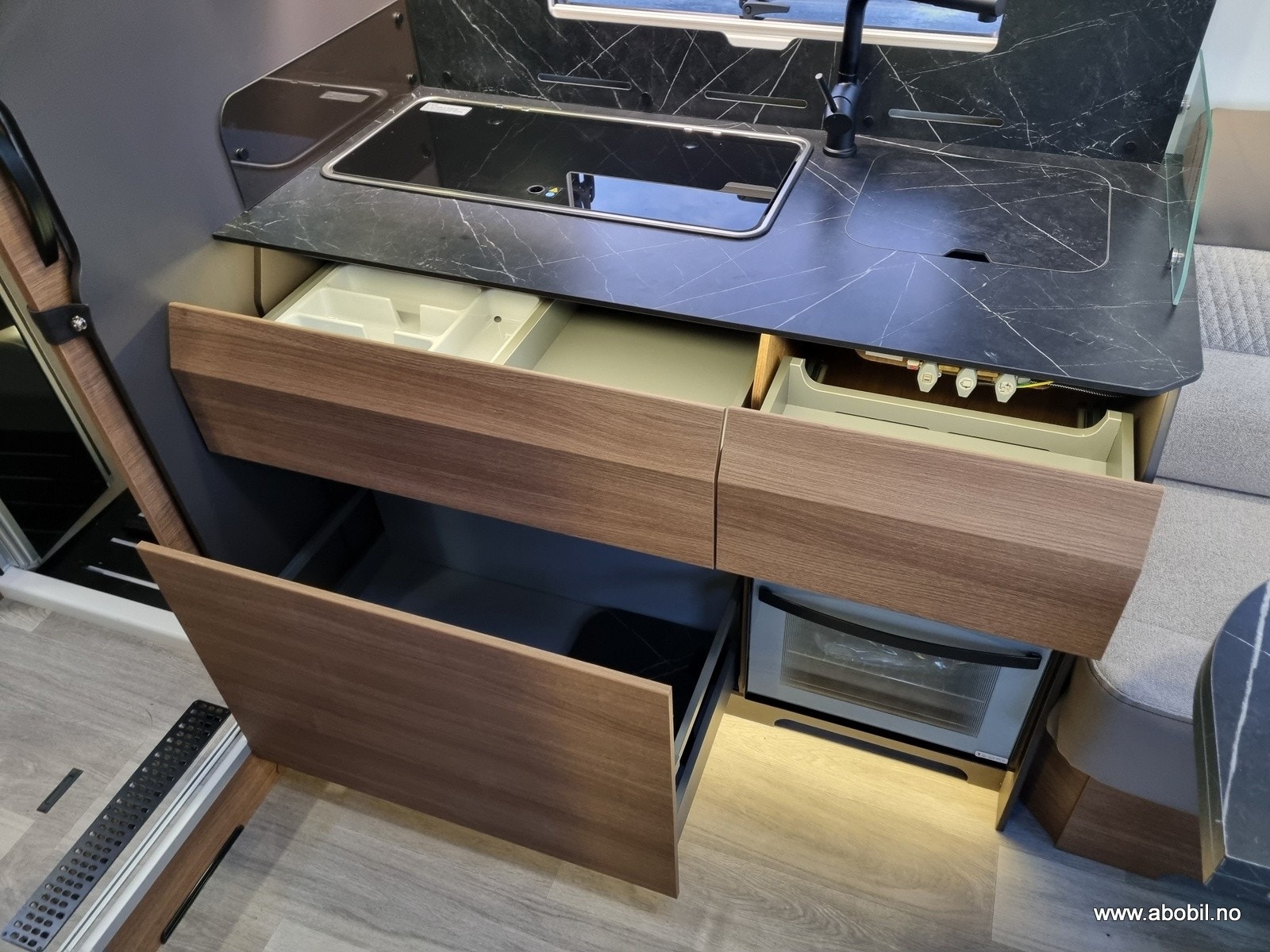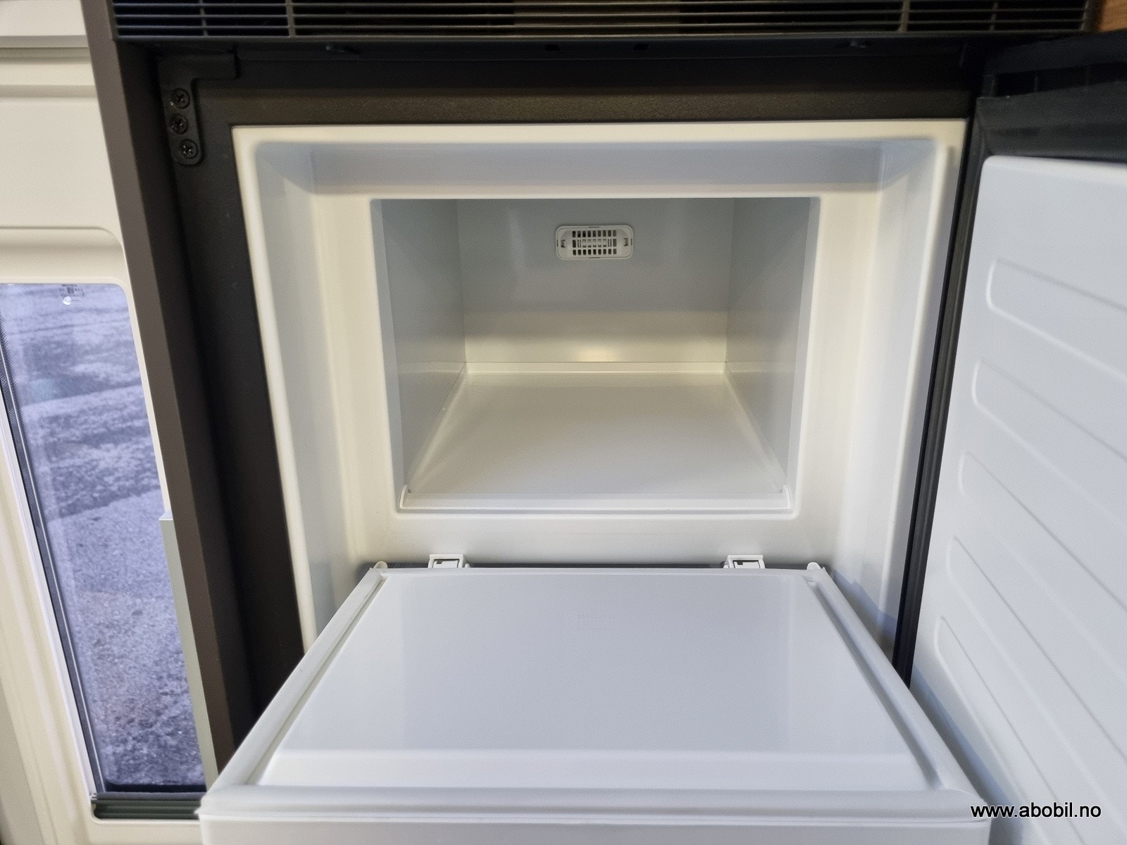 Praktisk og moderne kjøkken med tre gassbluss, elektrisk tenning og todelt glassdeksel som både beskytter og utvider benkeplassen. Stekeovn og kjøkkenvifte sørger for gode matlagingsmuligheter. Romslig vask og store skuffer gir god oppbevaringsplass. Stort automatisk kjøleskap med separat frysedel gjør det enkelt å ta med nok mat på tur. Takluke med myggnett og plisségardin over kjøkkenet gir god ventilasjon.