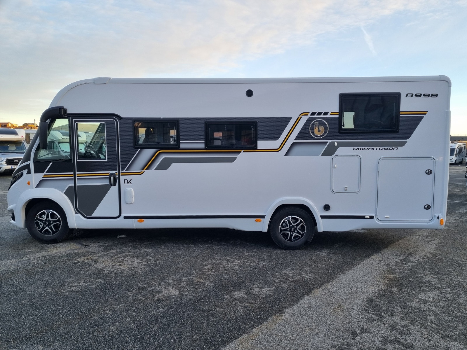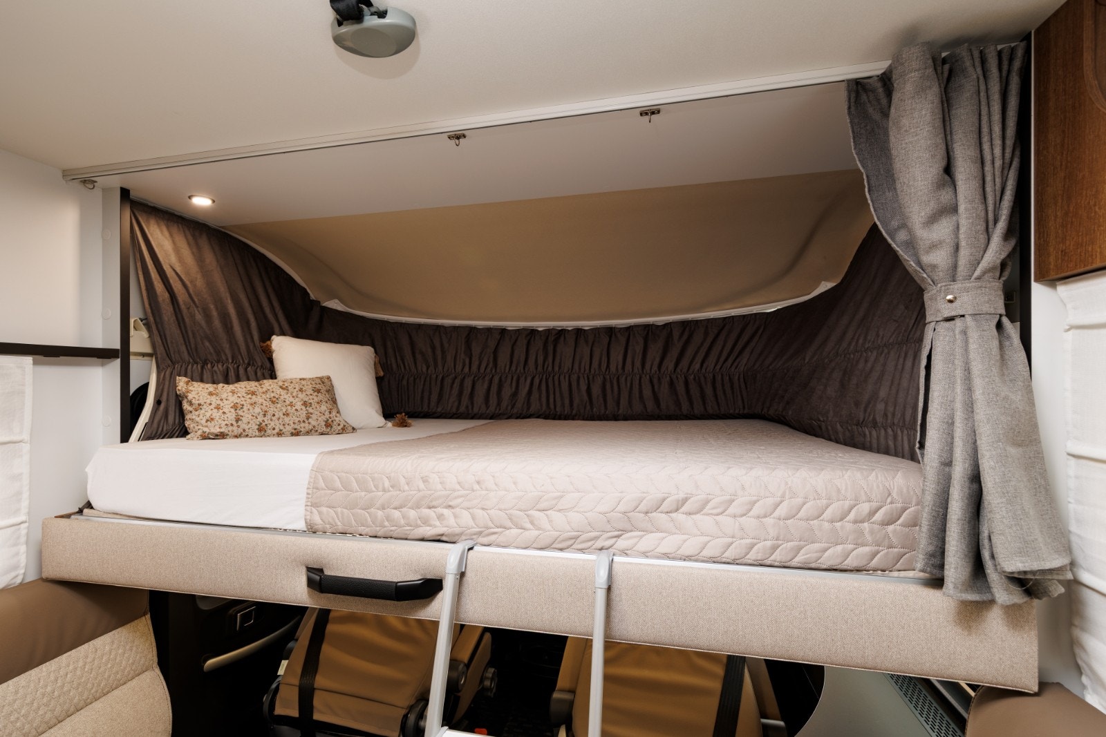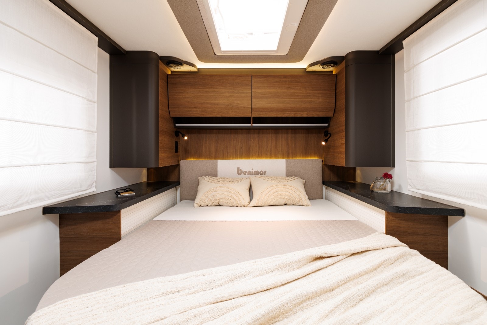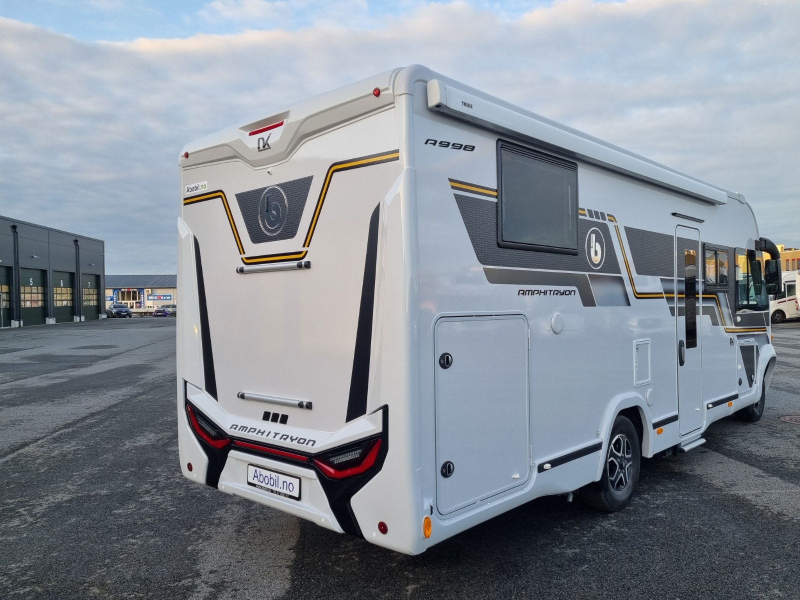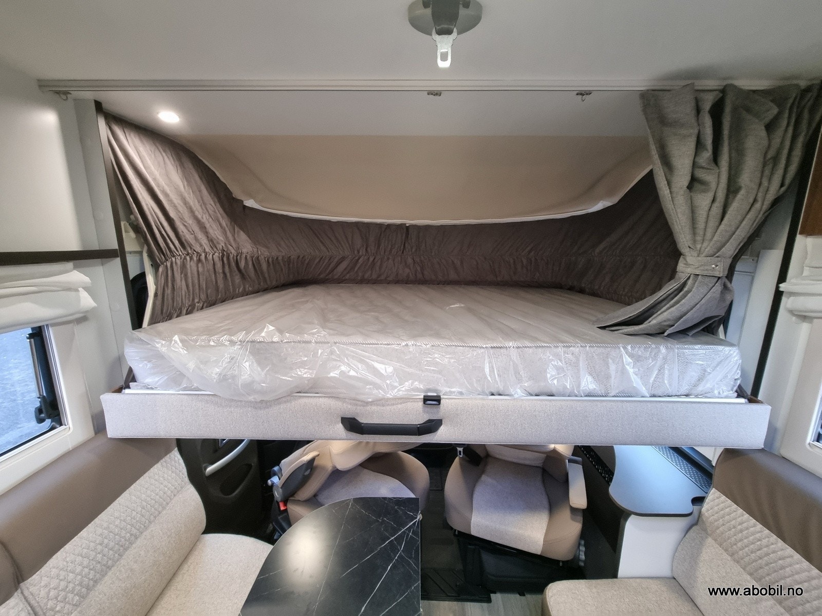 Amphitryon 998 er registrert for 4 personer og har en romslig queen bed bak med 20 cm tykke madrasser. Det finnes garderobeskap og god lagring under sengen. En elektrisk senkeseng foran gir ytterligere to soveplasser og tåler hele 250 kg. Praktisk skilledør mellom soverom og salong/bad gir ekstra privatliv.