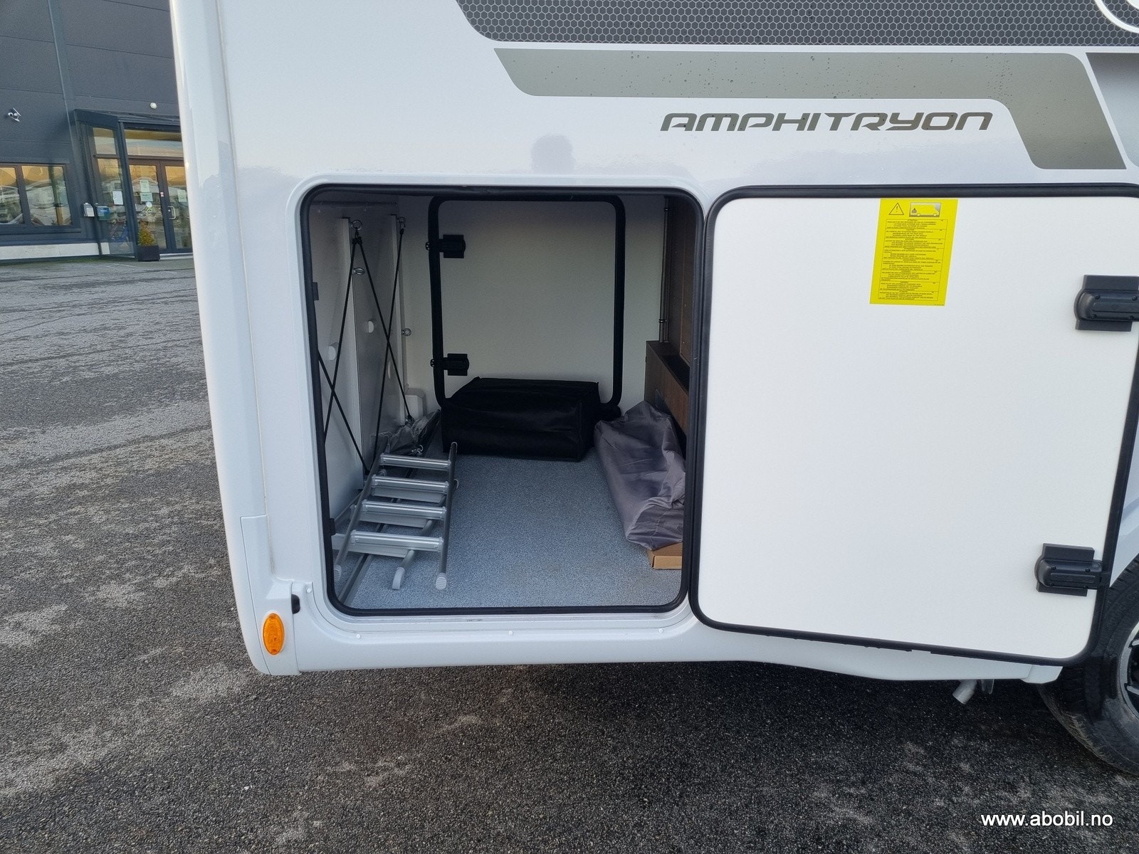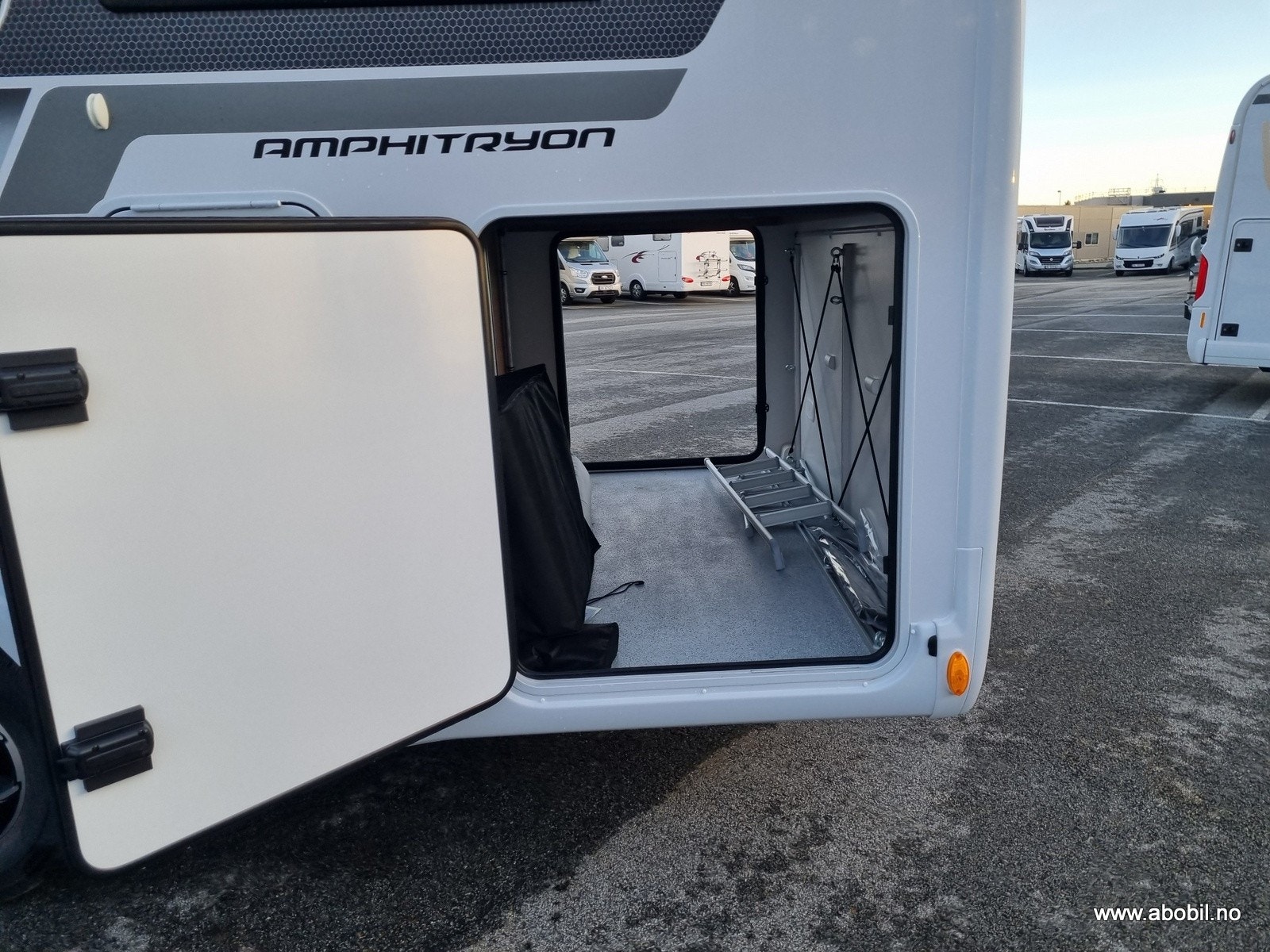 Benimar Amphitryon 998 har en stor garasje med tilgang fra begge sider. Den er utstyrt med lys, varme og solide surrefester – perfekt for sykler, grill, bord og turutstyr. Elektrisk stigtrinn for enkel inn-/utstigning og isolert innsteg sørger for komfort året rundt.