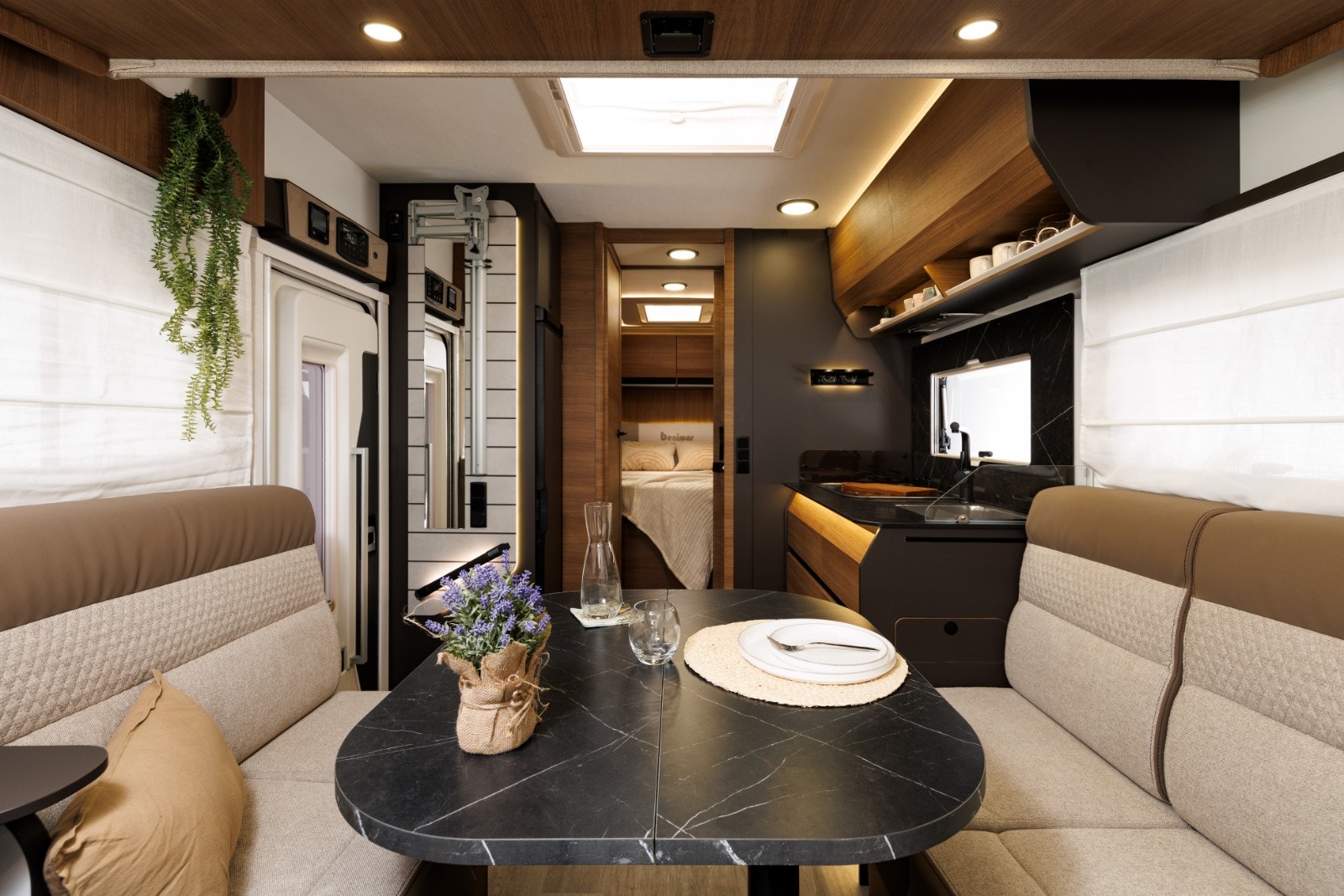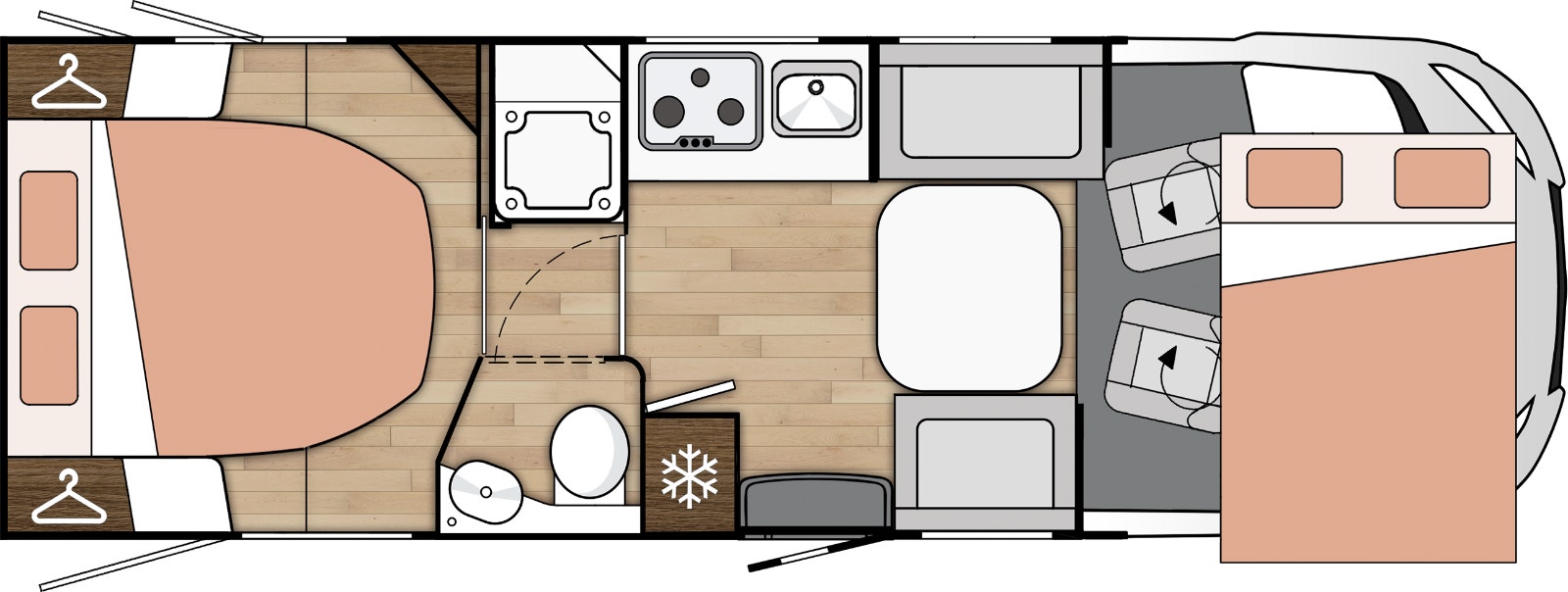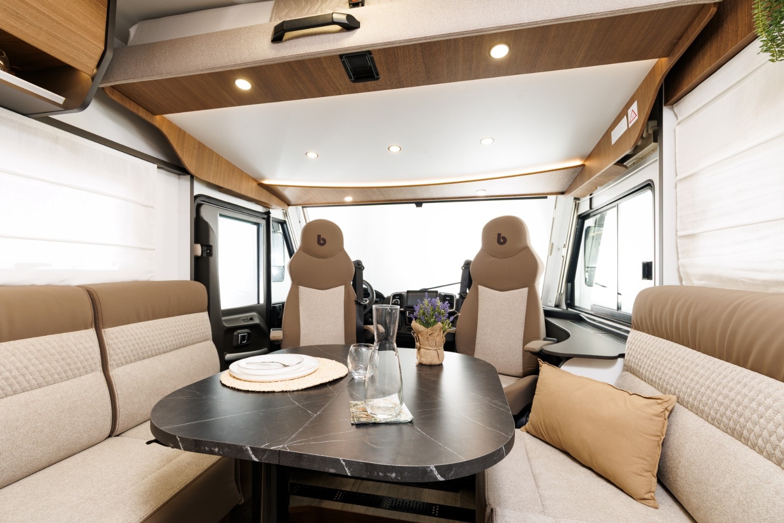 Salongen består av to svingbare pilotstoler og romslig sittegruppe – perfekt for både måltider og avslapping. Store vinduer og panorama takluke gir masse naturlig lys. TV-plass med 12V og 230V strømuttak er klart til bruk. Myggnett og mørkleggingsgardiner er standard på alle åpninger.