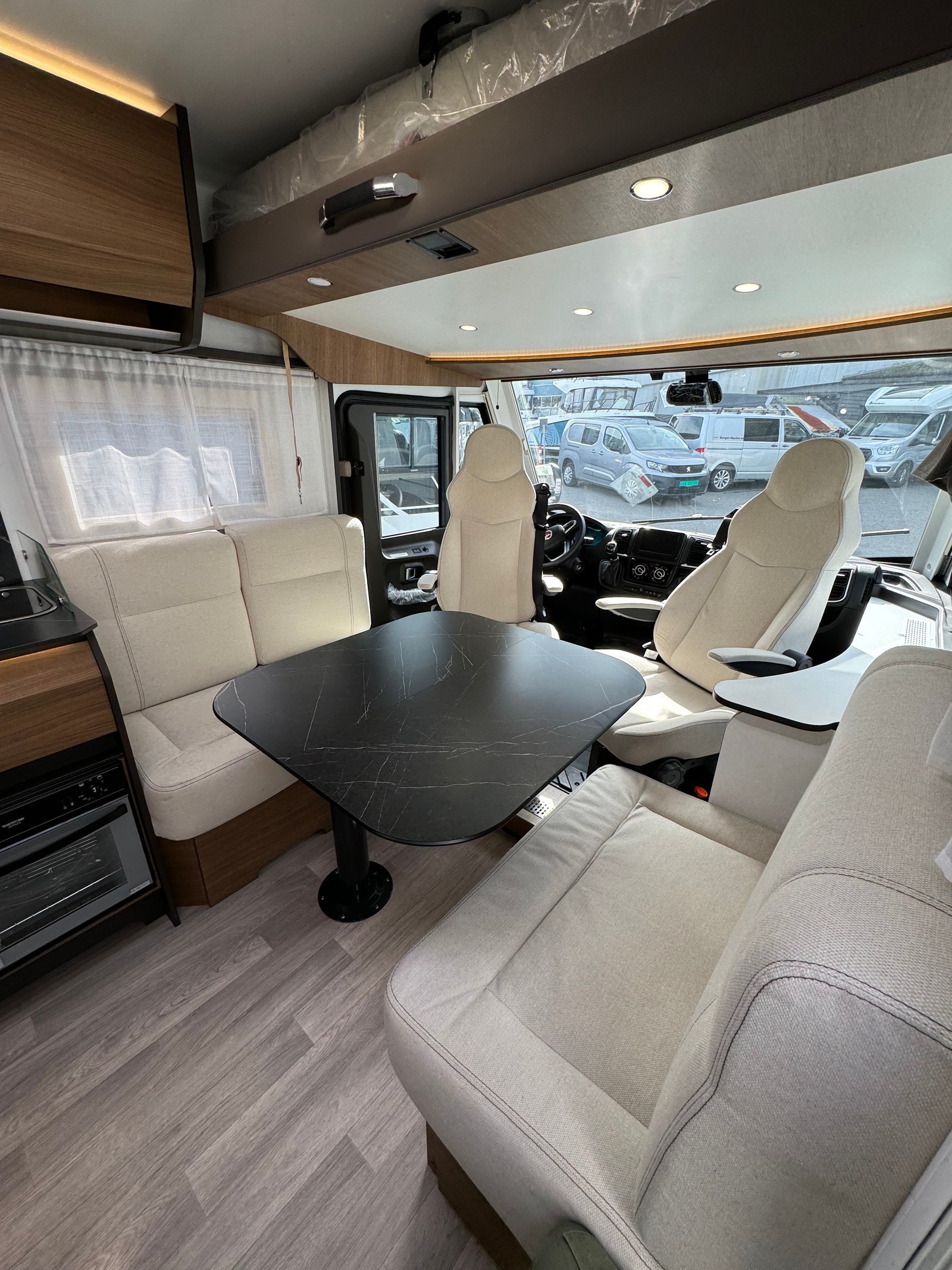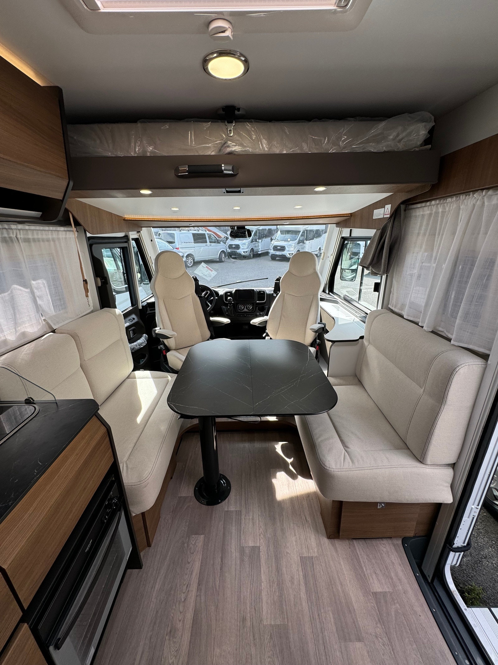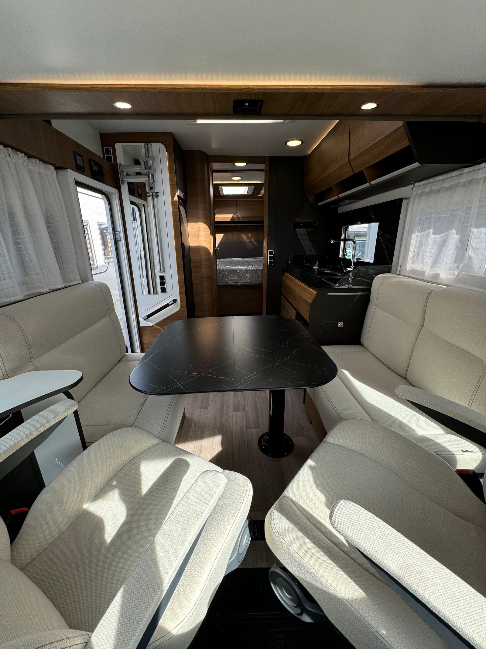 «Face to Face» løsningen ved salong gjør at du får en meget romslig sittegruppe, siden salongbordet er foldbart. Med 2 skjulte passasjerstoler i salongen sitter nr 3 og 4 også svært behagelig under transportetappene.