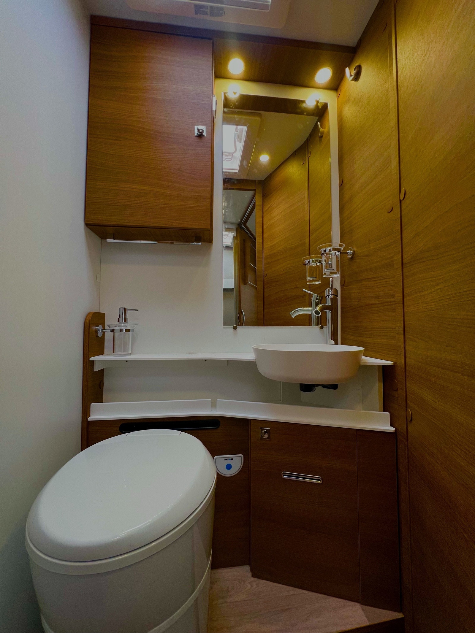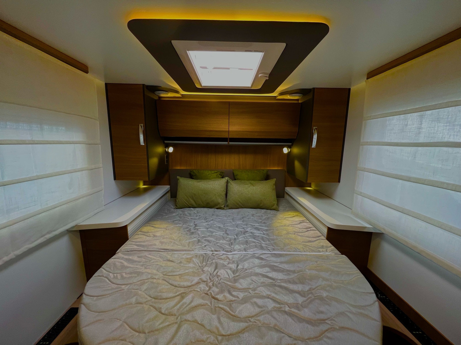 Bak er det midtstilt Queenbed med regulerbar senking og heving, separat toalett og dusj med skyvedør frem mot kjøkken.