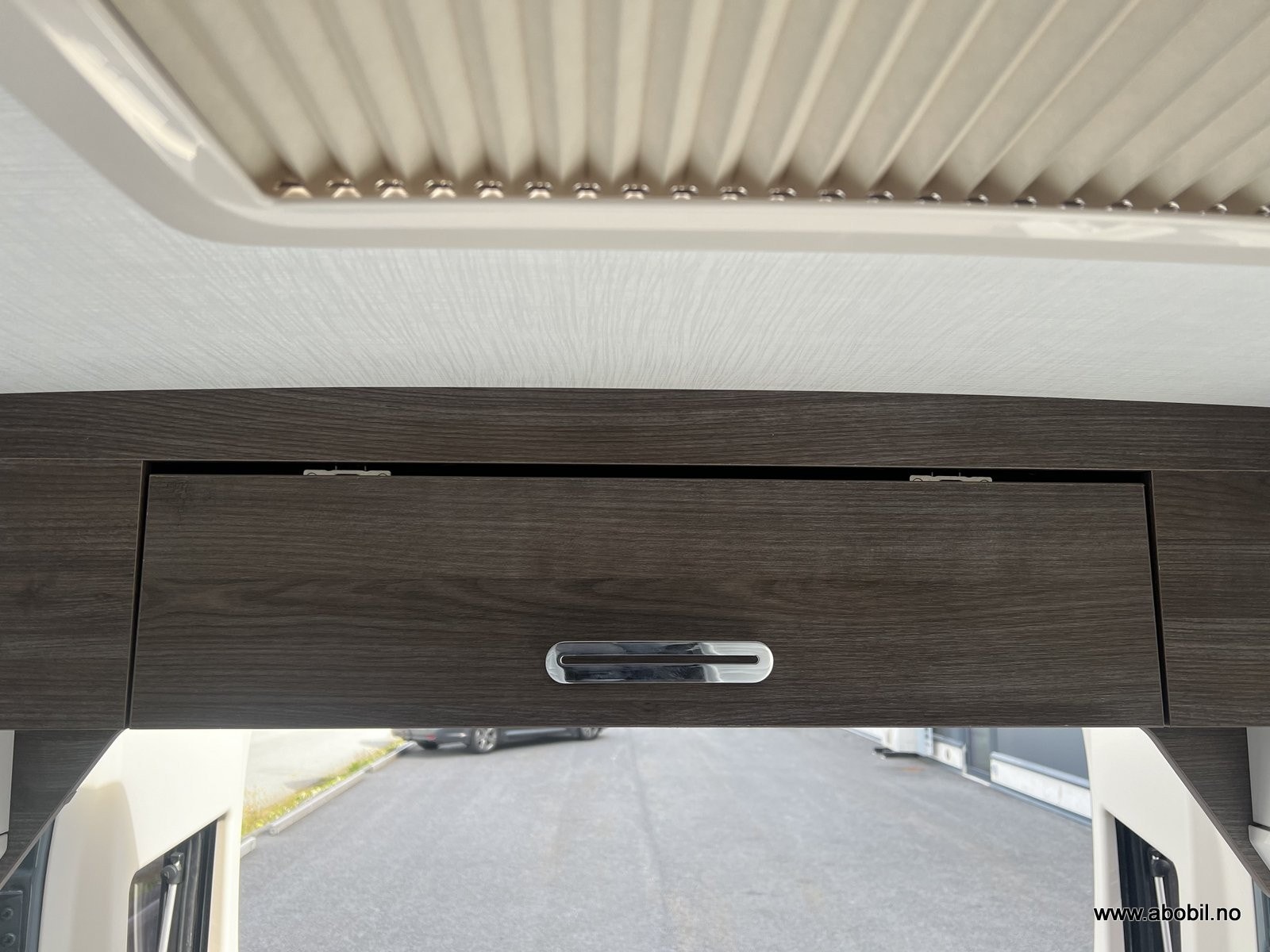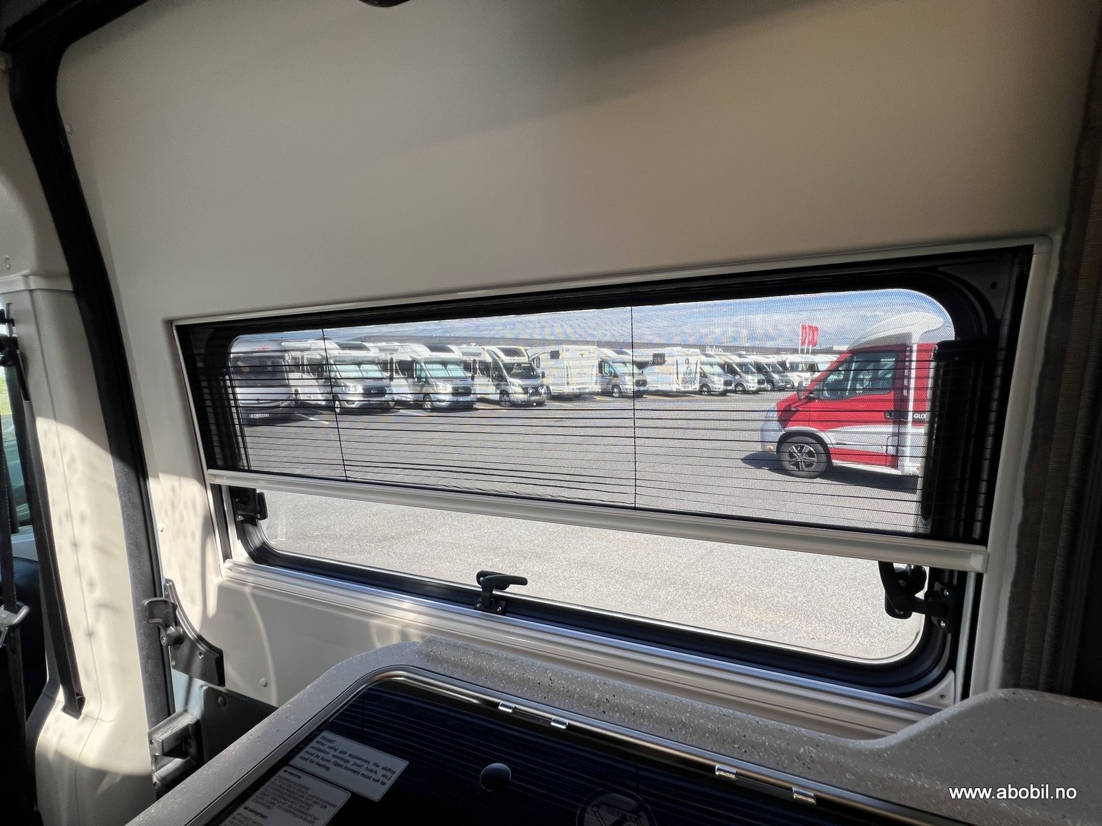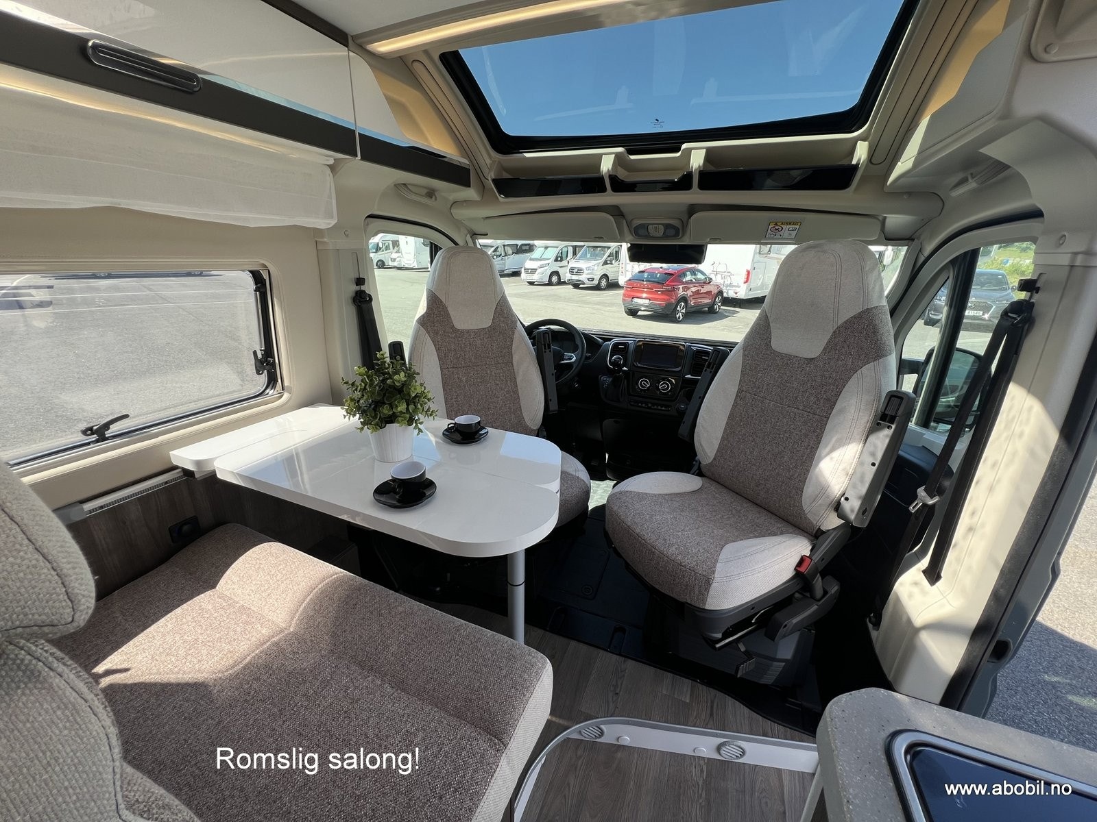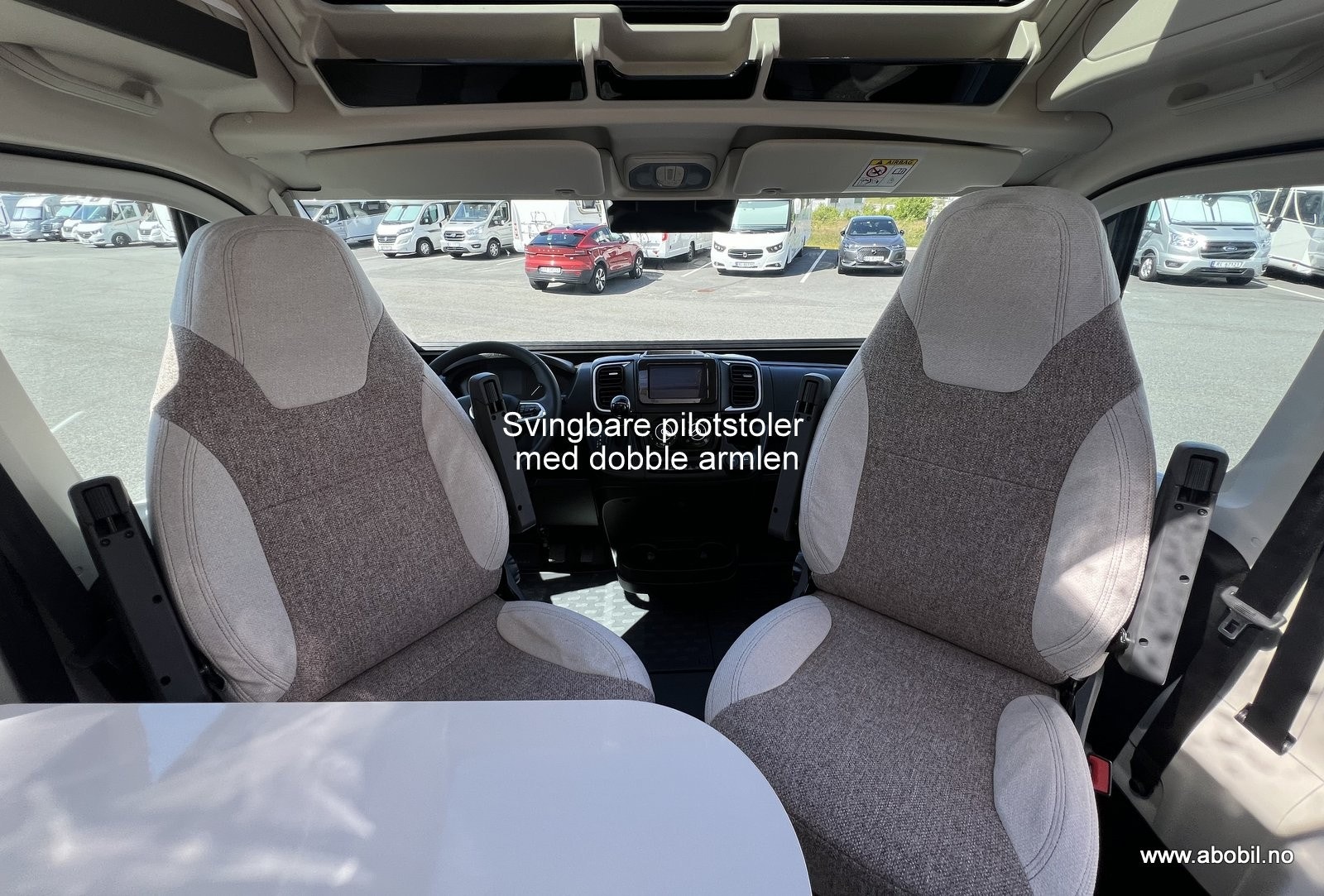 Førerdelen har også ryggekamera, skinnratt, Gardiner til formørkning, Regulerbare pilotstoler med armlene, varme i speil og regulerbart ratt. Denne bobilen oppleves nærmest som en flott personbil både i kjøreegenskaper og størrelse. Nydelig dagslys gjennom soltaket får du også!