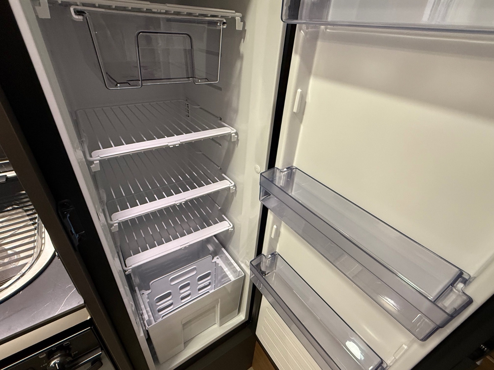 Flott kjøkken med 3 kokebluss med tenning og kjøkkenvifte, dyp vask, god plass i skapene til kopper og kar. Skuffene har demping. Kjøleskapet er på hele 140 l med separat del til 6×1,5 l flasker. Selvsagt fryseboks øverst.