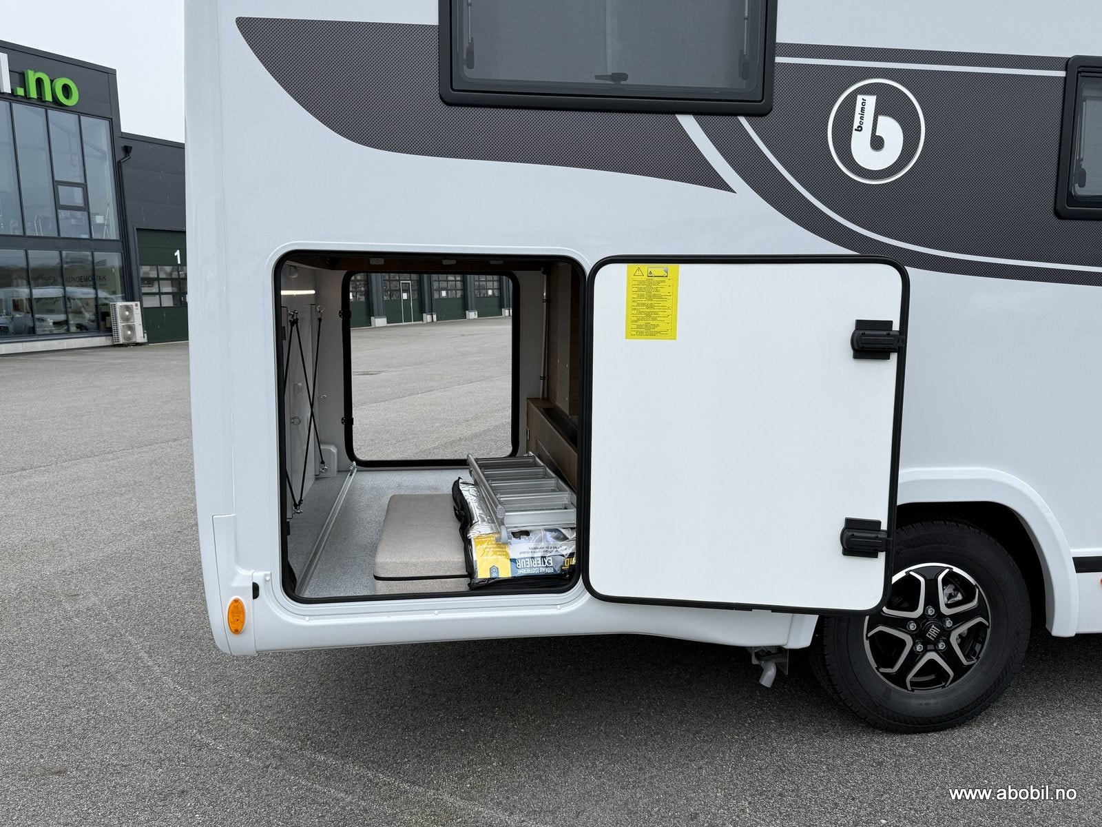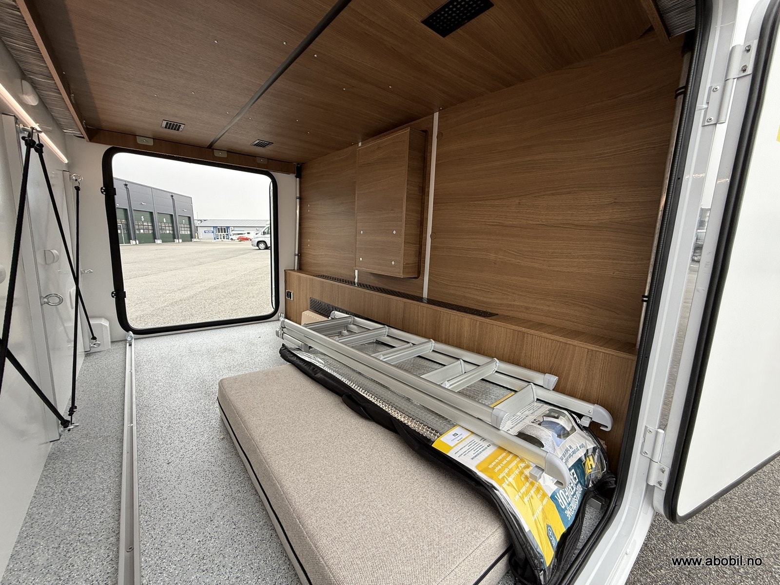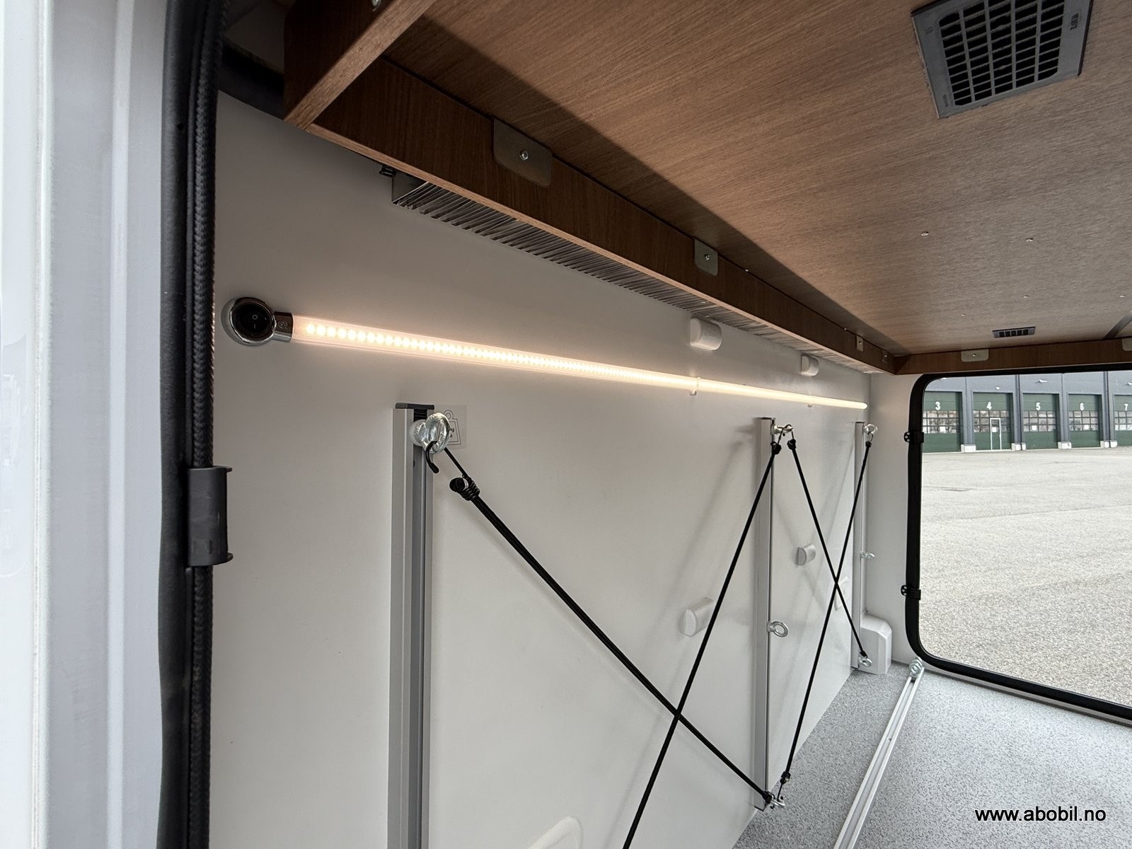 Lasterommet har god takhøyde med gode muligheter til å oppbevare feks El-sykler. I tillegg er det lett tilgjengelig 12v og 230v når du ønsker å lade syklene eller holde mat og drikke kald i kjøleboksen. Det beste av alt – garasjen har to utvendige dører i tillegg til at du har tilgang under sengen fra innsiden!