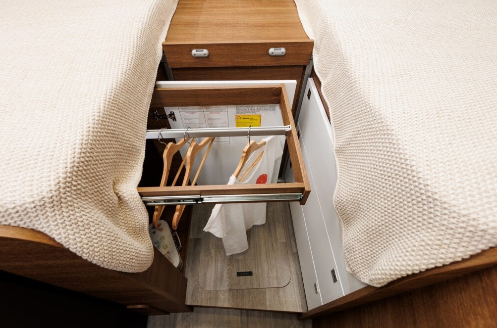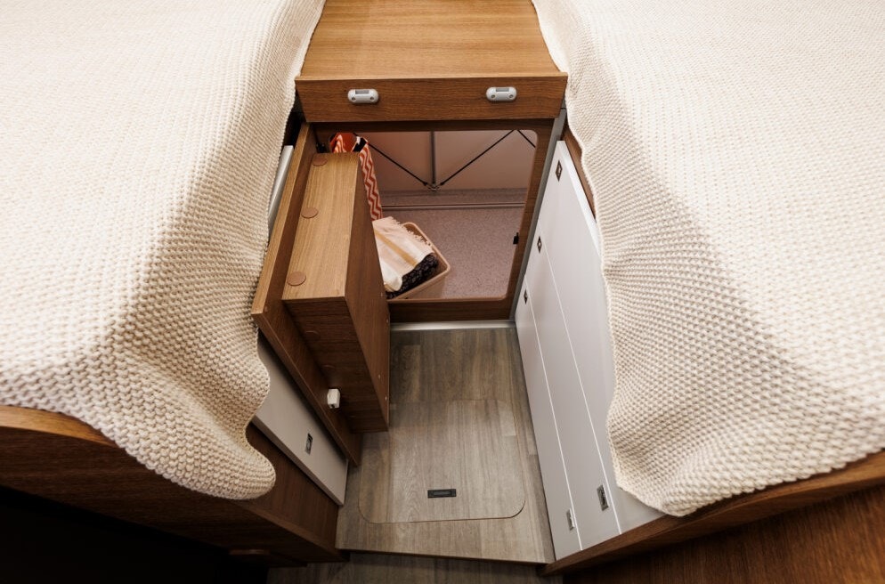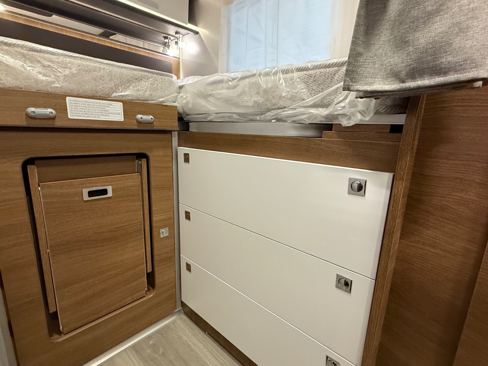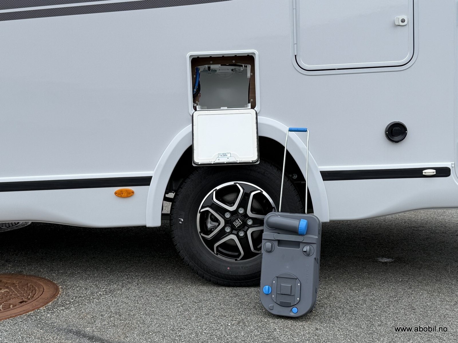 Lasterommet har god takhøyde med gode muligheter til å oppbevare feks El-sykler. I tillegg er det lett tilgjengelig 12v og 230v når du ønsker å lade syklene eller holde mat og drikke kald i kjøleboksen. Det beste av alt – garasjen har to utvendige dører i tillegg til at du har tilgang under sengen fra innsiden!