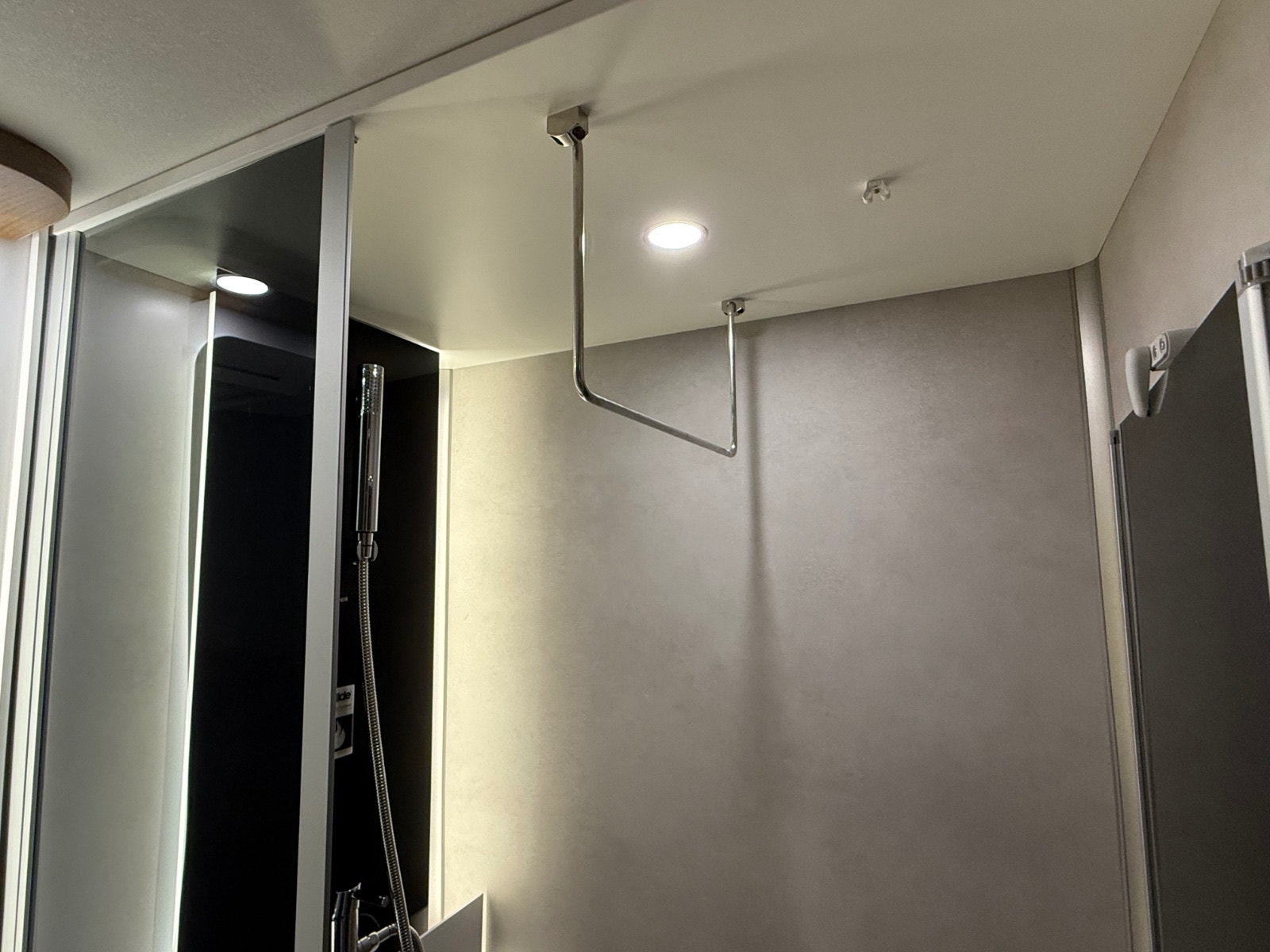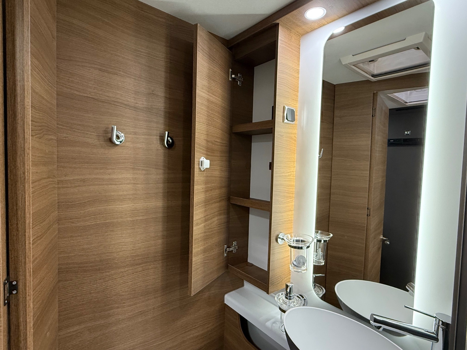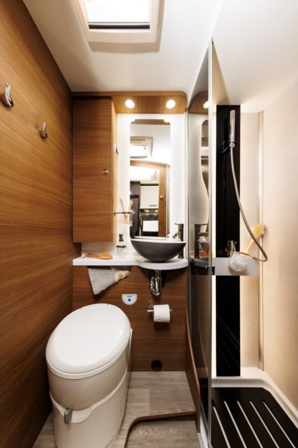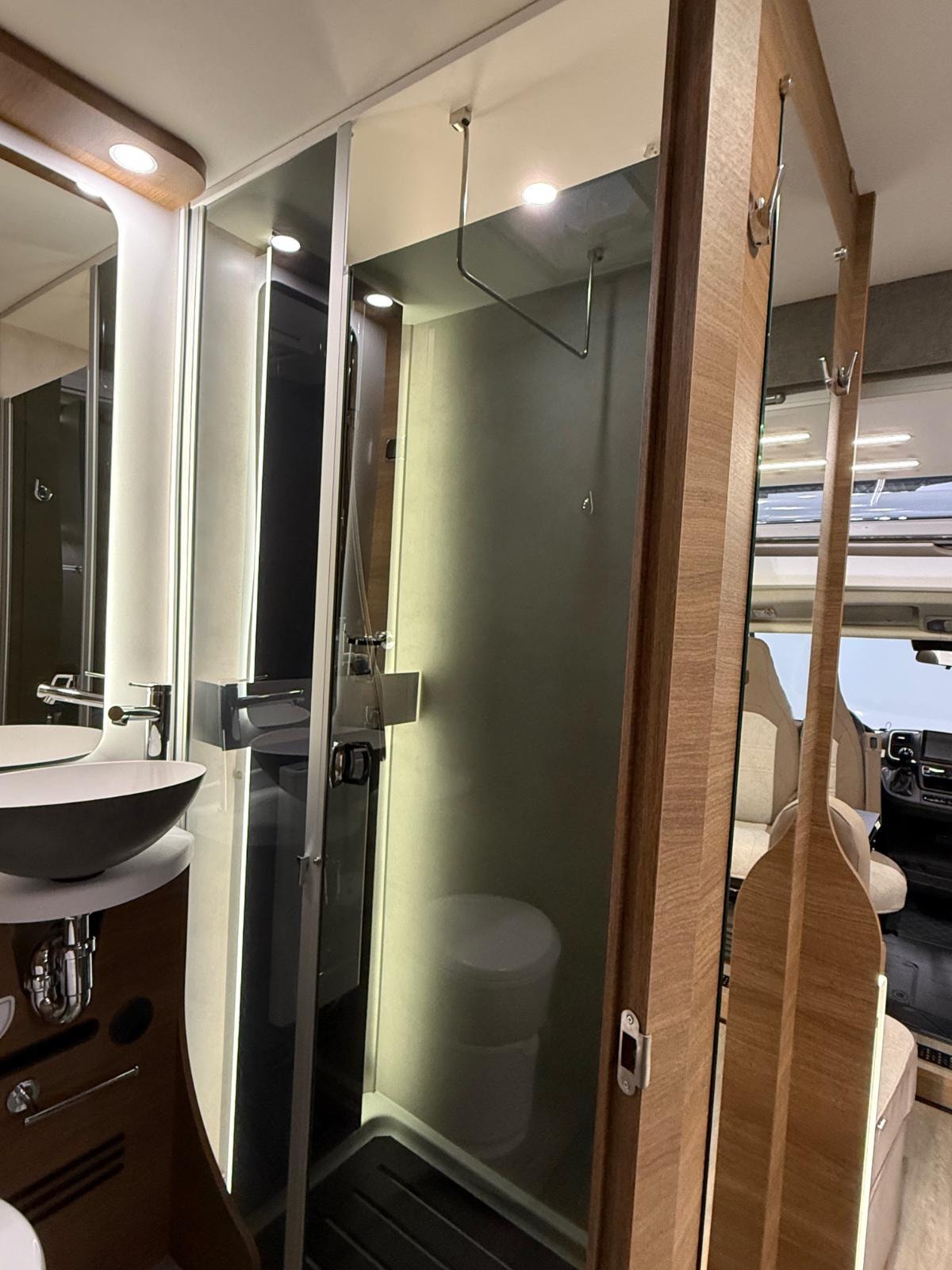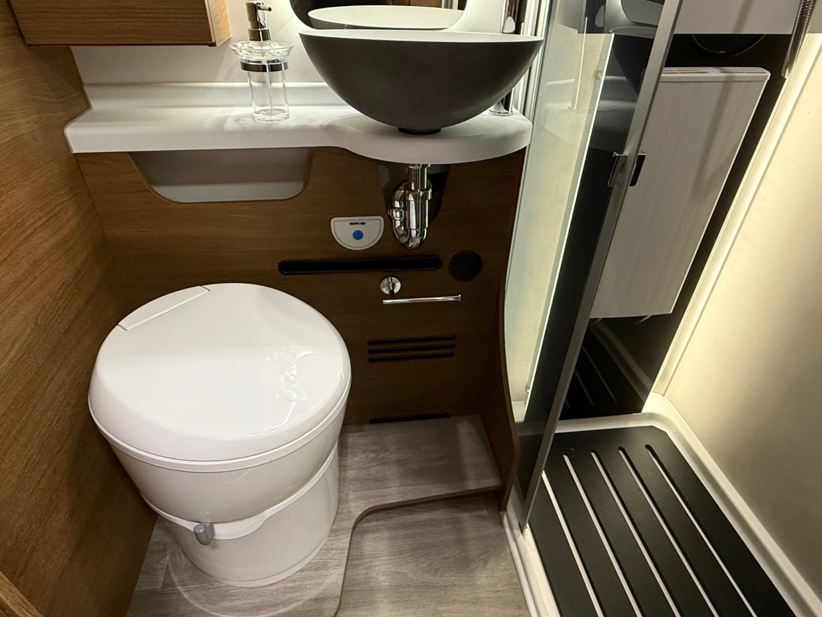 Badet er jo en drøm med nesten 1 meter bred separat dusj! I tillegg har du god skapplass og tørkemuligheter i taket inni dusjen. En stor fordel om du kommer med klissvåte klær tilbake fra dagens powerwalk. Badet har takluke så her kan du lufte godt ut ved behov. Toalettet er selvsagt svingbart fra Thetford.