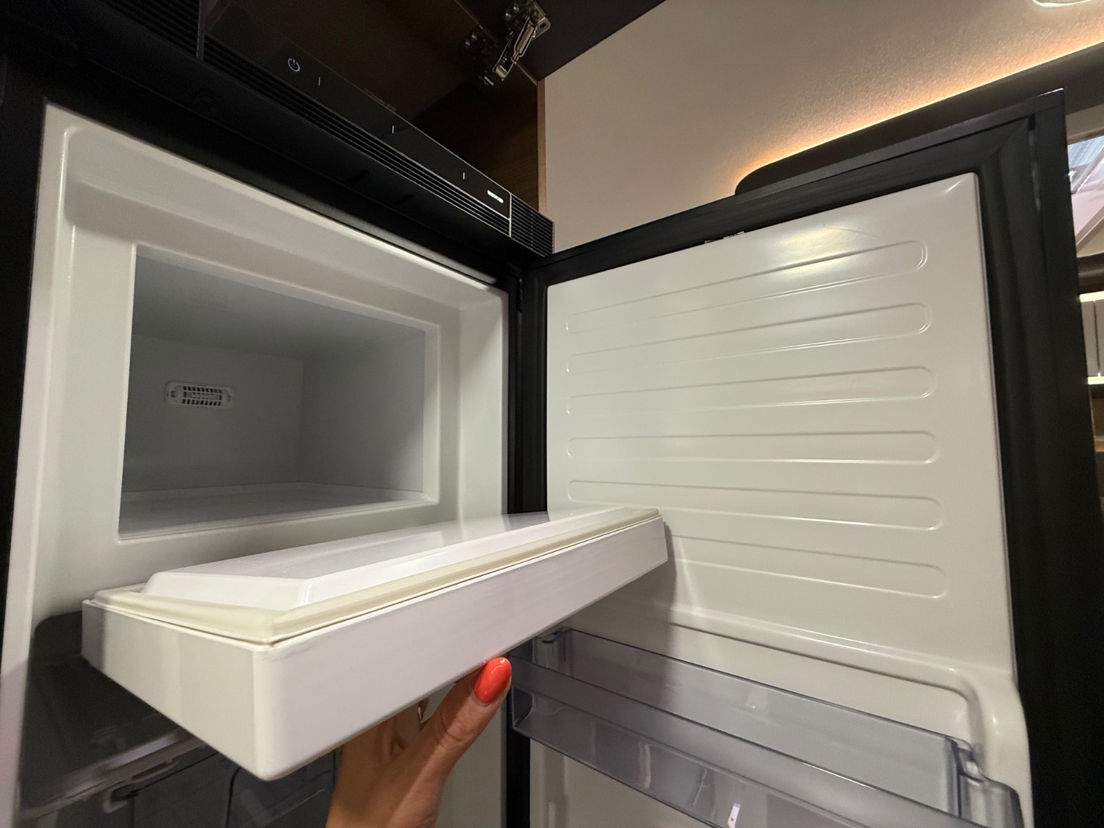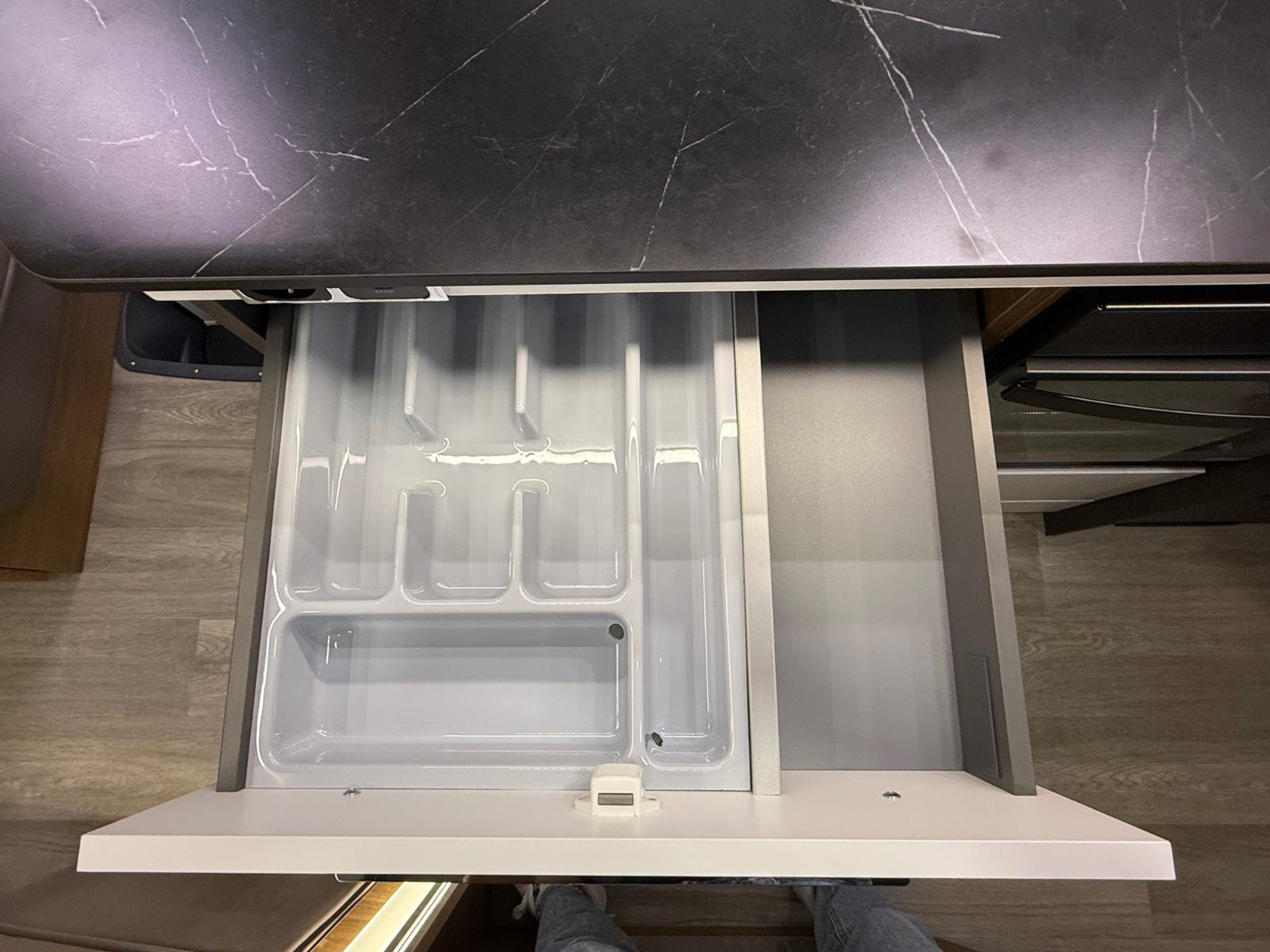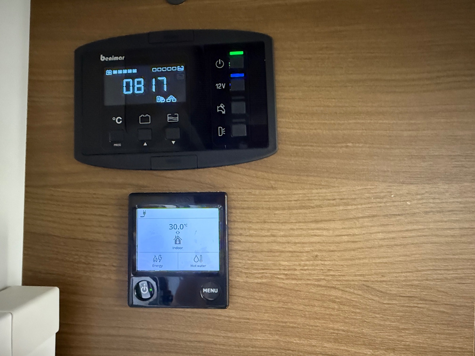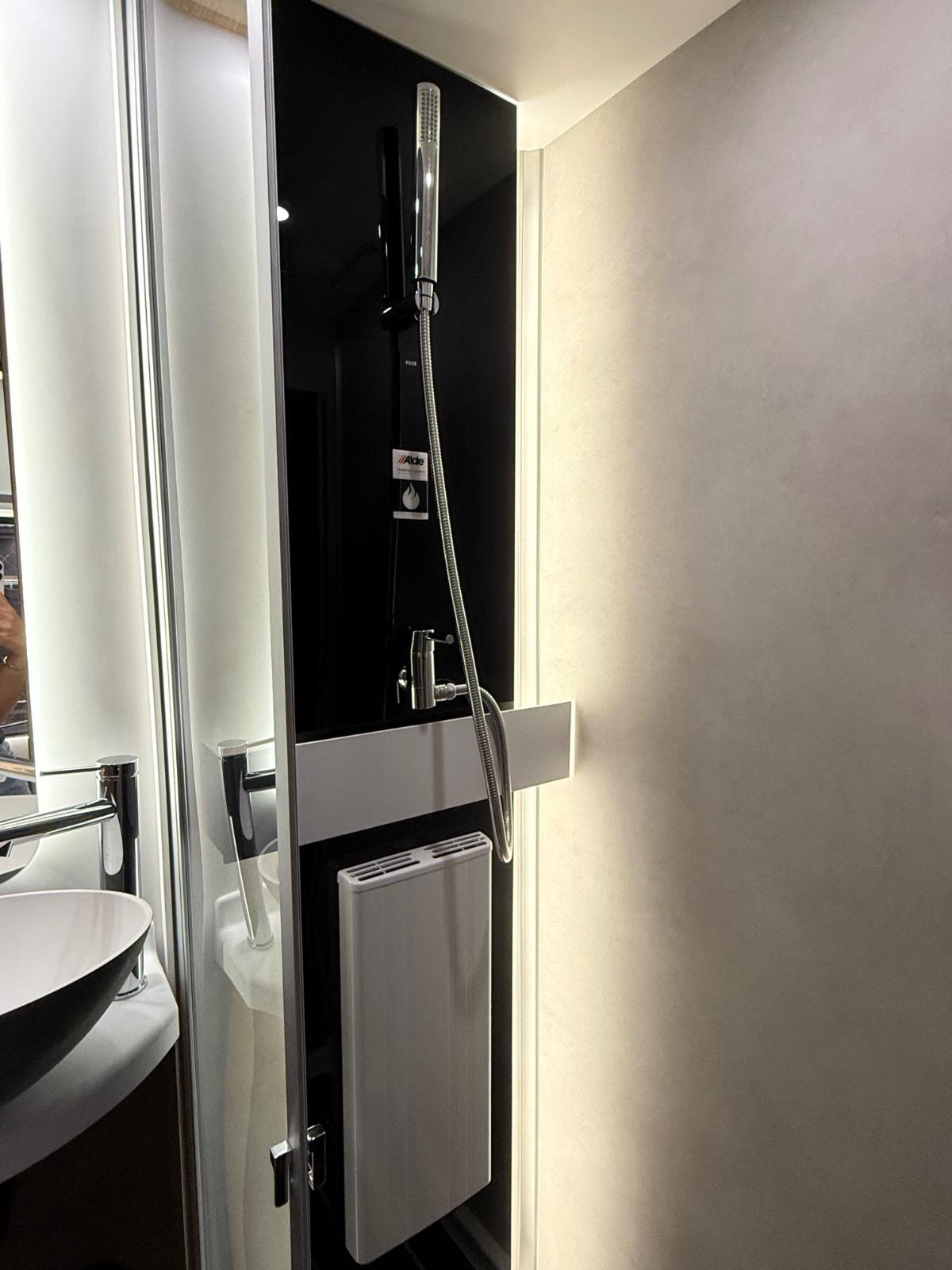 Badet er jo en drøm med nesten 1 meter bred separat dusj! I tillegg har du god skapplass og tørkemuligheter i taket inni dusjen. En stor fordel om du kommer med klissvåte klær tilbake fra dagens powerwalk. Badet har takluke så her kan du lufte godt ut ved behov. Toalettet er selvsagt svingbart fra Thetford.