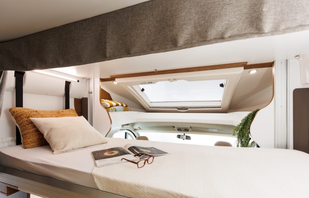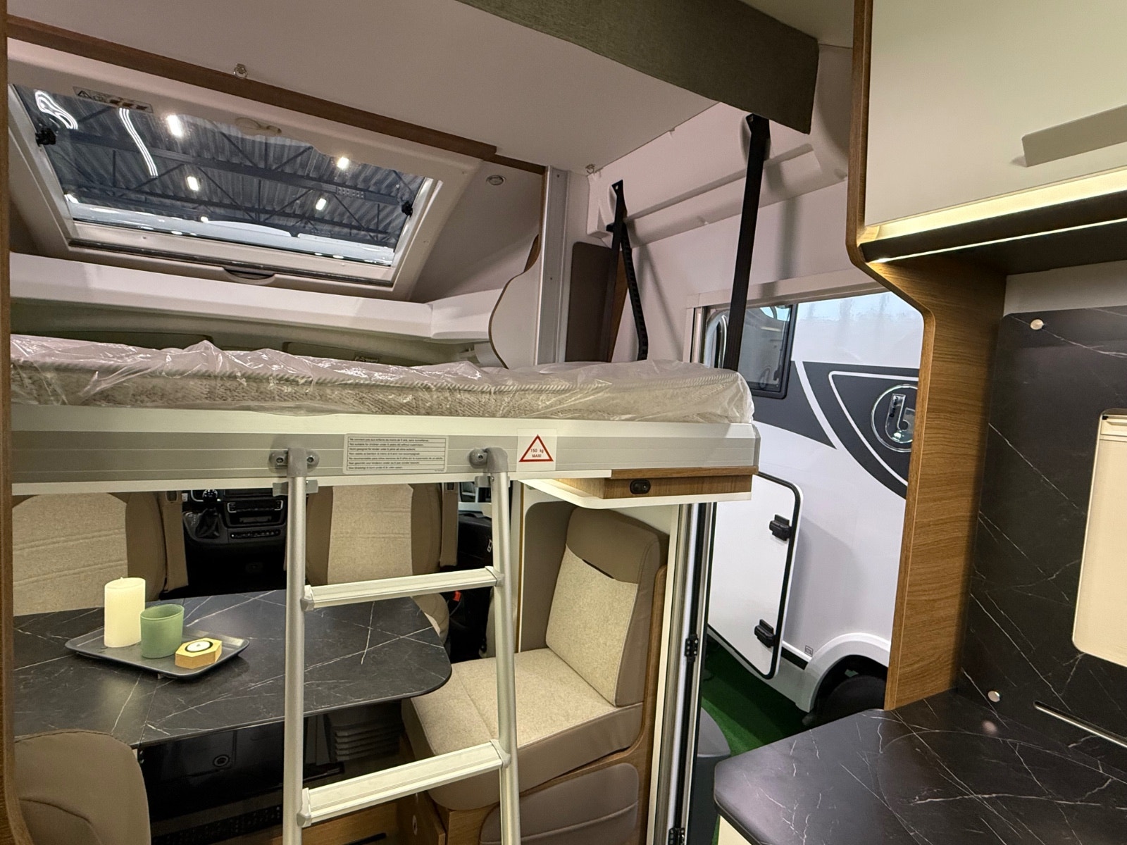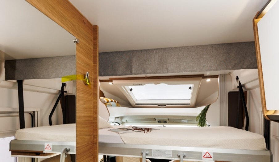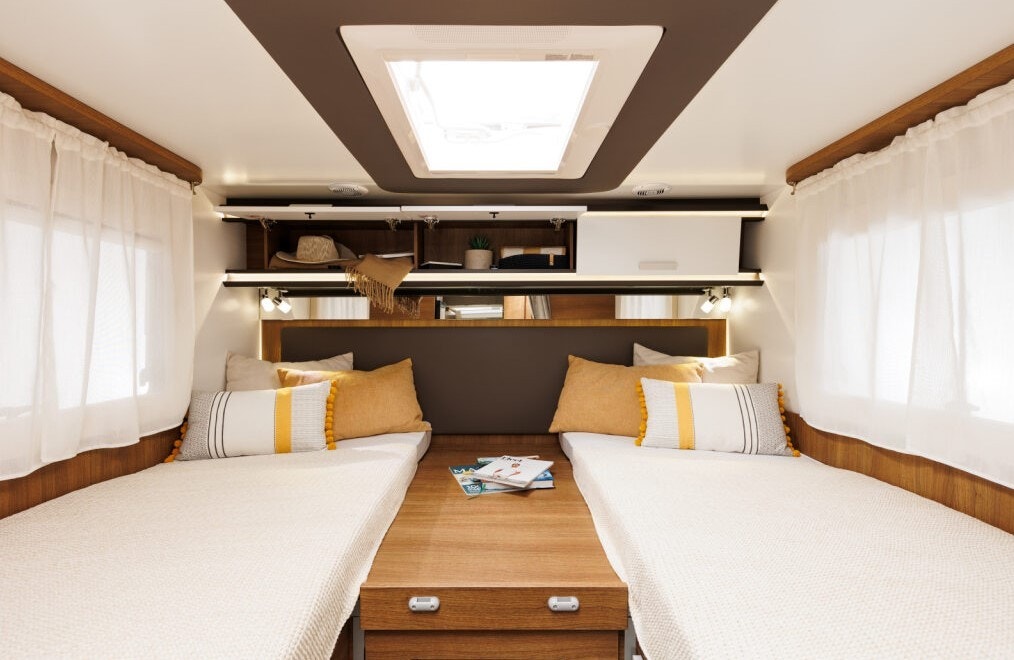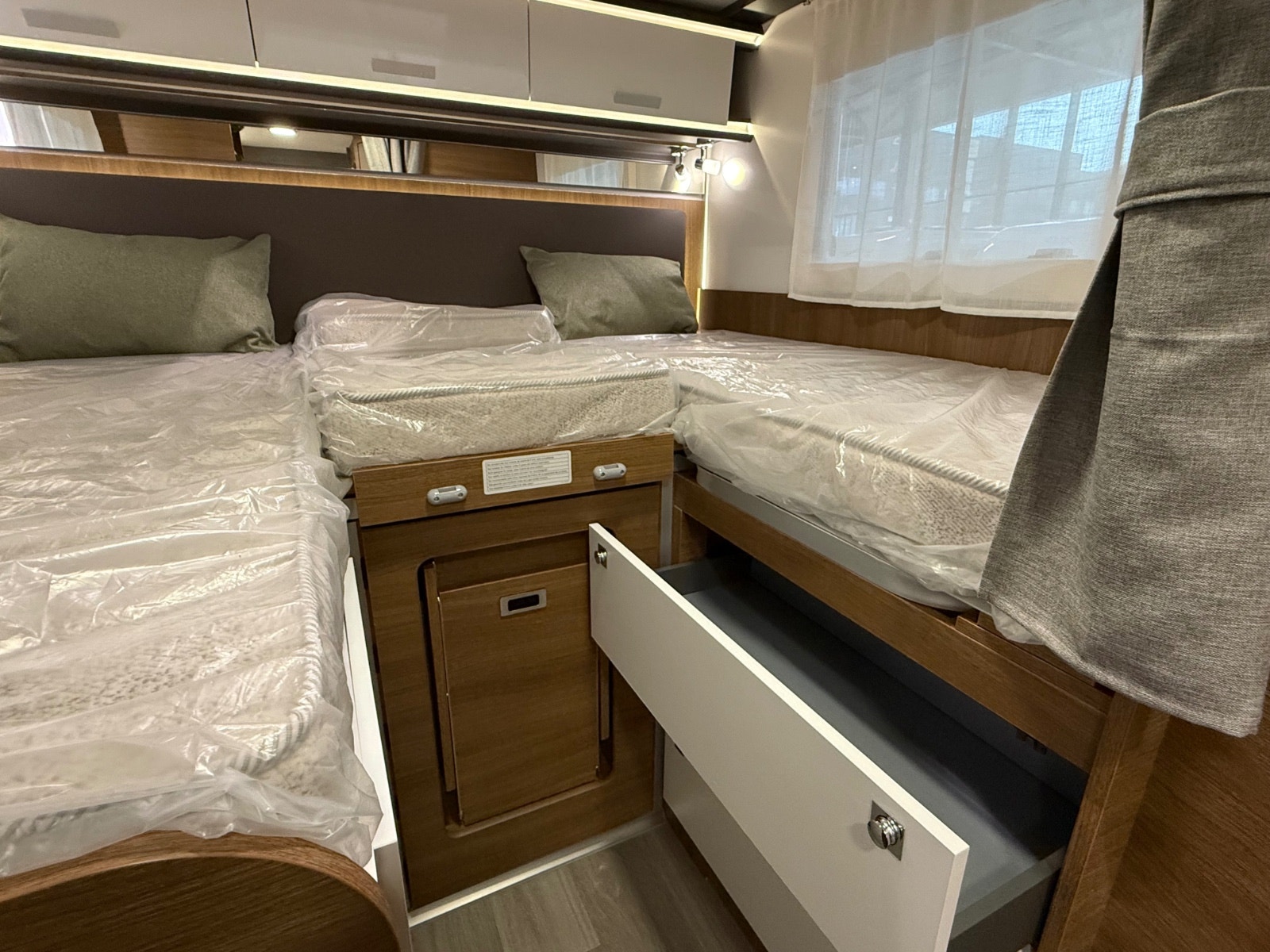 Denne modellen har en svært populær planløsning med to enkle senger bak og elektrisk senkeseng fremme over salong. Sengene bak enkelt transformeres til en dobbel seng! Det er også god lagringsplass under sengen med blant annet tilgang til garasjen.