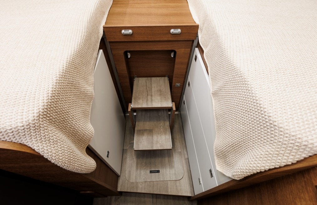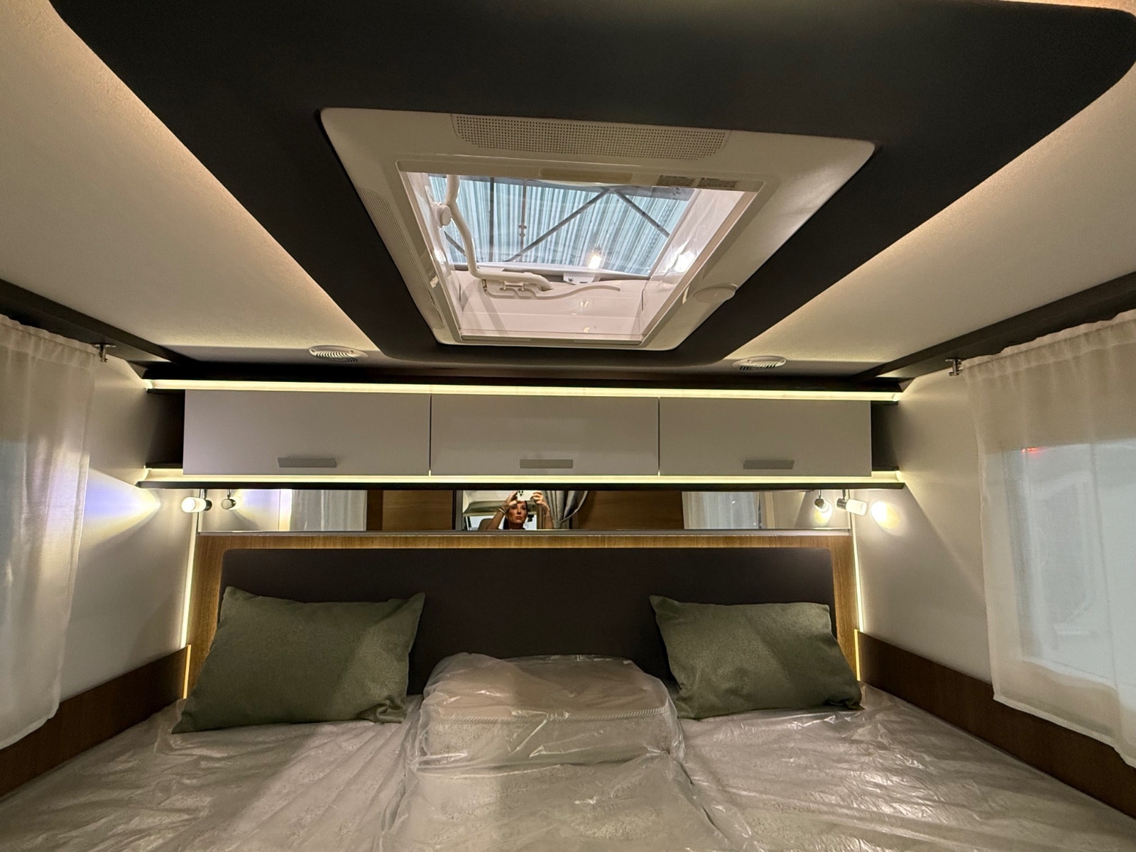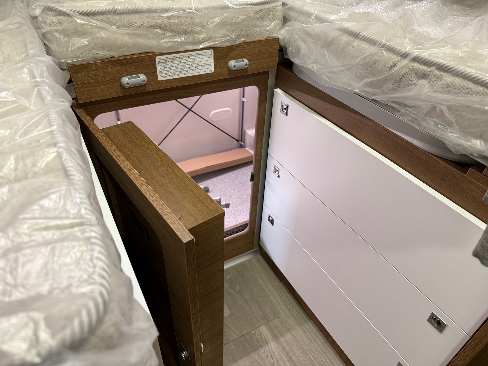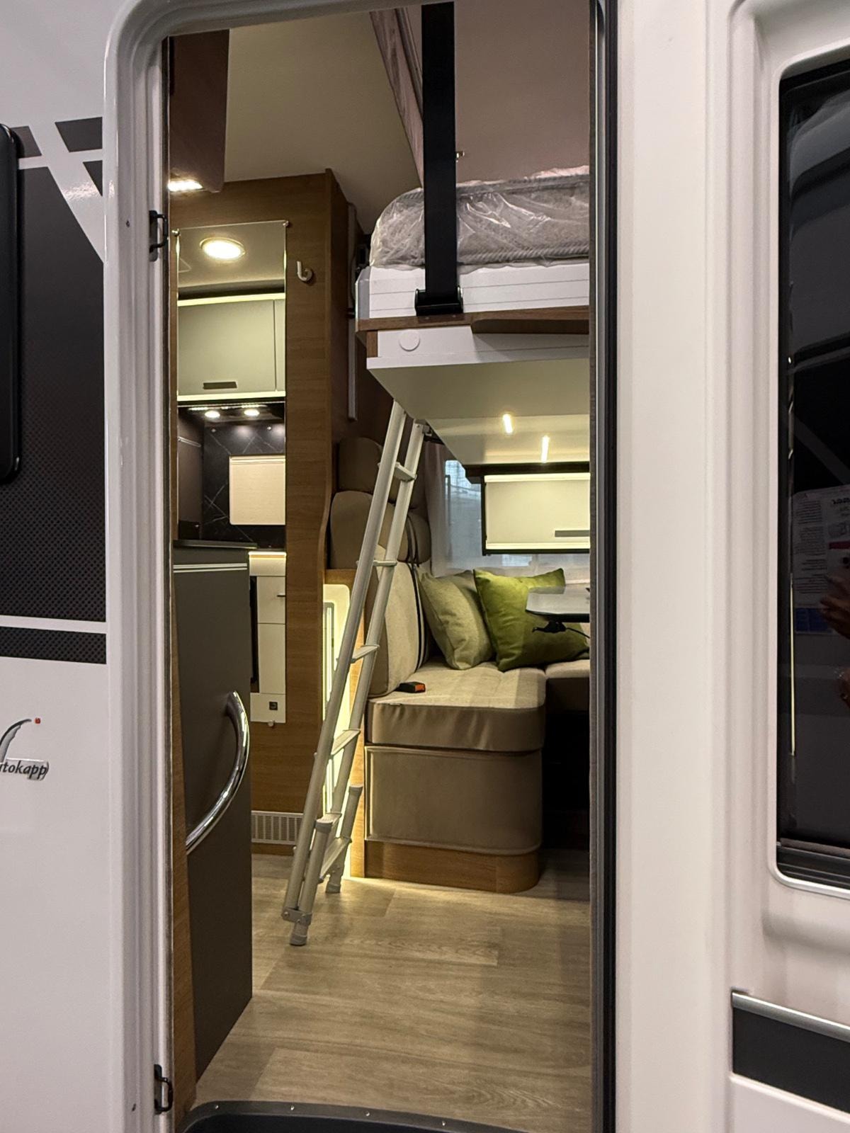 Denne modellen har en svært populær planløsning med to enkle senger bak og elektrisk senkeseng fremme over salong. Sengene bak enkelt transformeres til en dobbel seng! Det er også god lagringsplass under sengen med blant annet tilgang til garasjen.
