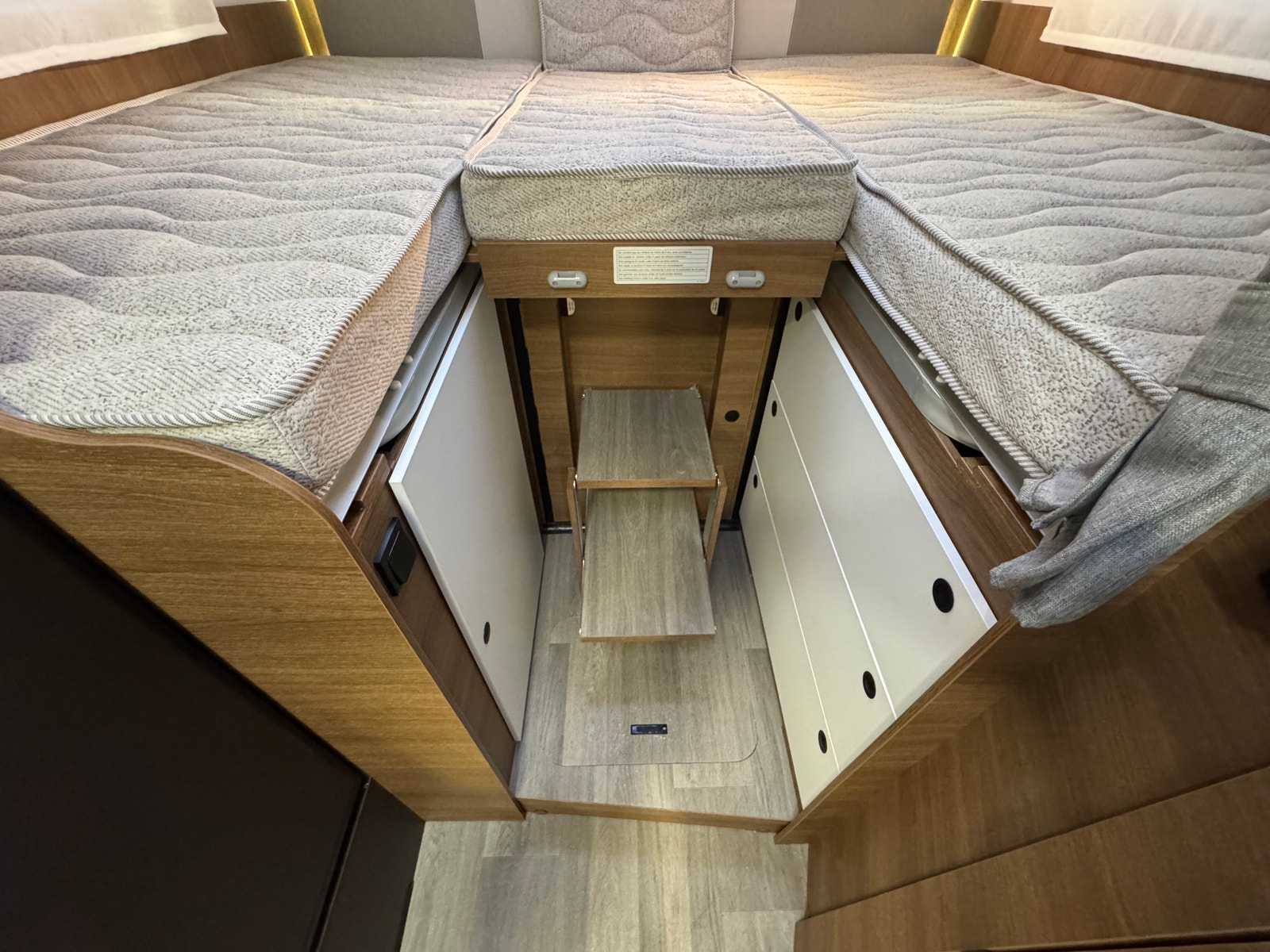Mileo 261 har to enkle senger bak, som lett kan gjøres om til en stor dobbelseng ved å trekke ut plate i midten. Det er også godt med lagringsplass under seng. Med egen inngang til garasje fra innsiden av bilen.