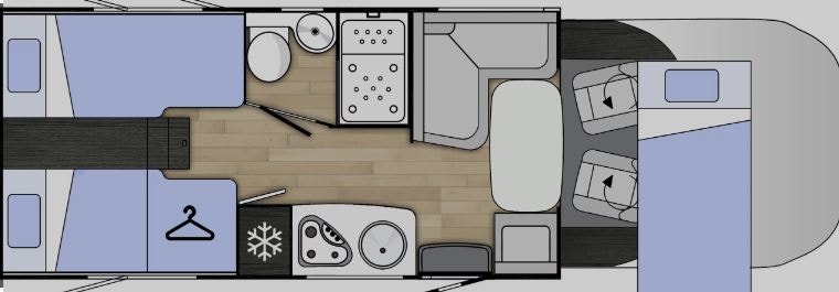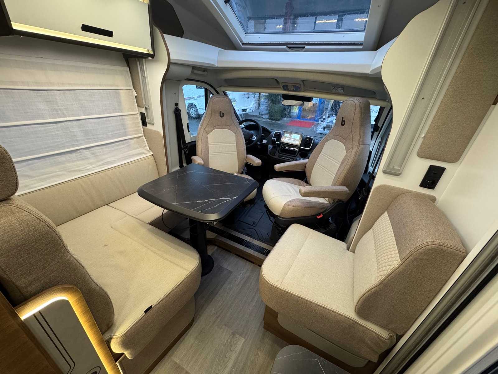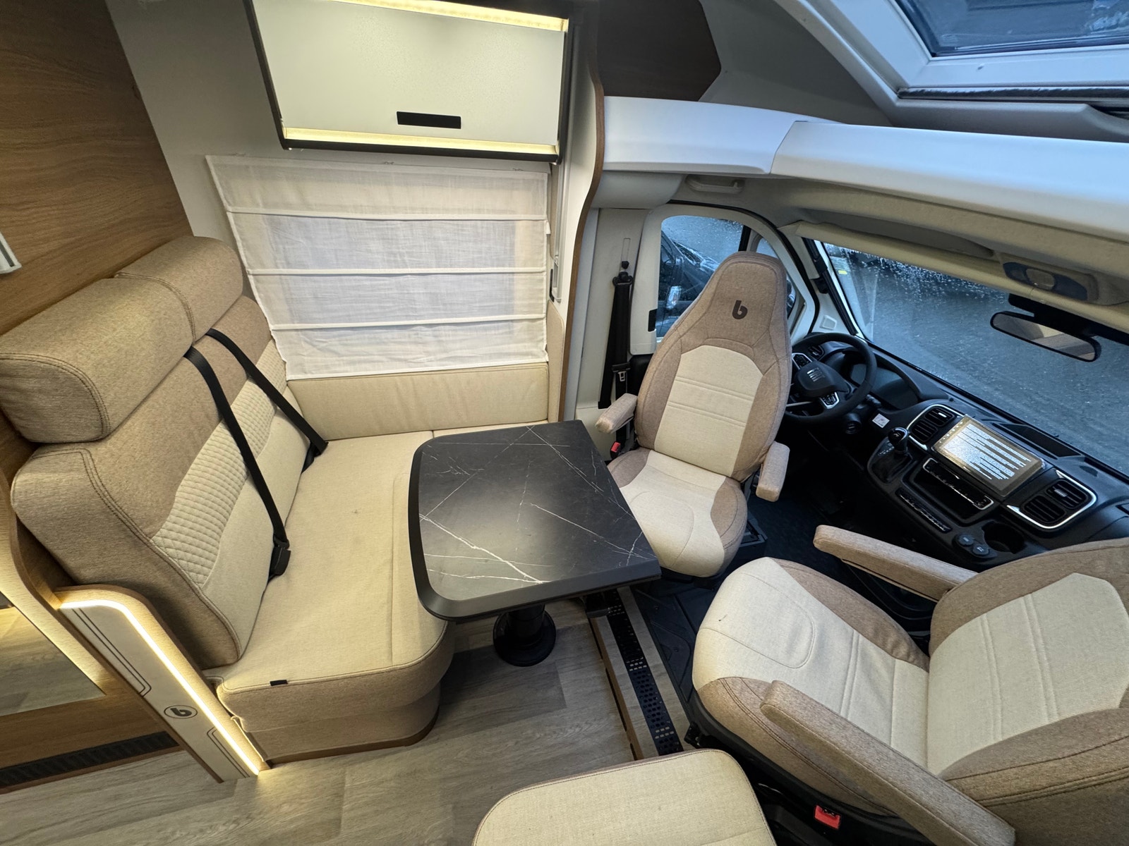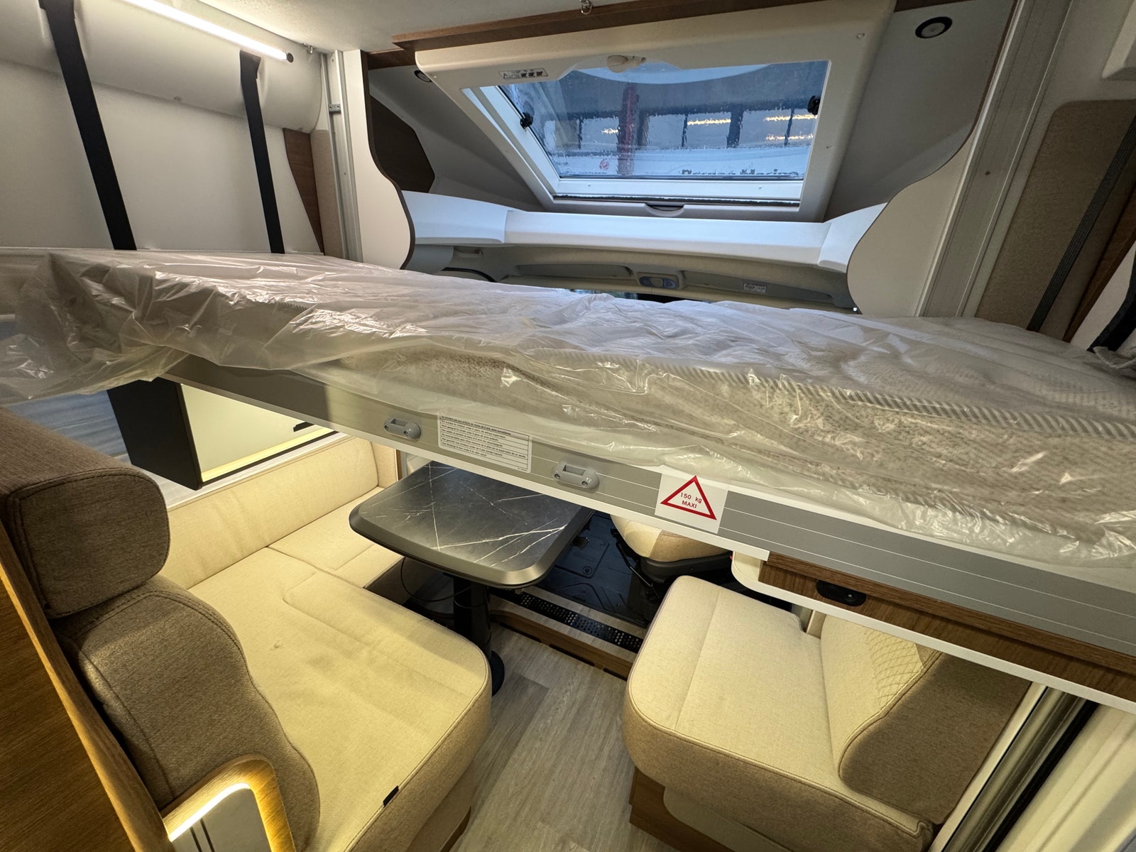Bobilen er registrert for 4, salong er romslig og har 2 vendbare pilotstoler i front i tillegg så har den elektrisk nedsenkbar seng over salong.