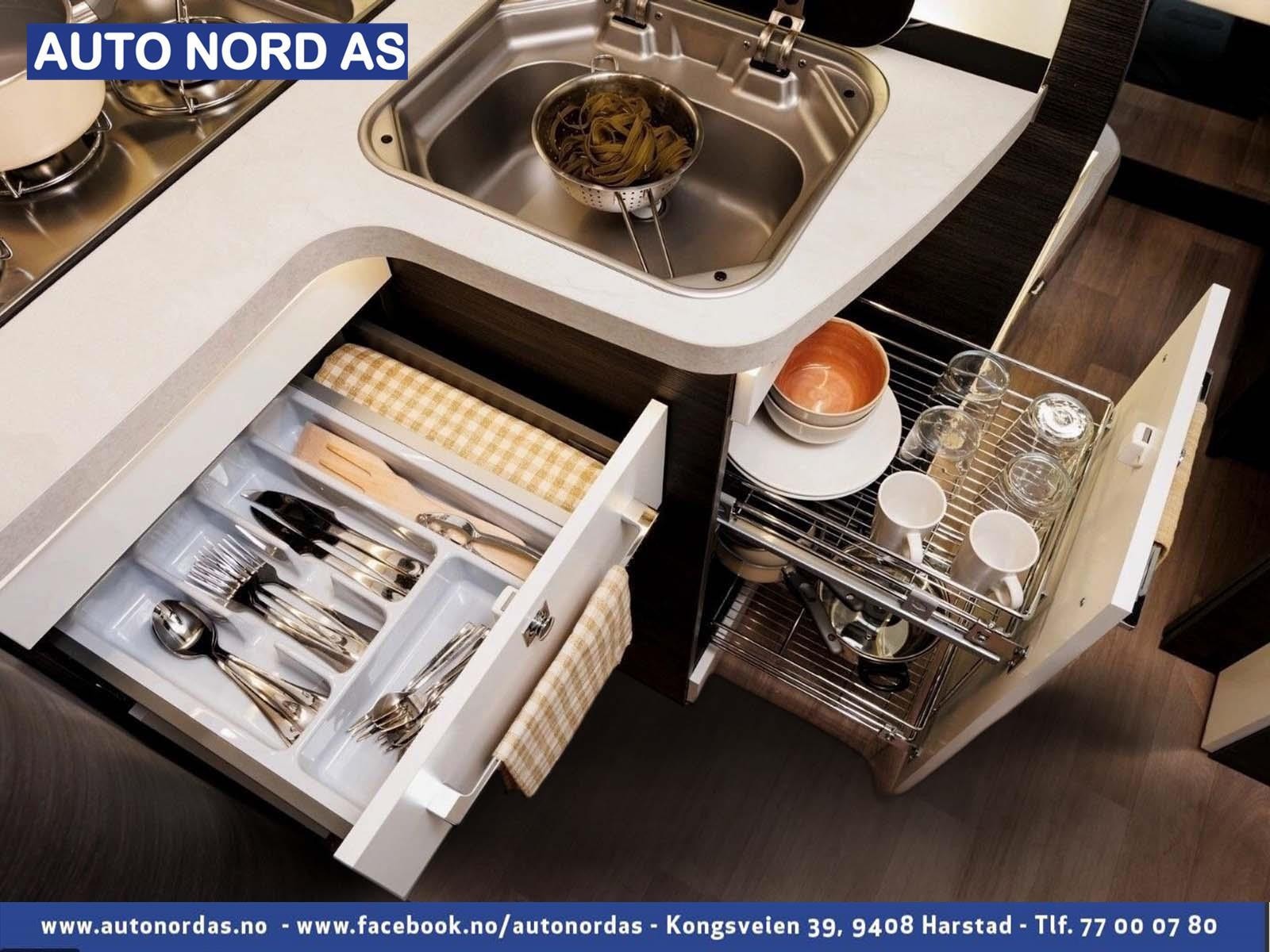 I førerdel har man Aircondition, koppholdere, USB, DAB radio med stor dobbeldin skjerm. Radioen har innebygget CarPlay, som er en smartere og tryggere måte å bruke telefonen i bobilen på, så du kan konsentrere deg om trafikken. Når du kobler telefonen til CarPlay, kan du få veibeskrivelse sving for sving, ringe ut, sende og motta meldinger, høre på musikk med Spotify, ryggekamera, multifunksjonsratt i skinn, Gardiner til formørkning, Regulerbare pilotstoler med armlene, varme i speil og det er også regulerbart ratt. Denne bobilen oppleves nærmest som en flott personbil.