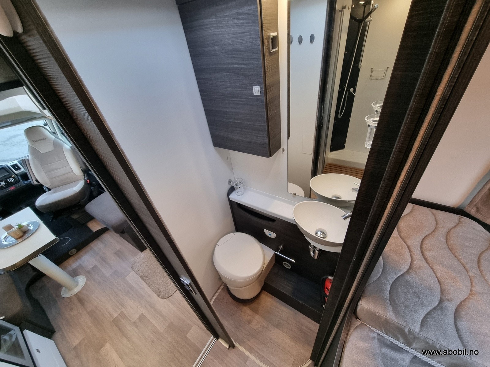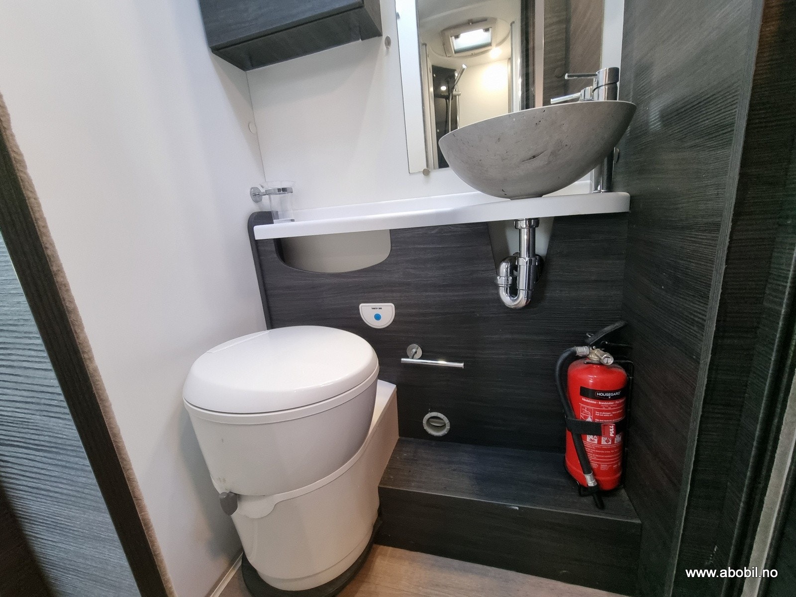 Baderommet er godt utstyrt med separat dusjkabinett med dør og takluke. Praktiske detaljer inkluderer stål ettgreps blandebatteri, svingbart Thetford-toalett, godt med skapplass og LED-belysning. Alt utstyrt med myggnett og formørkningsgardiner.