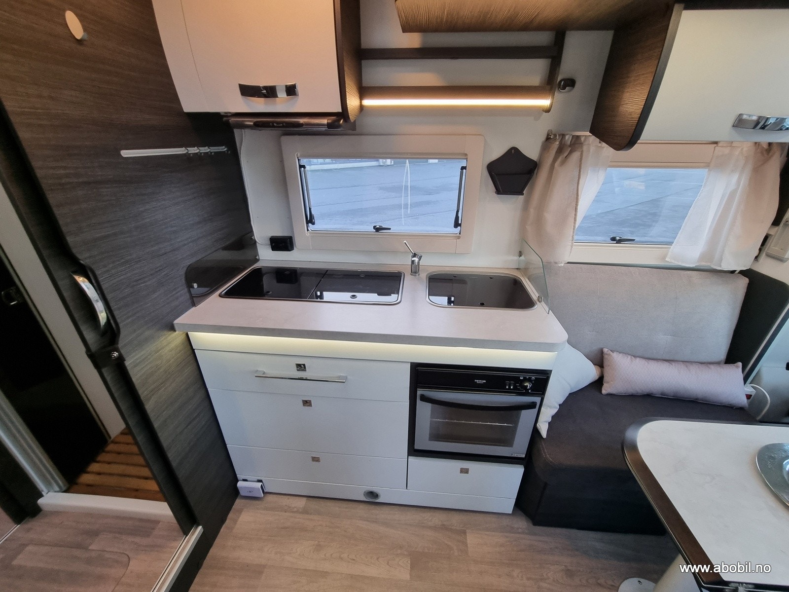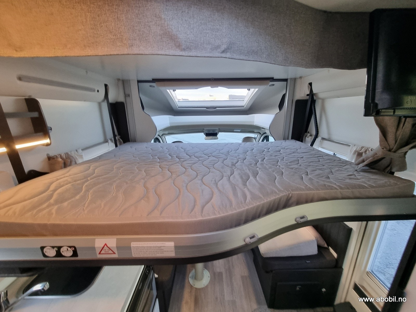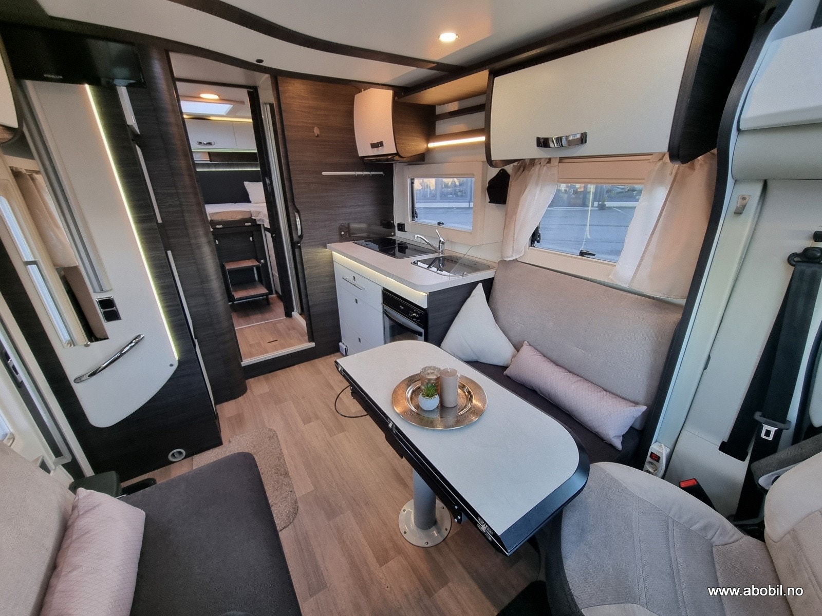 Salongen består av en stor face-to-face sittegruppe med multiregulerbart og svingbart bord. Elektrisk senkeseng over salongen gir ekstra soveplasser, med enkel og rask betjening. Takket være store vindusflater, takluker og panorama glasstak er dette en lys og luftig del av bobilen – perfekt for både måltider og avslapning.
