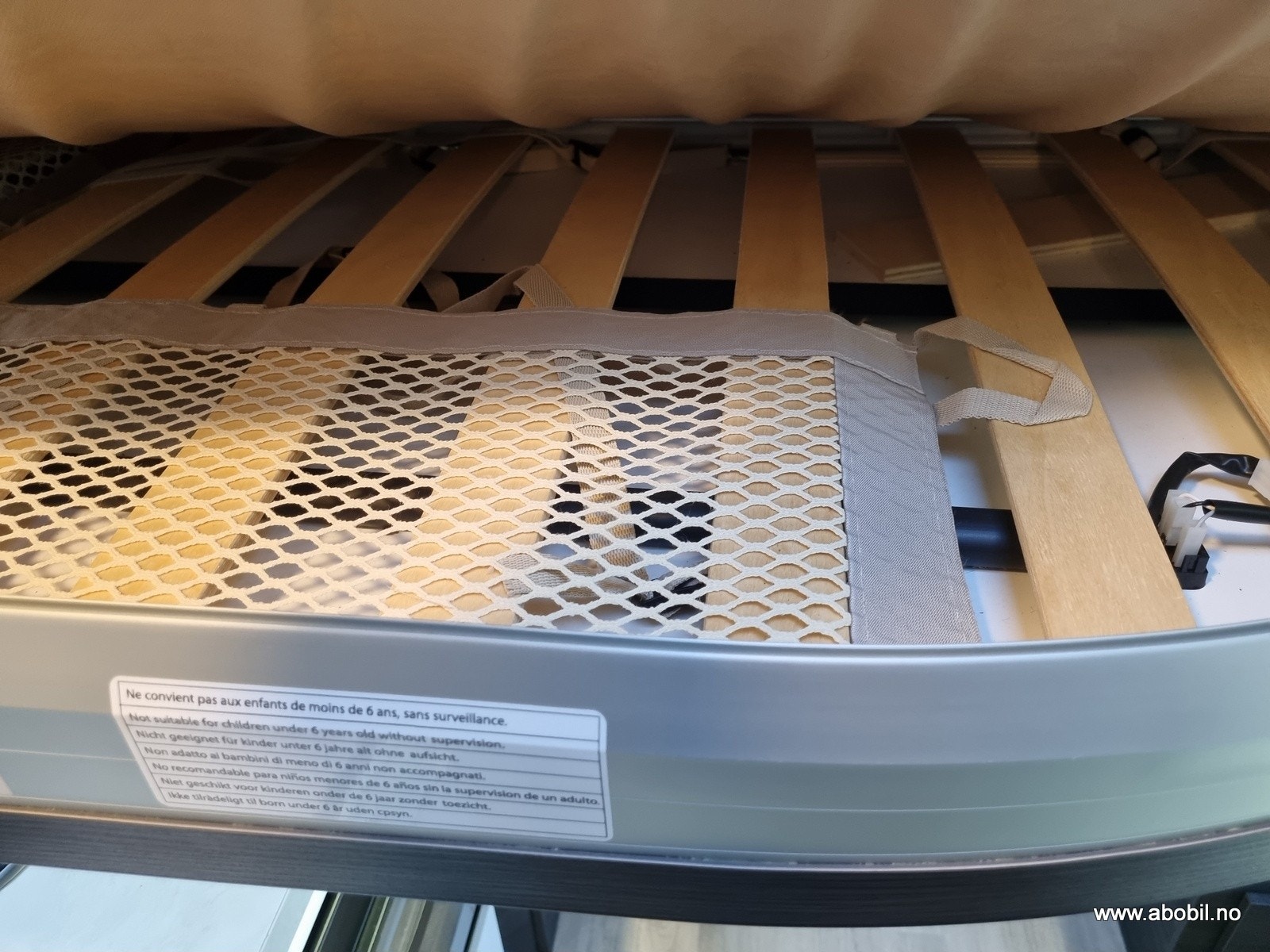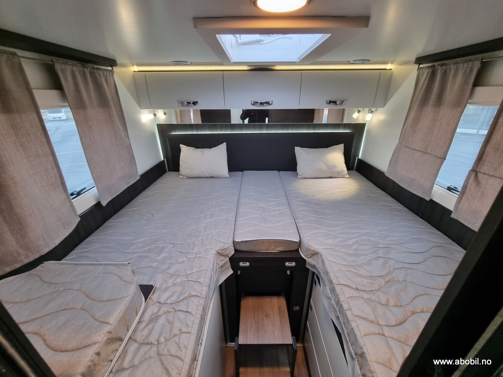 I bakre del finner du to enkeltsenger som enkelt kan omgjøres til stor dobbeltseng. Under sengene er det store lagringsrom med skuffer, i tillegg til uttrekkbart garderobeskap. Over sengene er det overskap med god plass. Egen skyvedør skiller av soverommet for økt komfort og privatliv.