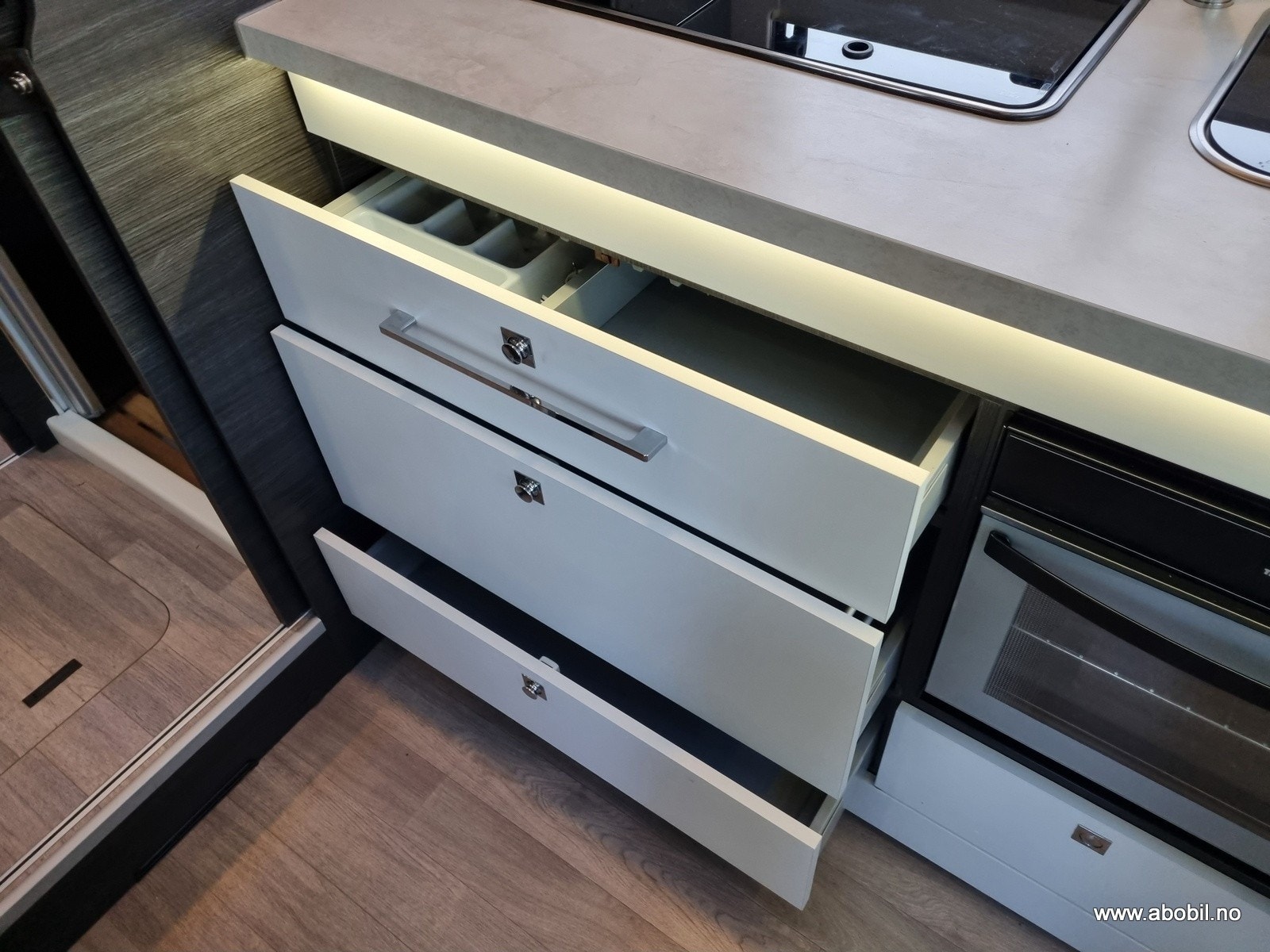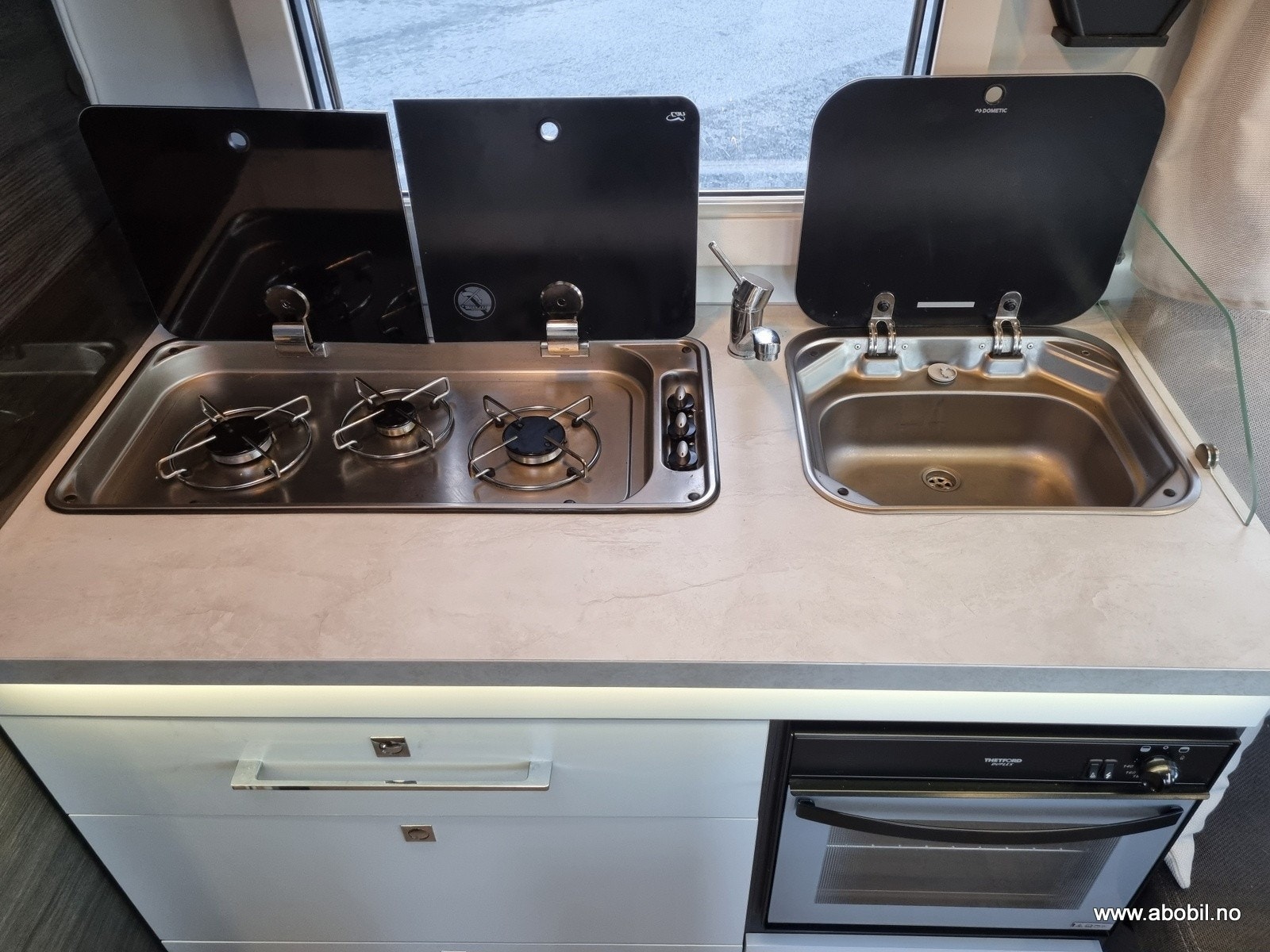 Kjøkkenet har tre gassbluss med elektrisk tenning, kjøkkenvifte og store, stillegående skuffer med selvlukkingsmekanisme. Her er det godt med skapplass, romslig vask og stort automatisk kjøleskap med separat frysedel – inkludert plass til flasker.