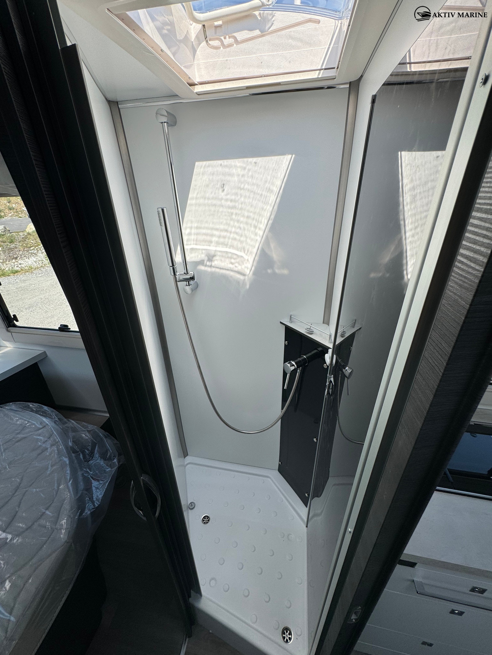 Bak er det midtstilt dobbelseng og godt med skapplass. Det er separat toalett og dusj og mulighet for å lukke igjen dør frem mot kjøkken. Det er også skyvedør fra soverom og inn mot bad/toalett. Perfekt bil for opptil 4 personer.