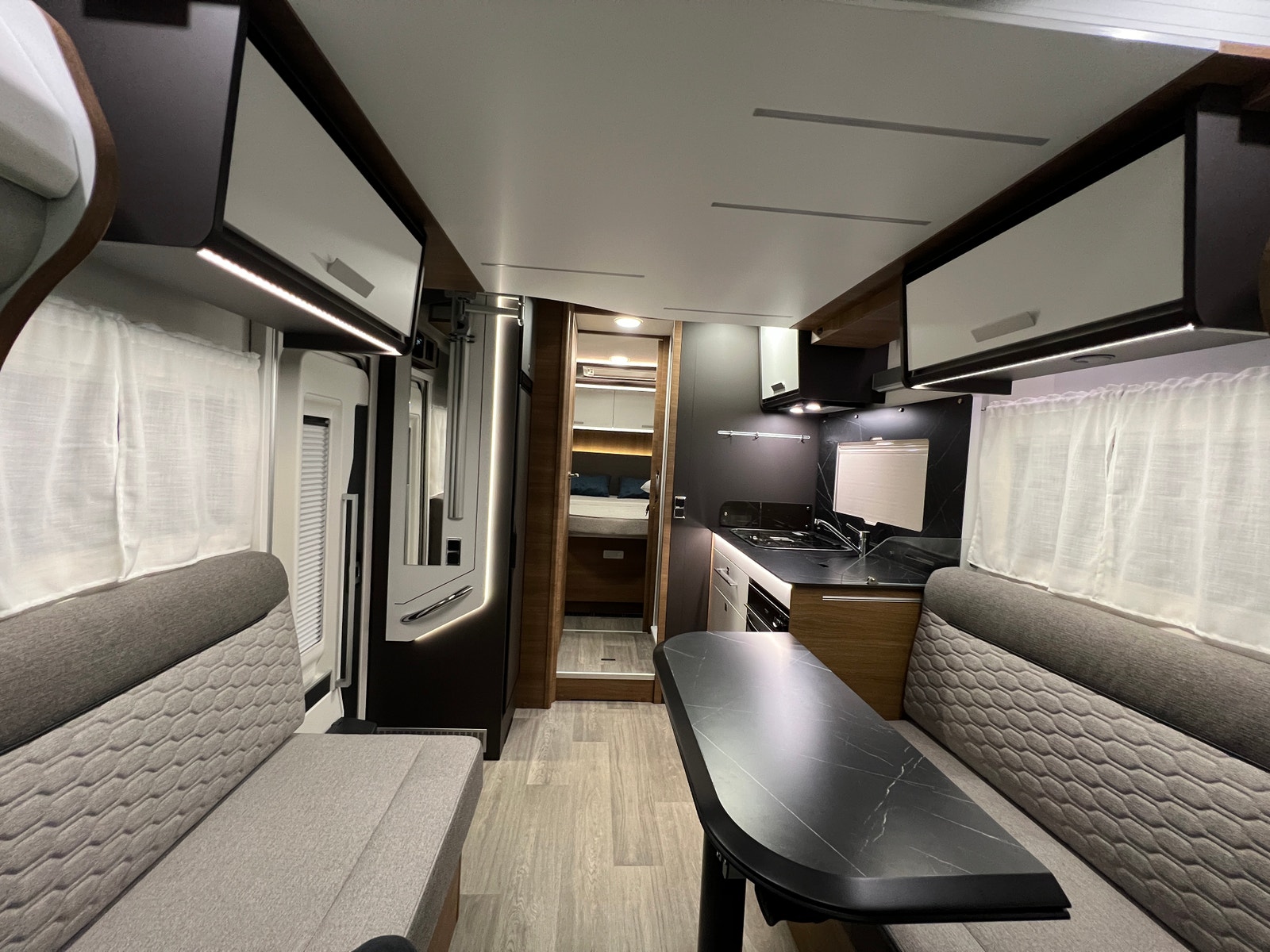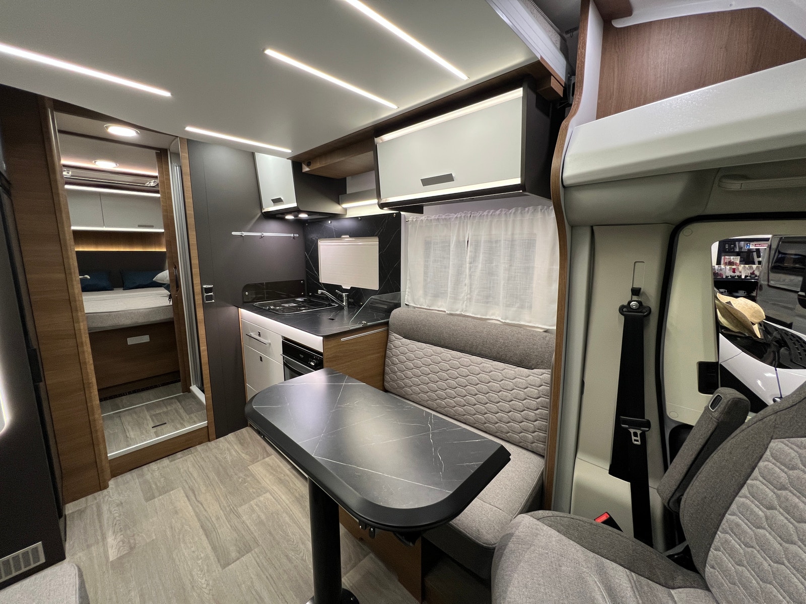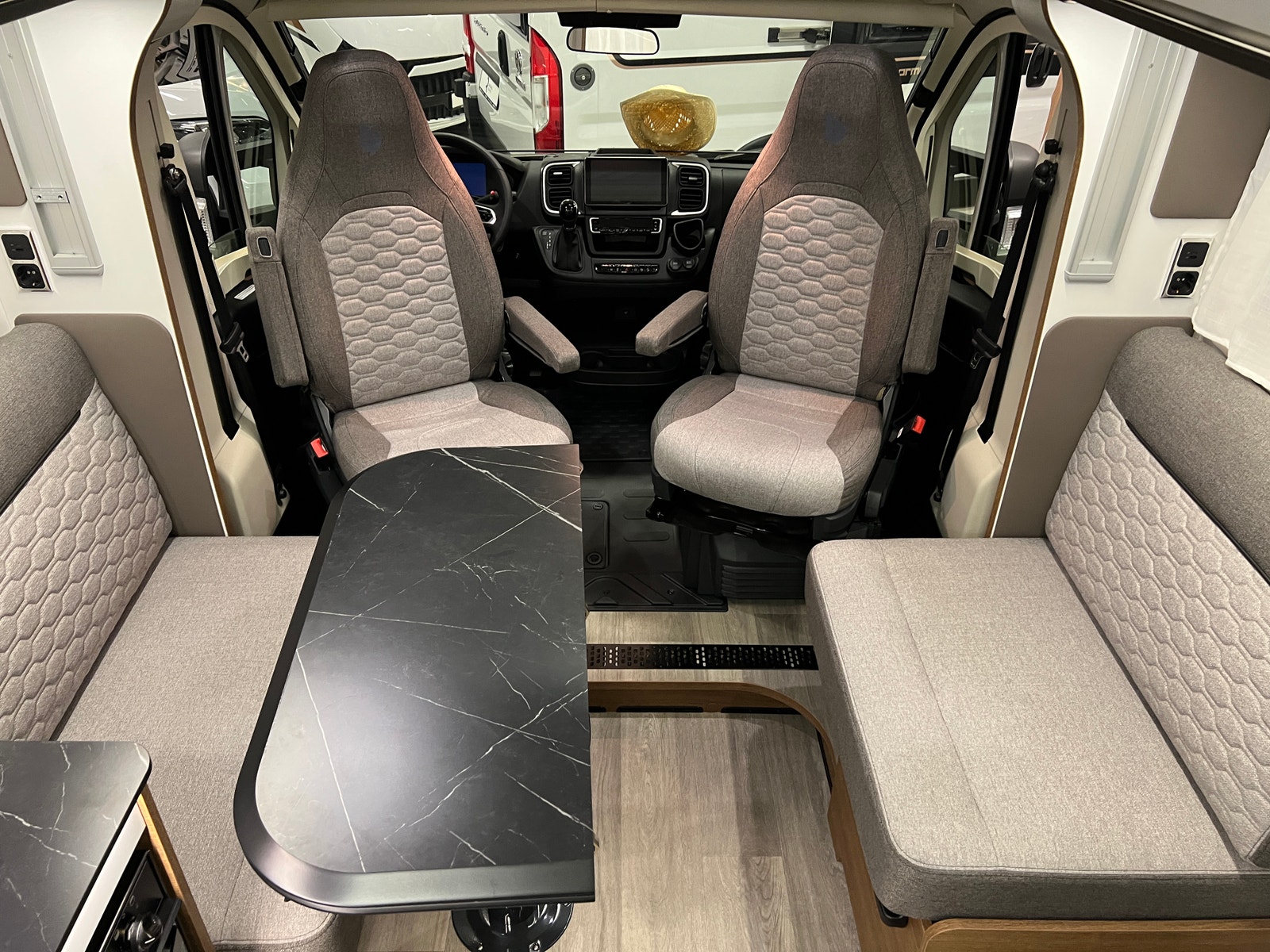 I front har du en svært romslig salong med face to face sittegruppe, hvor du og har et stort bord som du kan gjøre større etter behov, og med ett grep svinges/flyttes i ønsket posisjon.